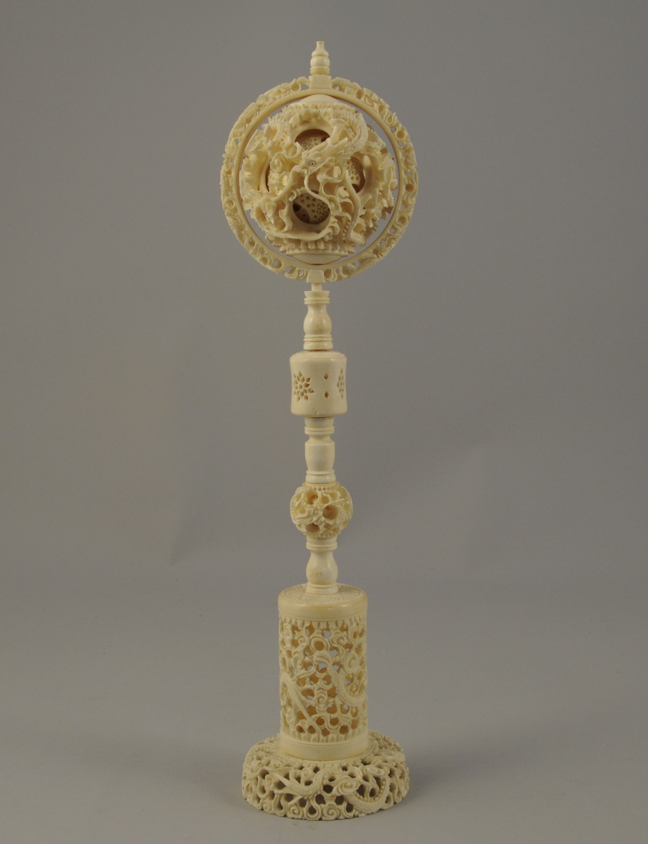 BOULE DE CANTON en ivoire sculpté à motifs de dragons et d'étoiles composée de douze sphères armillaires encastrées, sur un piétement en ivoire tourné, ajouré et sculpté (trois éléments).