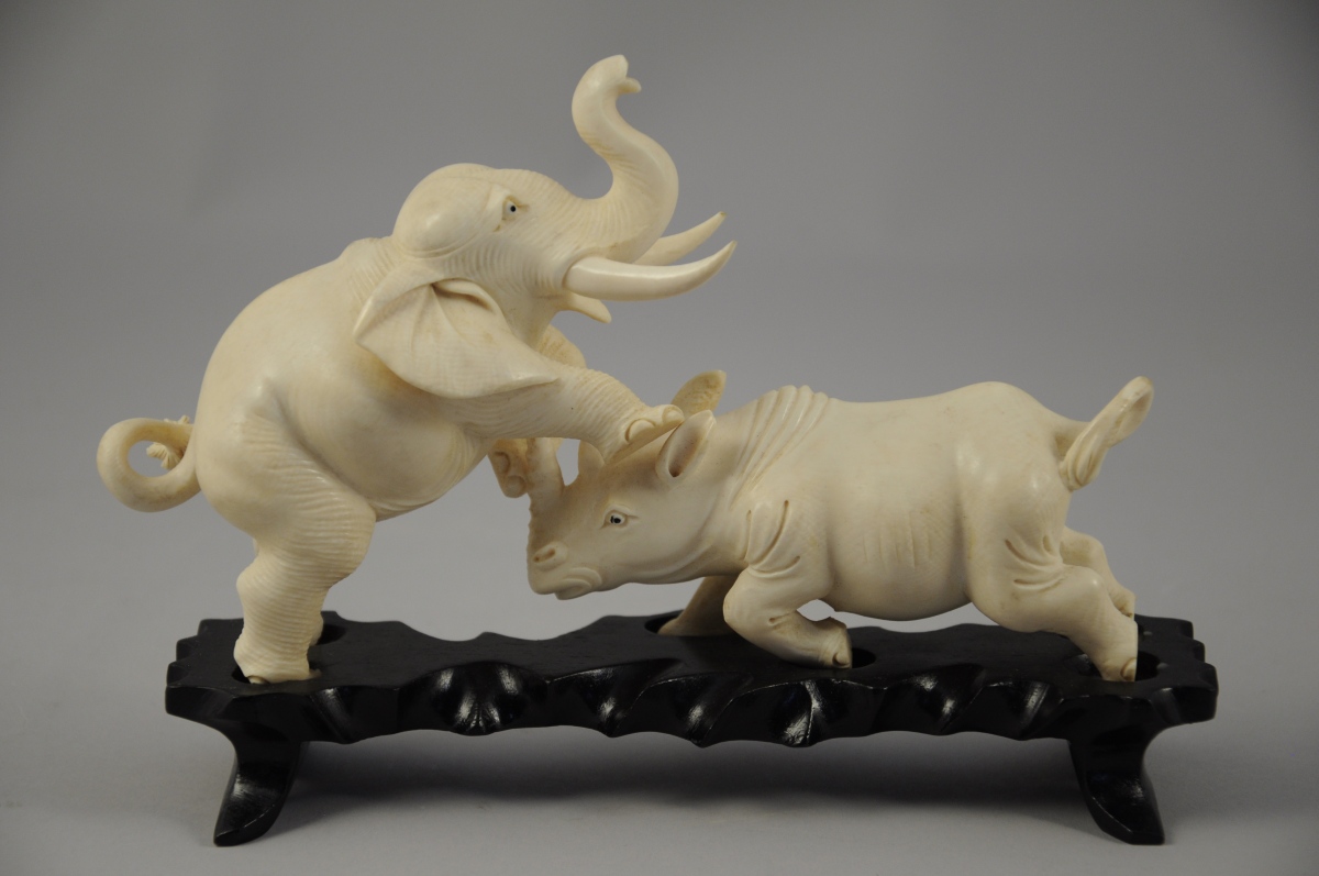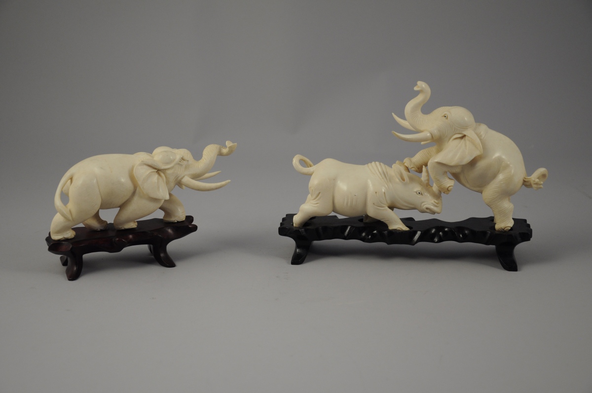 OKIMONO. ÉLÉPHANTS ET RHINOCÉROS. 2 groupes en ivoire sculpté représentant deux éléphants luttant contre un rhinocéros.