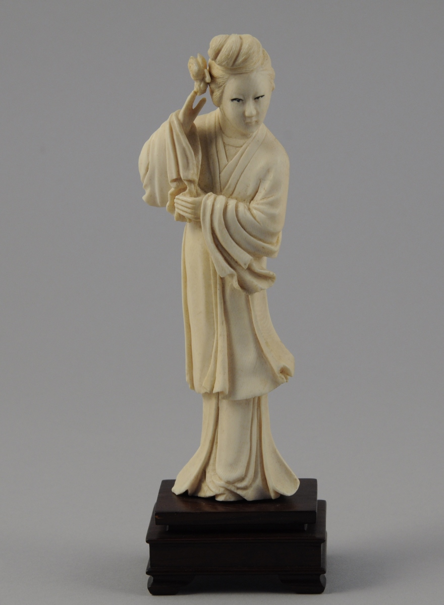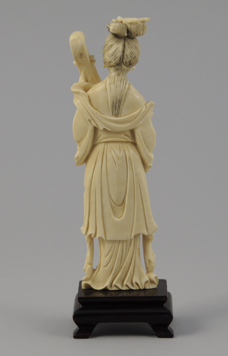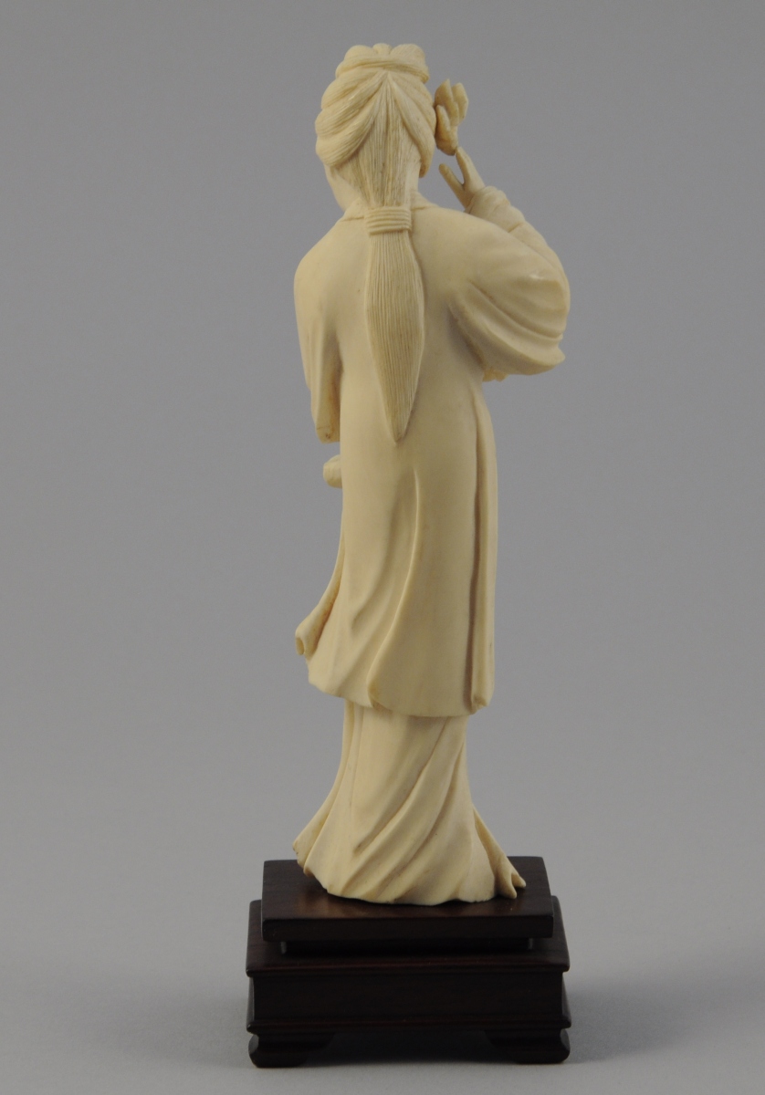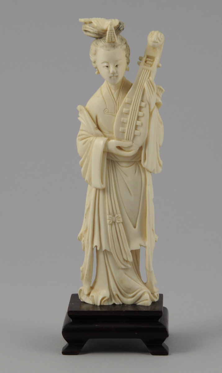 OKIMONO. 5 PERSONNAGES. 3 dames de cours en ivoire/ivoirine sculpté (à la fleur, à l'instrument de musique et à l'ombrelle), 1 lettré et 1 Bouddah.