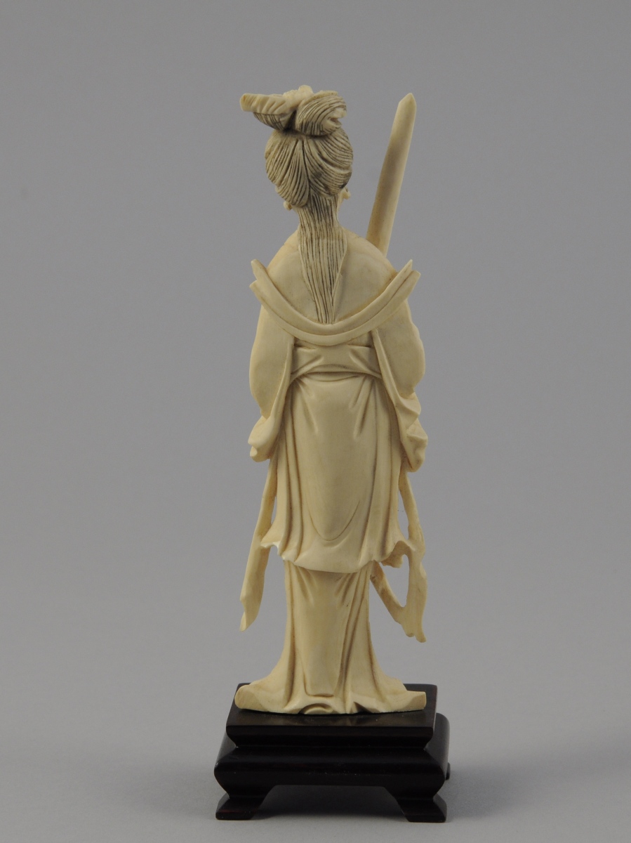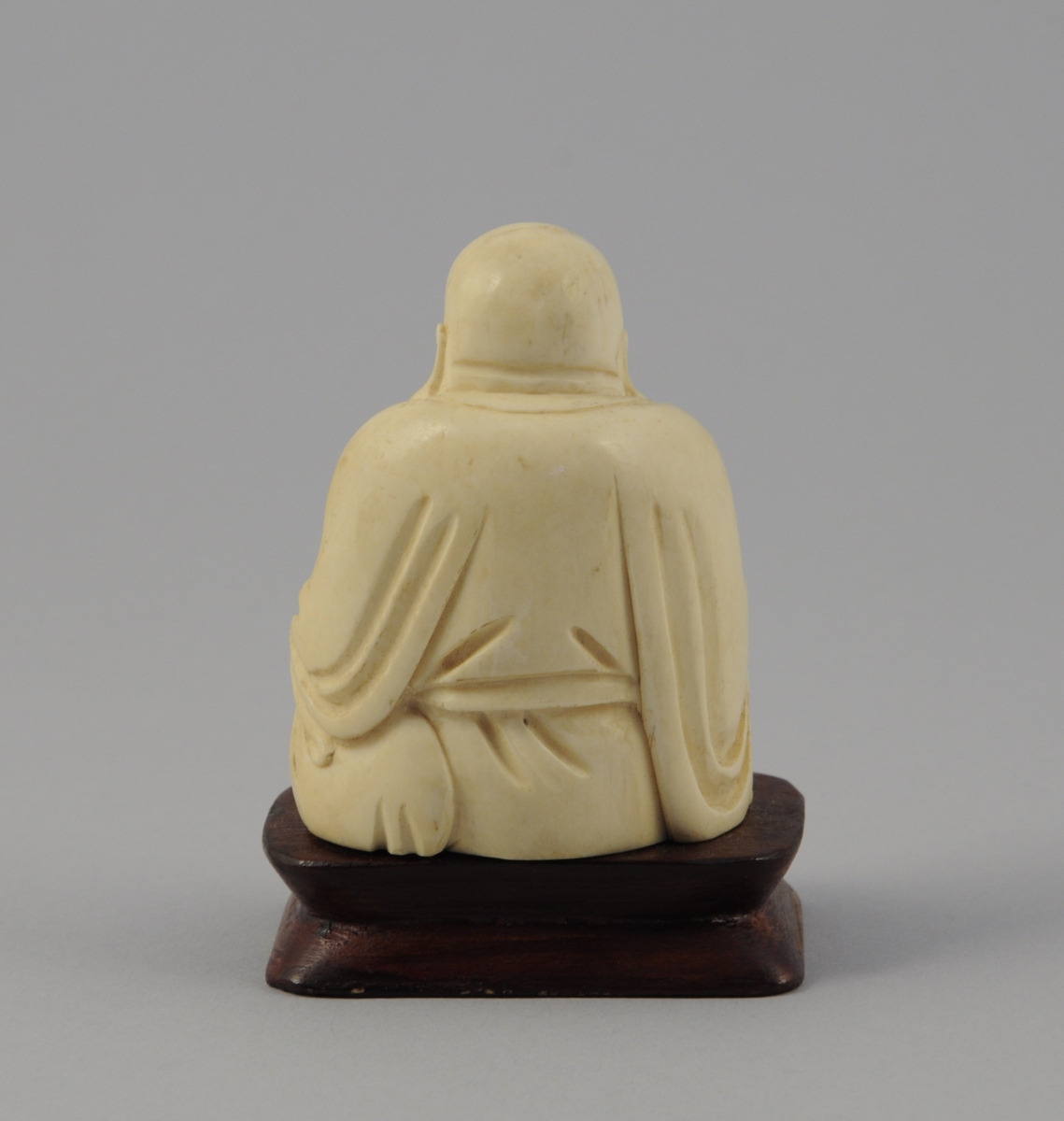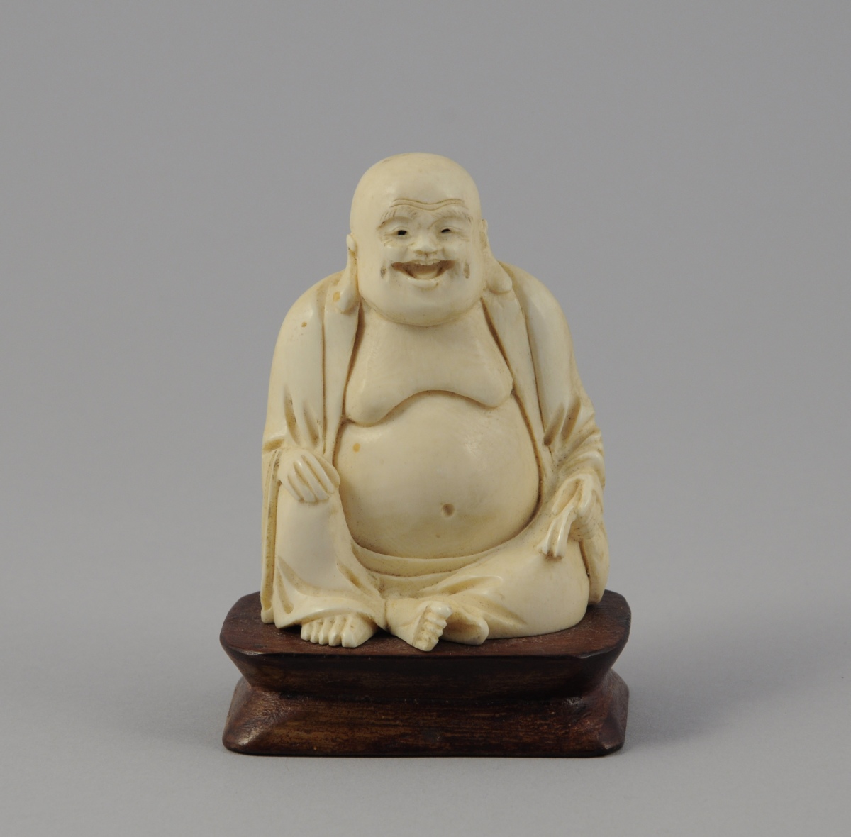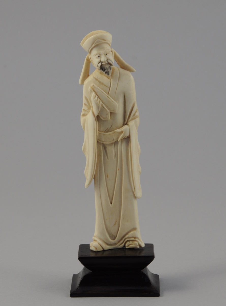 OKIMONO. 5 PERSONNAGES. 3 dames de cours en ivoire/ivoirine sculpté (à la fleur, à l'instrument de musique et à l'ombrelle), 1 lettré et 1 Bouddah.
