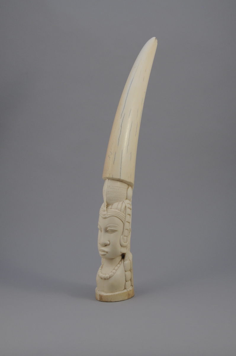 PAIRE de DÉFENSES d'éléphant en ivoire sculptées d'un buste de femme..