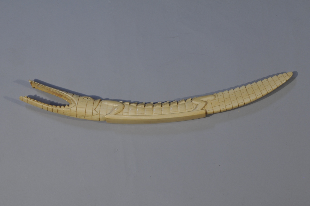 DÉFENSE d'éléphant en ivoire sculptée en crocodile.