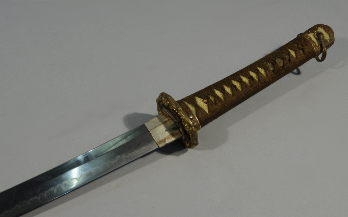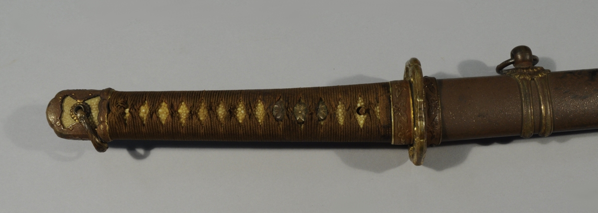 SHIN GUNTO d'officier japonais. Poignée gaînée de galuchat à gros grain recouvert d'un tressage. Lame à ligne de trempe. Fourreau en fer peint à un anneau de bélière.