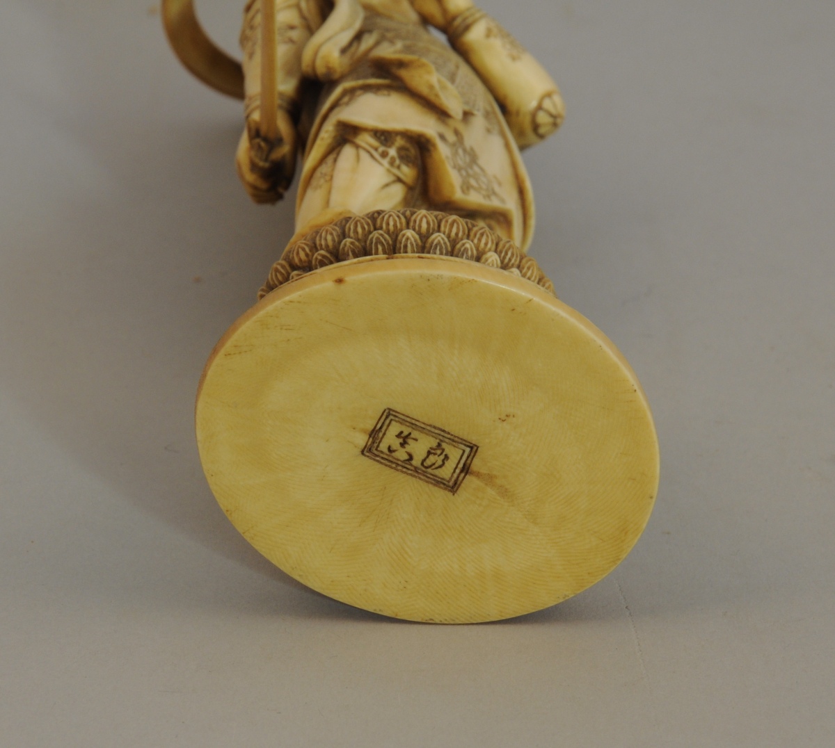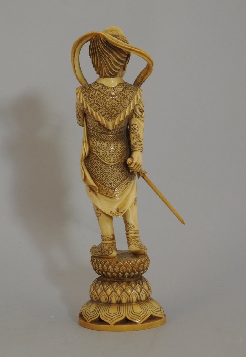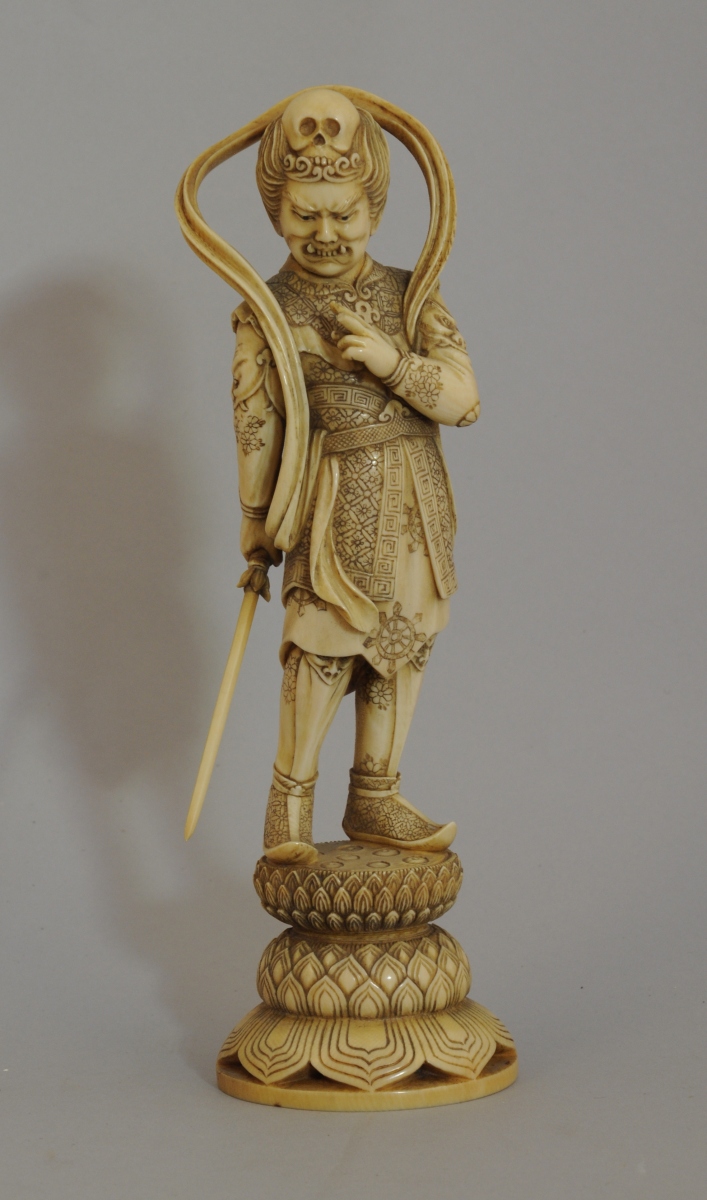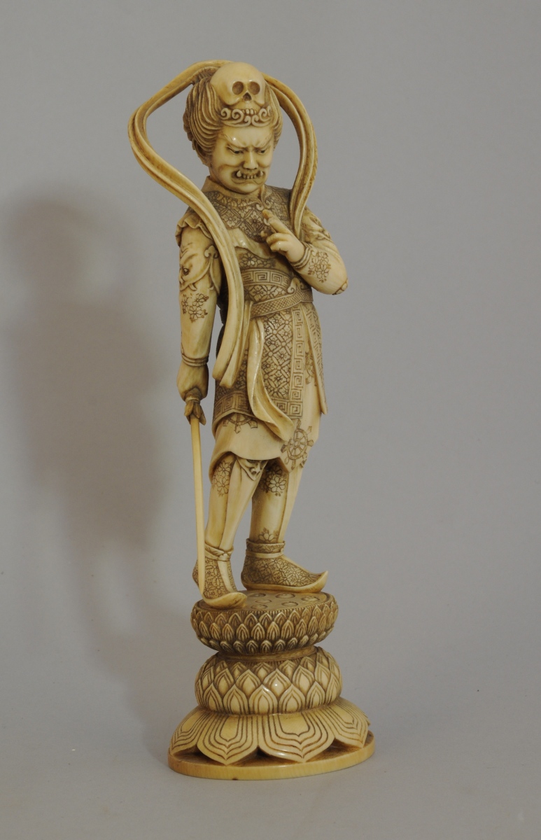 STATUETTE en ivoire sculpté figurant un personnage du théâtre Nô. Coiffé d'un crâne, sa bouche est pourvue de crocs et ses membres d'un masque monstrueux. Il tient un sabre de la main droite et repose sur une fleur de lotus.