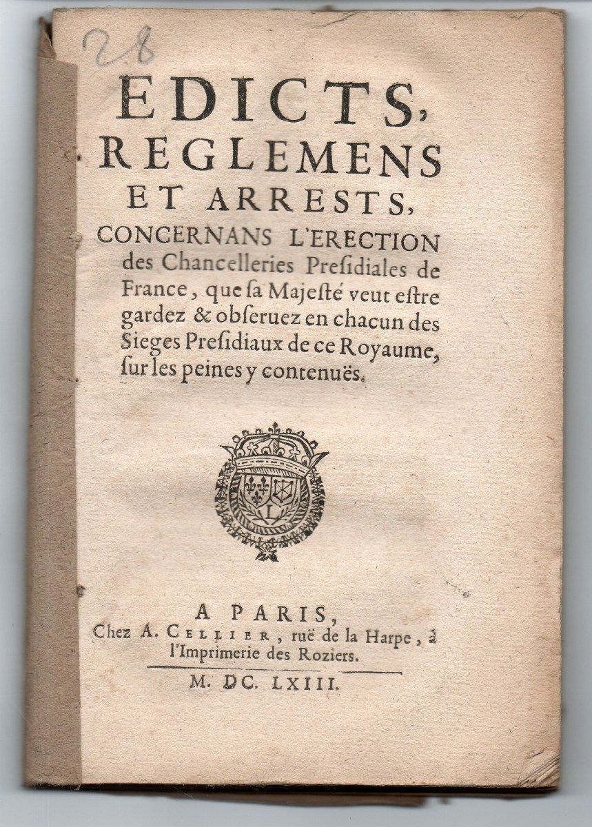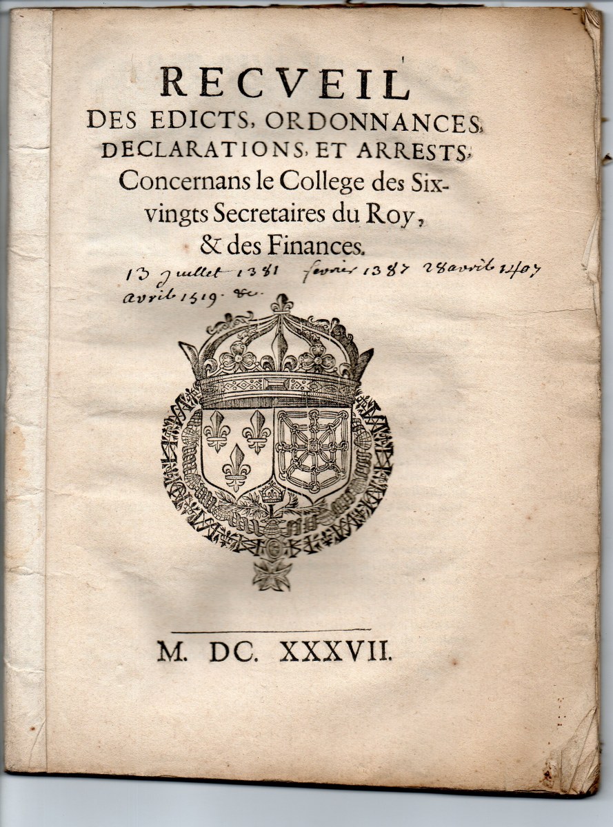 A Paris, 1623, 36 pp., in-8 - Edict de creation en tiltre d'office formé de cent conseillers & secrétaires ordinaires de la chambre du roy. 1623, 36-1 pp., in-12 - Edict du roy portant augmentation sur le seau des lettres qui se scellent en la chancellerie de France, 10 mars 1631. A Paris, par Antoine Estiene, P. Mettayer & C. Prevost, 1631, 15 pp., in-12 - Recueil des edicts, ordonnances, declarations, et arrests concernans le college des six vingts secretaires du roy & des finances. 1637, 70 pp., in-4 - Arrest du grand conseil en faveur de messieurs les conseillers secretaires du roy portant deffences aux asseeurs & collecteurs des tailles de les imposer eux ny leurs terres à la taille, 13 juin 1650, A Paris, chez P. Rocolet, 1650, 7 pp., in-8 - Déclaration du roy pour l'observation des reglemens des chancelleries de ce royaume, avec deffenses aux cours souveraines & autres juges, de recevoir aucuns officiers sans lettres de provision de Sa Majesté, scellées du grand sceau