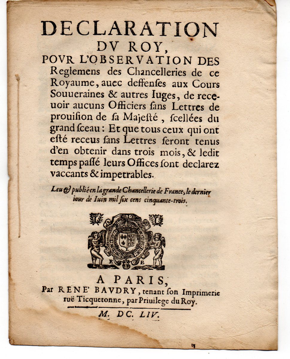 A Paris, chez A. Cellier, 1663, 97 pp., in-12 - Mémoire de ce qu'il convient faire par les récipiendaires en la charge de conseiller & secrétaire du roy, Maison, Couronne de France & de ses Finances, du college des deux cens quarante. 1674, 5 pp., in-8 - Arrest de reglement du conseil privé du roy entre les conseillers secrétaires de Sa Majesté & les referendaires de la chancellerie près le parlement de Paris