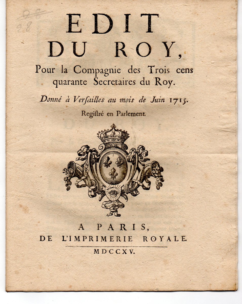1704, 4 pp., in-8 - Edit du roy pour la compagnie des trois cent quarante secretaires du roy, juin 1715. A Paris, de l'imprimerie royale, 1715, 12 pp., in-8 - Edit du roy concernant les offices de gardes des sceaux, gardes-scels, audienciers, controlleurs & secretaires des chancelleries des cours,