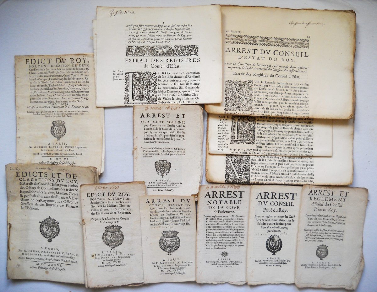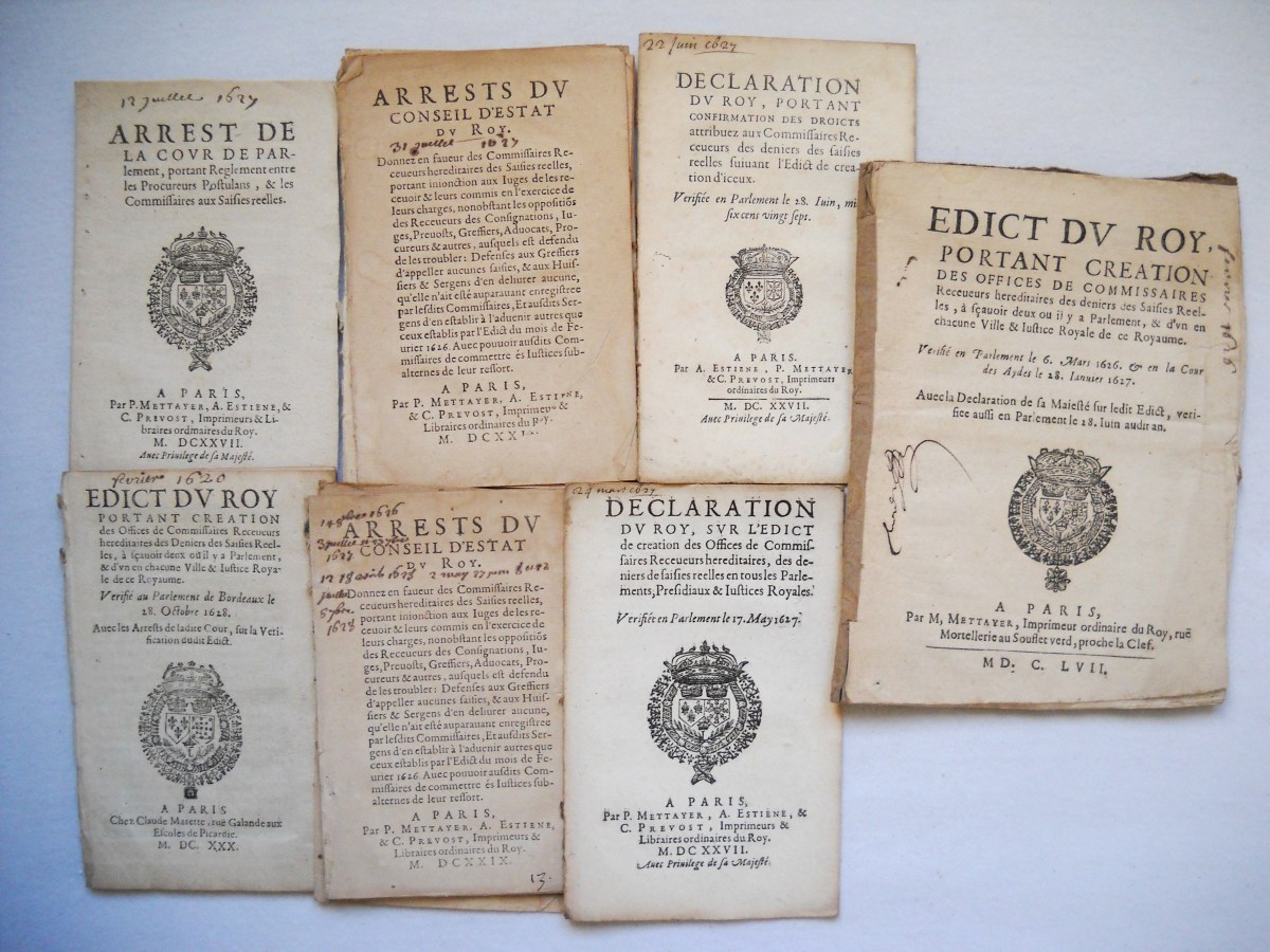 [OFFICES ROYAUX] - Lettres patentes, édits, déclarations, ordonnances, arrêts du conseil d'état du roi, arrêts de la cour de parlement, et divers, relatifs aux offices royaux.