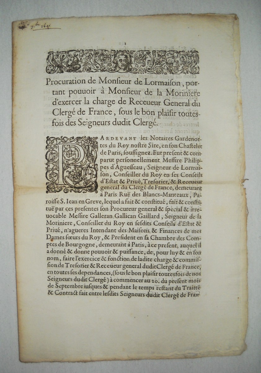 A Paris, chez la veuve François Muguet, 1710, 4 pp., in-4 - Contrat fait & passé le 12 décembre 1726 entre le clergé de France & Messire François Ollivier de Senozan [