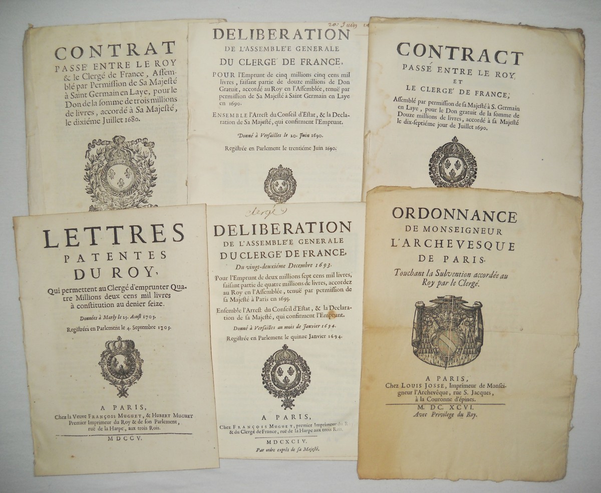 Frederic Leonard, 1690, 15 pp., in-8 - Ordonnance de monseigneur l'archevêque de Paris touchant la subvention accordée au roy par le clergé. A Paris, chez Louis Josse, 1696, 4 pp., in-4 - Liste des seigneurs qui composent l'assemblée générale du clergé de France