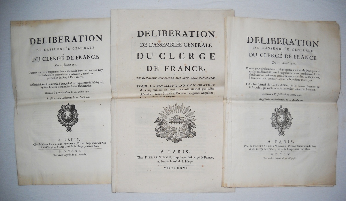 ] receveur general dudit clergé, le 16 décembre 1625. A Paris, par Antoine Estiene, 1626, 16 pp., in-12 - Idem pour 1636, 1657, 1661, 1666, 1685 - Contract faict et passé entre le roy & le clergé de France, assemblé par permission de Sa Majesté en la ville de Paris, le 11 février 1626. A Paris, par Antoine Estiene, 1626, 28 pp., in-12 - Idem pour 1628, 1636, 1657, 1675, 1680, 1690, 1711, 1726 - Délibération de l'assemblée générale du clergé de France pour l'emprunt de cinq millions cinq cens mil livres, fisant partie de 12 millions de don gratuit accordé au roy en l'assemblée