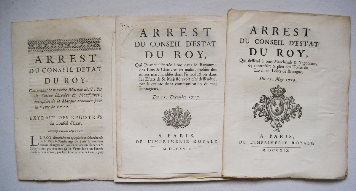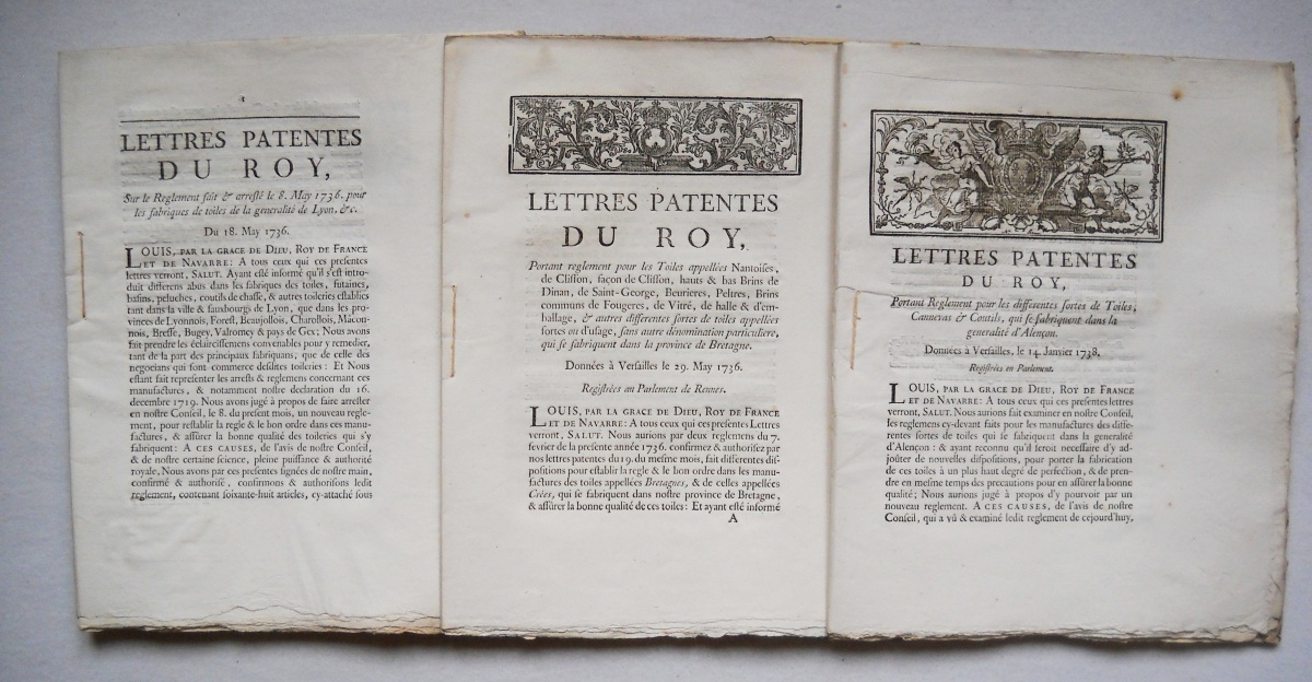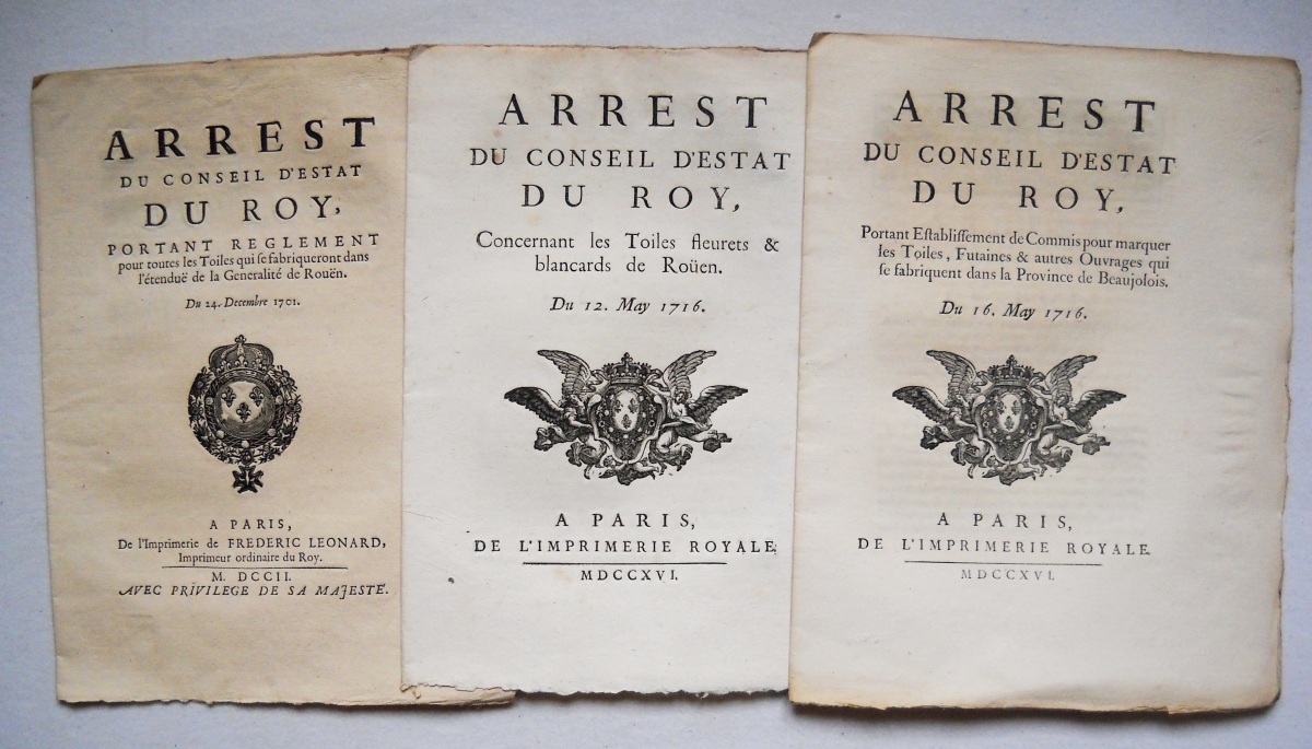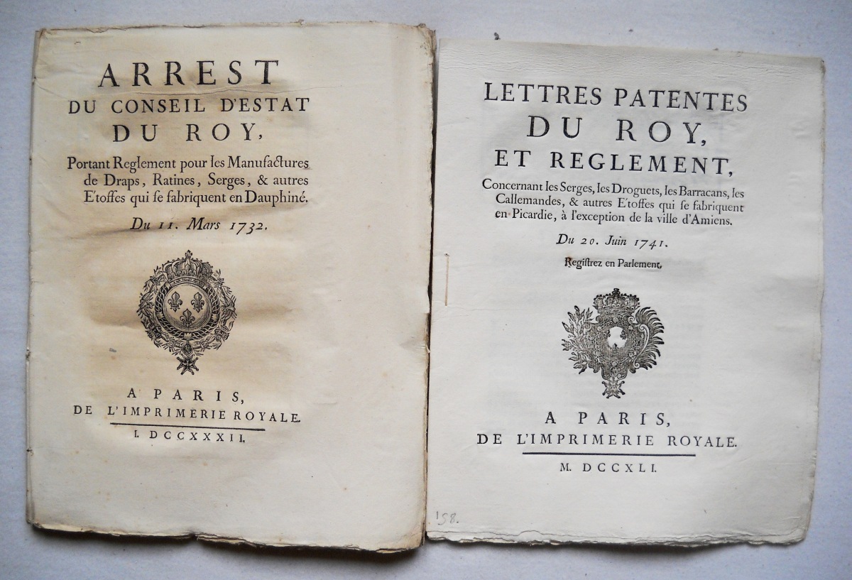 [COMMERCE -TOILES et LAINES, DRAPS et TAPISSERIES - MANUFACTURES et FABRIQUES] - Lettres patentes, édits, déclarations, ordonnances, arrêts du conseil d'état du roi, et divers, relatifs à la fabrication et au commerce des toiles, laines, draps et tapisseries.