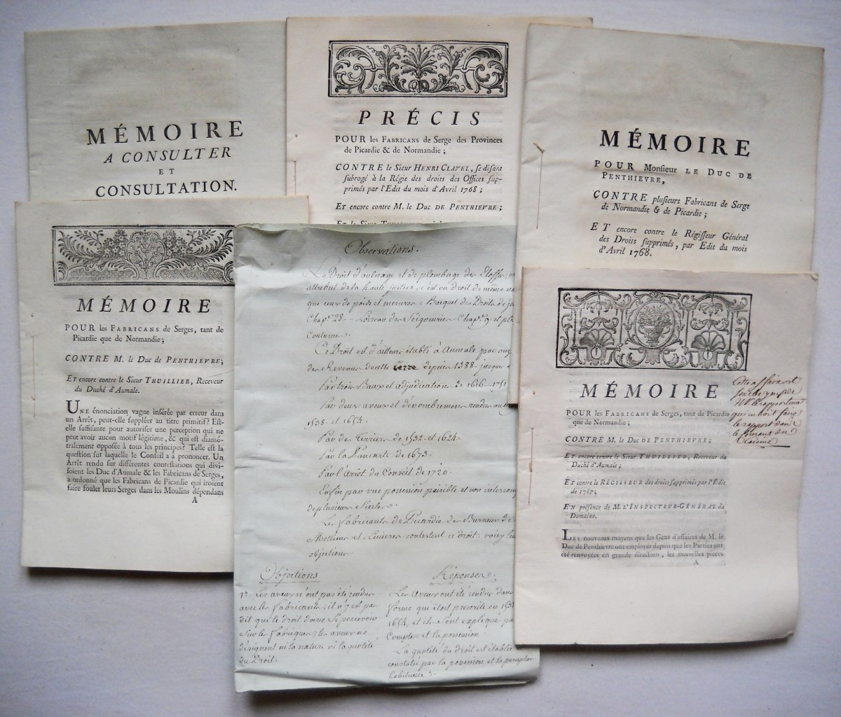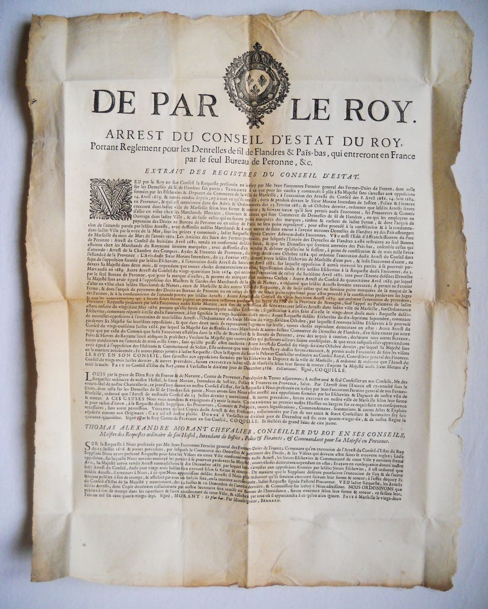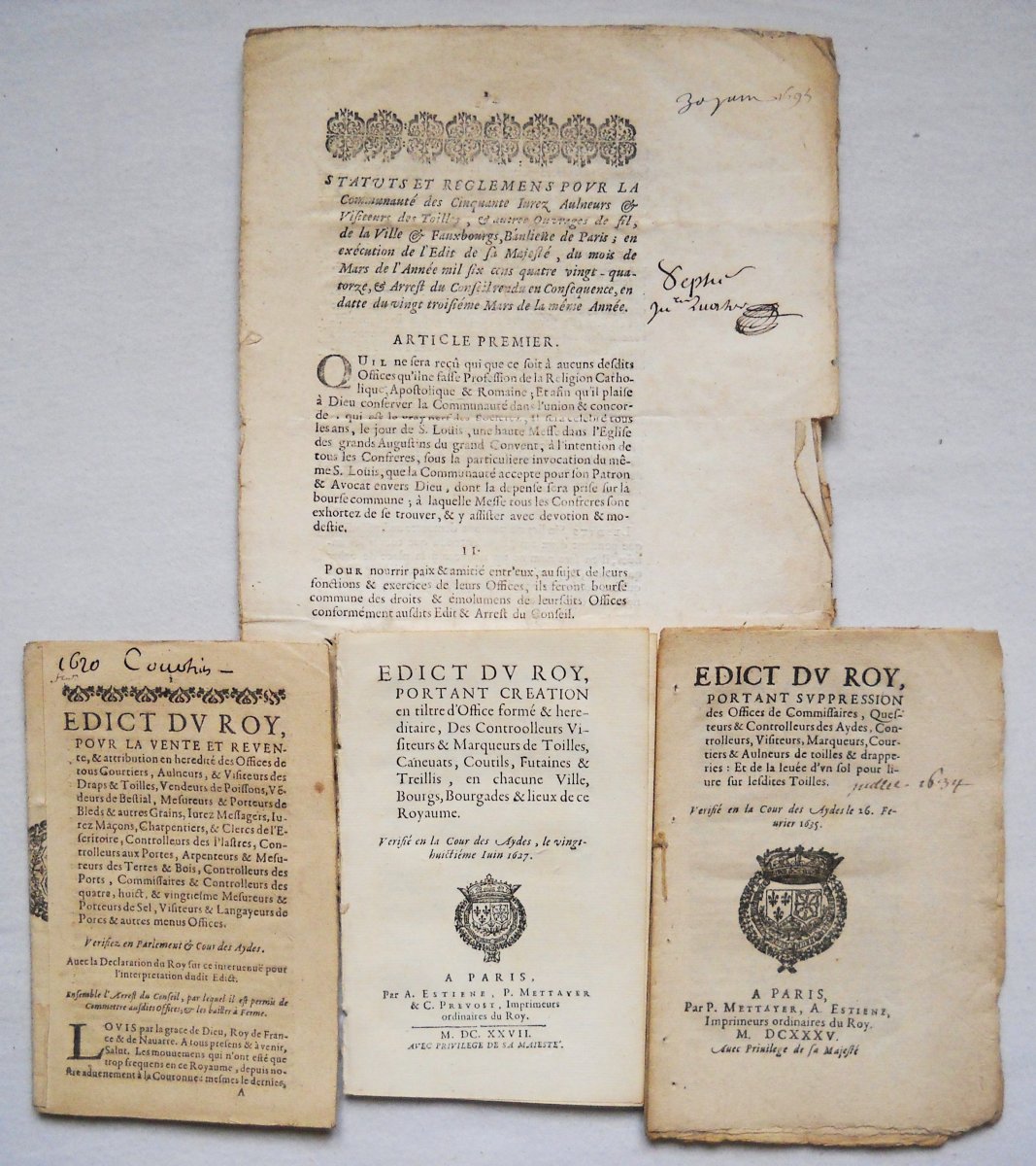 [COMMERCE -TOILES et LAINES, DRAPS et TAPISSERIES - MANUFACTURES et FABRIQUES] - Lettres patentes, édits, déclarations, ordonnances, arrêts du conseil d'état du roi, et divers, relatifs à la fabrication et au commerce des toiles, laines, draps et tapisseries.
