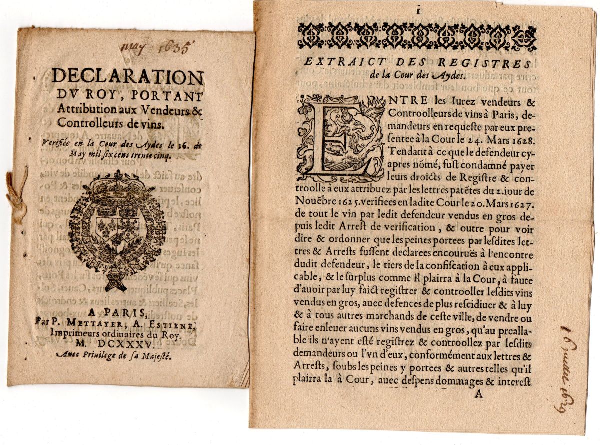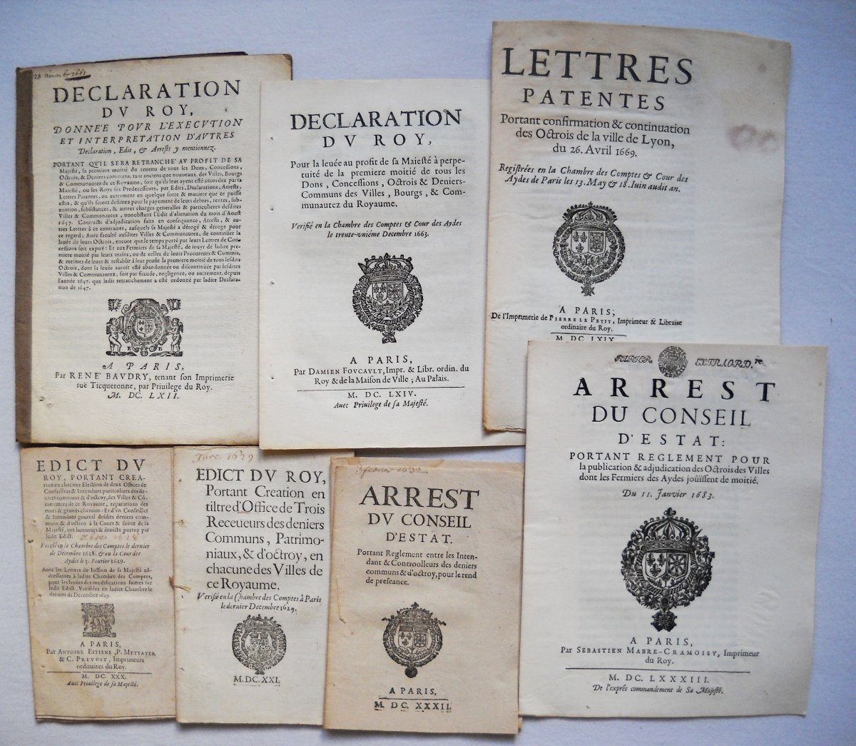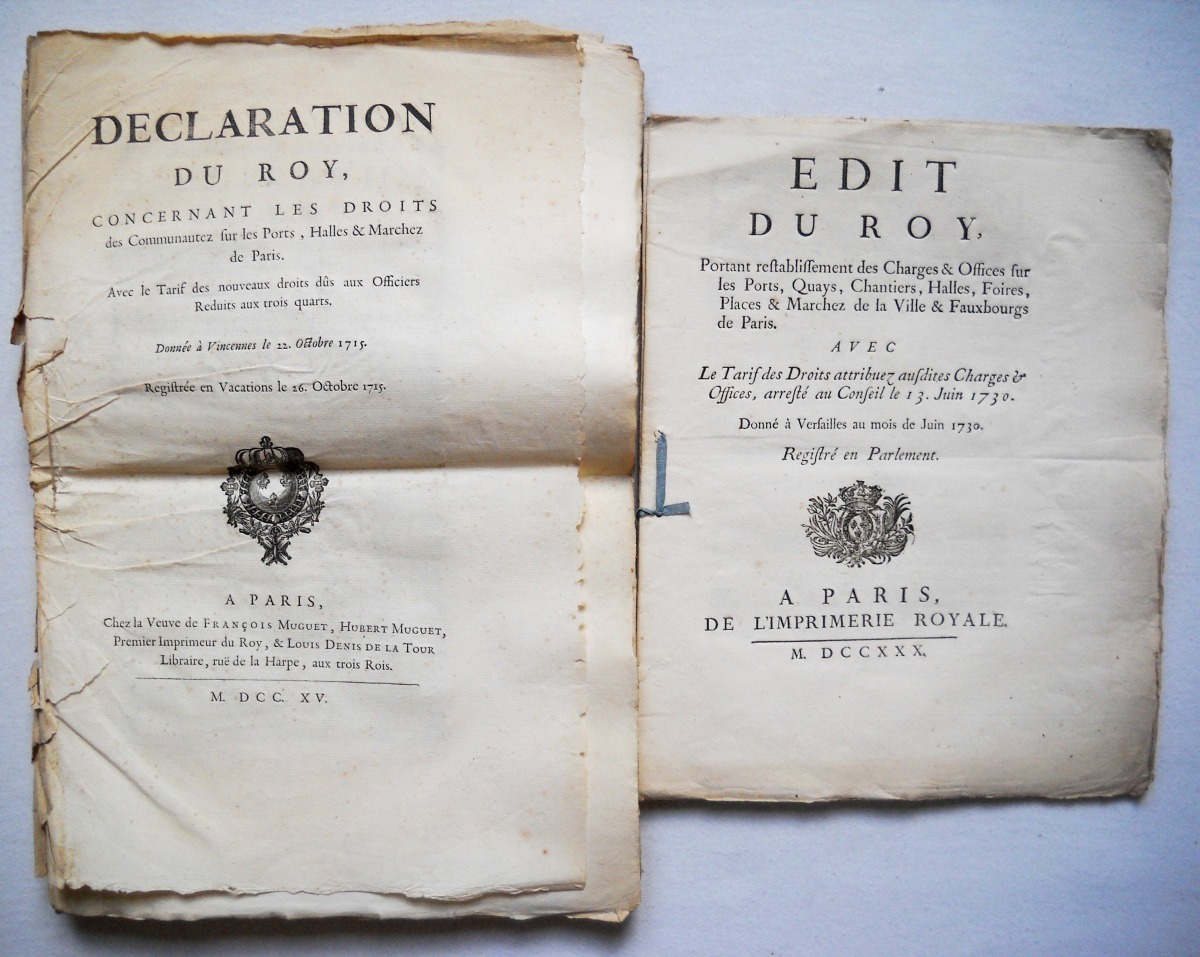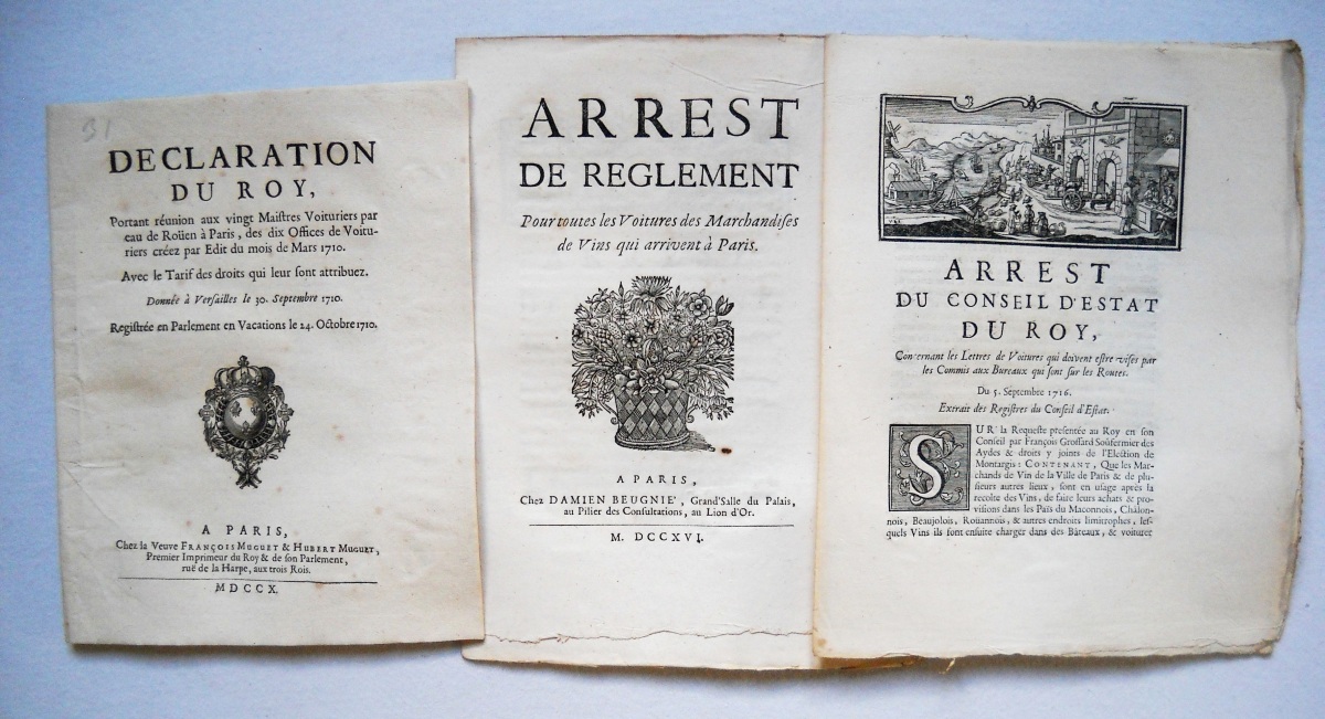 -[TRANSPORTS - CIRCULATION DE MARCHANDISES - PEAGES - OCTROIS] - Lettres patentes, édits, déclarations, ordonnances, arrêts du conseil d'état du roi, arrêts de la cour de parlement, sentences des marchands et échevins de Paris et divers, relatifs à la circulation des marchandises, essentiellement dans la ville de Paris, et aux droits de péages dans les provinces du royaume.