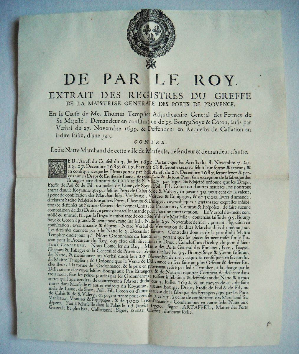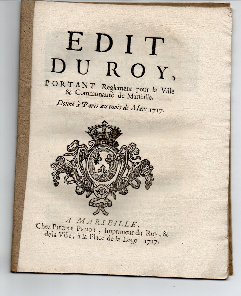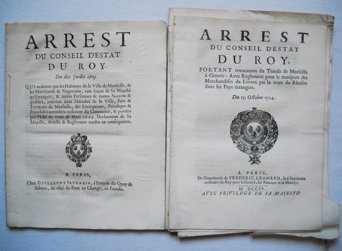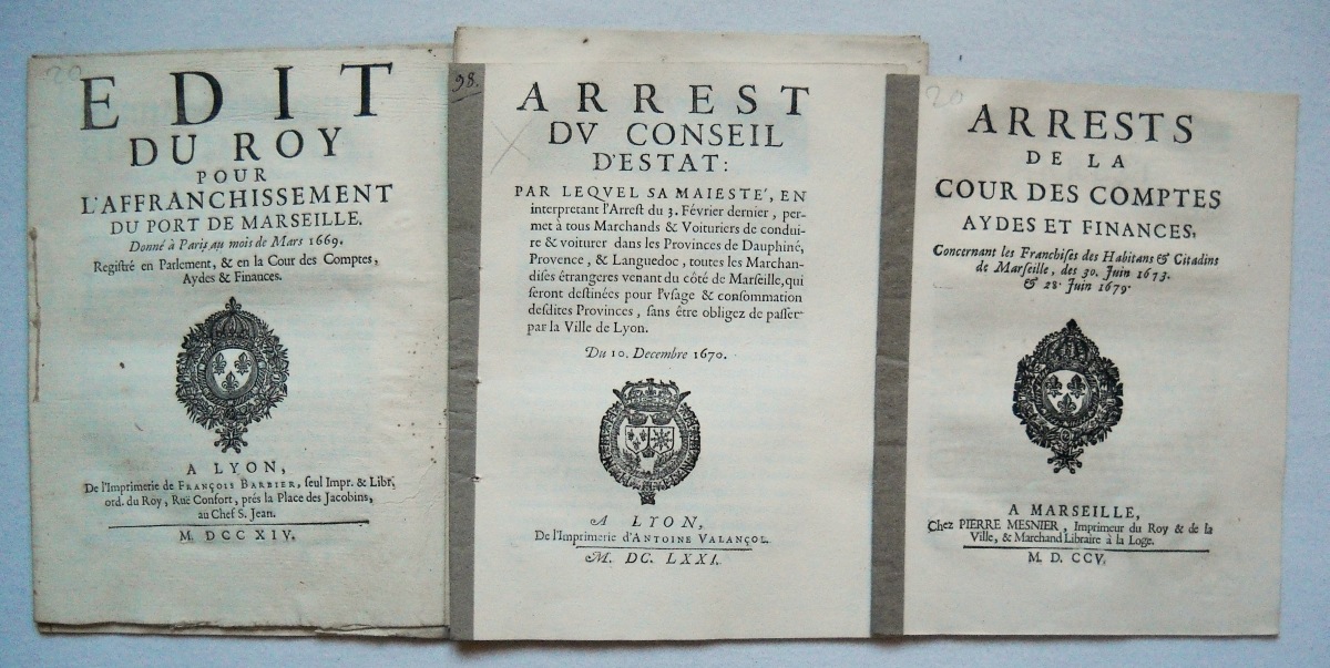 1669, 24 pp., in-16 - Edit du roy pour l'affranchissement du port de Marseille, mars 1669. A Lyon, François Barbier, 1714, 16 pp., in-8 - Arrest du conseil d'estat du roy portant que les soyes et autres marchandises venans du Levant & qui auront esté entreposées à Gennes, Ligourne, & autres villes d'Italie, payeront à l'entrée de ce royaume vingt pour cent & qu'elles ne pourront entrer que par mer que par Marseille, & par terre par le pont de Beauvoisin & Lyon, 9 aoust 1670. A Paris, Frederic Leonard, 1670, 8 pp., in-4 - Arrests de la cour des comptes aydes et finances concernant les franchises des habitans & citadins de Marseille, des 30 juin 1673, & 28 juin 1679. A Marseille, chez Pierre Mesnier, 1705, 15 pp., in-8 - Arrest du conseil d'estat du roy qui revoque le privilege pour la vente du caffé, thé, sorbec, chocolat, cacao & vanille (
