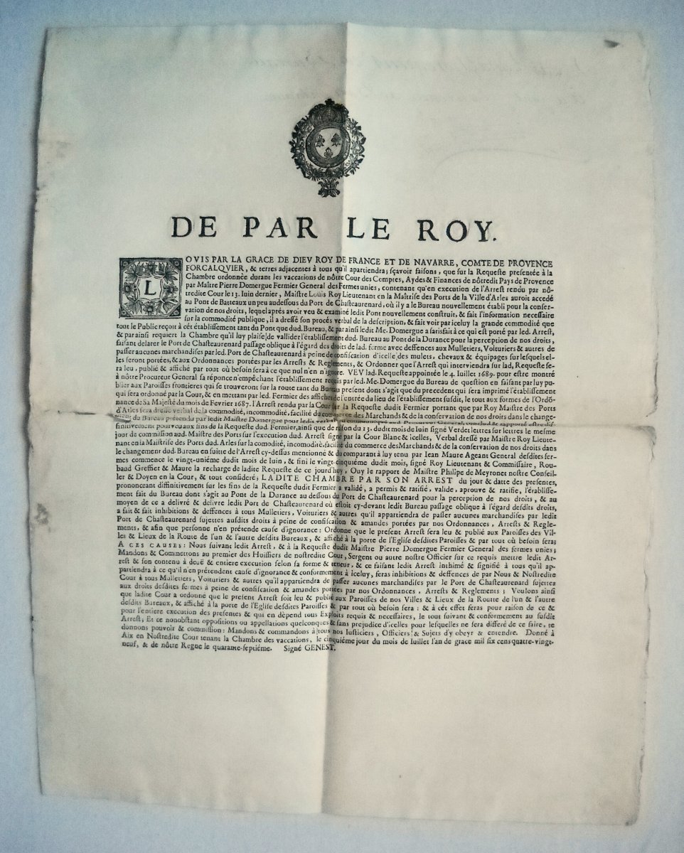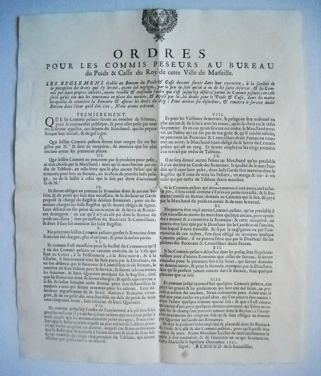 A Montpellier, Jean Martel, 1699, 7 pp., in-8 - Ordres pour les commis peseurs au bureau du poids & casse du roy de cette ville de Marseille. 1697, 37 x 45 cm - Arrest du conseil d'estat du roy qui ordonne que les habitans de la ville de Marseille, & les marchands & negocians, tant sujets de Sa Majesté qu'etrangers, & autres personnes de toutes nations & qualitez, jouiront dans l'étendue de la ville, port & territoire de Marseille, des exemptions, privileges & franchises accordées en faveur du commerce