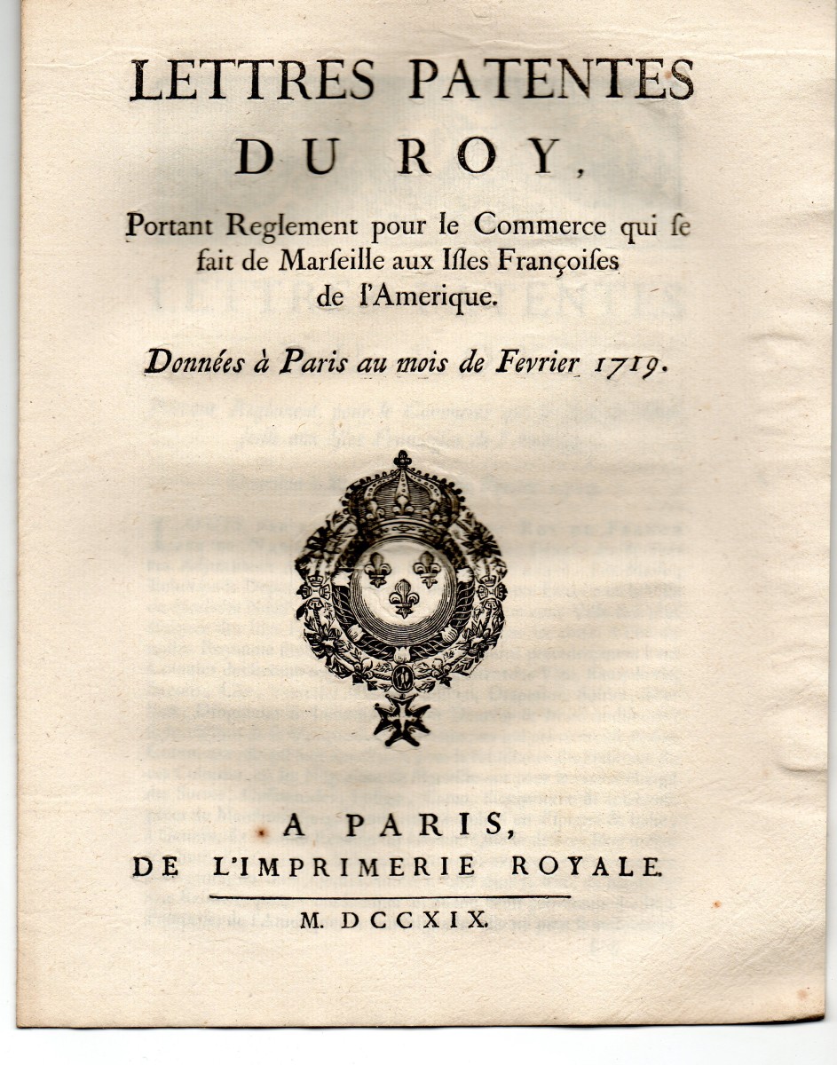 A Paris, chez Guillaume Saugrain, 1703, 19 pp., in-8 - Arrest du conseil d'estat du roy portant revocation du transit de Marseille à Geneve, avec reglement pour le transport des marchandises du Levant par la voye du Rhosne dans les pays étrangers, 15 octobre 1704. A Paris, Frederic Leonard, 1704, 16 pp., in-8 - Edit du roy portant reglement pour la ville & communauté de Marseille. A Marseille, chez Pierre Penot, 1717, 39 pp., in-8 - Lettres patentes du roy portant reglement pour le commerce qui se fait de Marseille aux Isles françoises de l'Amérique. A Paris, de l'imprimerie royale, 1719, 12 pp., in-8 - Arrest du conseil d'estat du roy portant reglemens pour les tanneurs de la ville de Marseille, 6 mai 1719. A Paris, de l'imprimerie royale, 1719, 8 pp., in-8 - Lettres patentes du roy qui accordent à la ville de Dunkerque le privilege & la liberté de faire le commerce aux isles françoises de l'Amerique