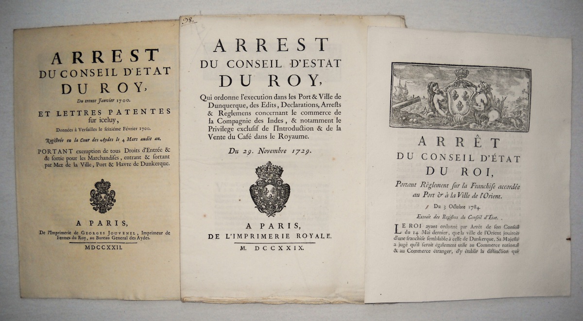 A Paris, de l'imprimerie royale, 1722, 8 pp., in-8 - Arrest du conseil d'estat du roy servant de reglement pour les marchandises du cru ou fabrique de France, sortant de Dunkerque, pour la consommation de la Flandre françoise. A Paris, chez la veuve & M-G. Jouvenel, 1722, 8 pp., in-8 - Arrest du conseil d'estat du roy portant reglement pour les calfats de la ville de Marseille, 14 novembre 1726. A Paris, de l'imprimerie royale, 1726, 11 pp., in-8 - Arrest du conseil d'estat du roy aui ordonne l'execution dans les port & ville de Dunkerque, des edits, declarations, arrests & reglemens concernant le commerce de la Compagnie des Indes, & notamment le privilege exclusif de l'introduction & de la vente du café dans le royaume. A Paris, de l'imprimerie royale, 1729, 20 pp., in-4 - Lettres patentes du roi portant confirmation de privileges en faveur des habitans du comté de Venise. A Paris, chez P.G. Simon, 1775, 8 pp., in-4 - Lettres patentes du roi concernant la chambre du commerce de Marseille. A Paris, de l'imprimerie royale, 1781, 7 pp., in-4 - Arrêt du conseil d'état du roi portant règlement sur la franchise accordée au port & à la ville de Lorient, 3 octobre 1784. A Paris, de l'imprimerie royale, 1784, 6 pp., in-4 - Lettres patentes du roi portant confirmation & interprétation des privileges de la ville de Bayonne & de ceux du pays de Labourt ; et reglement relatif à la franchise accordée au port de ladite ville. A Paris, chez P.G. & N.H. Nyon, 1785, 16 pp., in-4 - etc.