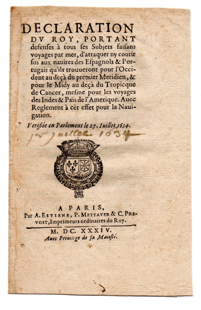 Declaration du roy portant defenses à tous ses sujets faisans voyages par mer, d'attaquer ny courir sus aux navires des Espagnols & Portugais qu'ils trouveront pour l'Occident au deçà du premier Meridien & pour le Midy au deçà du Tropicque du Cancer, mesme pour les voyages des Indes & païs de l'Amérique. Avec reglement à cet effet pour la navigation, 27 juillet 1634. A Paris, par A. Estiene, P. Mettayer & C. Prevost, 8 p., in-12 - Declaration du roy pour l'estape generale dans les villes maritimes, février 1670. A Paris, par Sébastien Mabre-Cramoisy, 1670, 8 pp., in-8 - Arrest du conseil d'estat du roy portant reglement sur le delestage des vaisseaux françois, & estrangers, dans les ports du royaume, 29 mars 1670. A Paris, par Sébastien Mabre-Cramoisy, 1670, 8 pp., in-4 - Arrest du conseil d'estat qui declare communs avec tous les sujets du roy le reglement fait par les negotians de Bretagne, au sujet de la pesche du Petit Nort, 28 avril 1671. A Paris, par Sébastien Mabre-Cramoisy, 1671, 4 pp., in-8 - Ordonnance du roy pour l'ouverture des ports du royaume & la liberté du commerce, 7 juin 1678. A Paris, par Sébastien Mabre-Cramoisy, 1678, 4 pp., in-8 - Ordonnance du roy portant que les vaisseaux des sujets des estats generaux des Provinces-Unies seront reçues dans les ports du royaume, 9 octobre 1697. A Paris, chez Estienne Michallet, 1697, 4 pp., in-8 - Ordonnance du roy concernant le commerce des vaisseaux portugais pendant la presente guerre, 24 juillet 1704. A Paris, de l'imprimerie royale, 1704, 4 pp., in-8 - Edit du roy qui décharge les negocians de l'obligation de prendre des passeports de Sa Majesté, pour envoyer leurs vaisseaux dans les lieux où il n'y a point d'interdiction pour la navigation ni pour le commerce