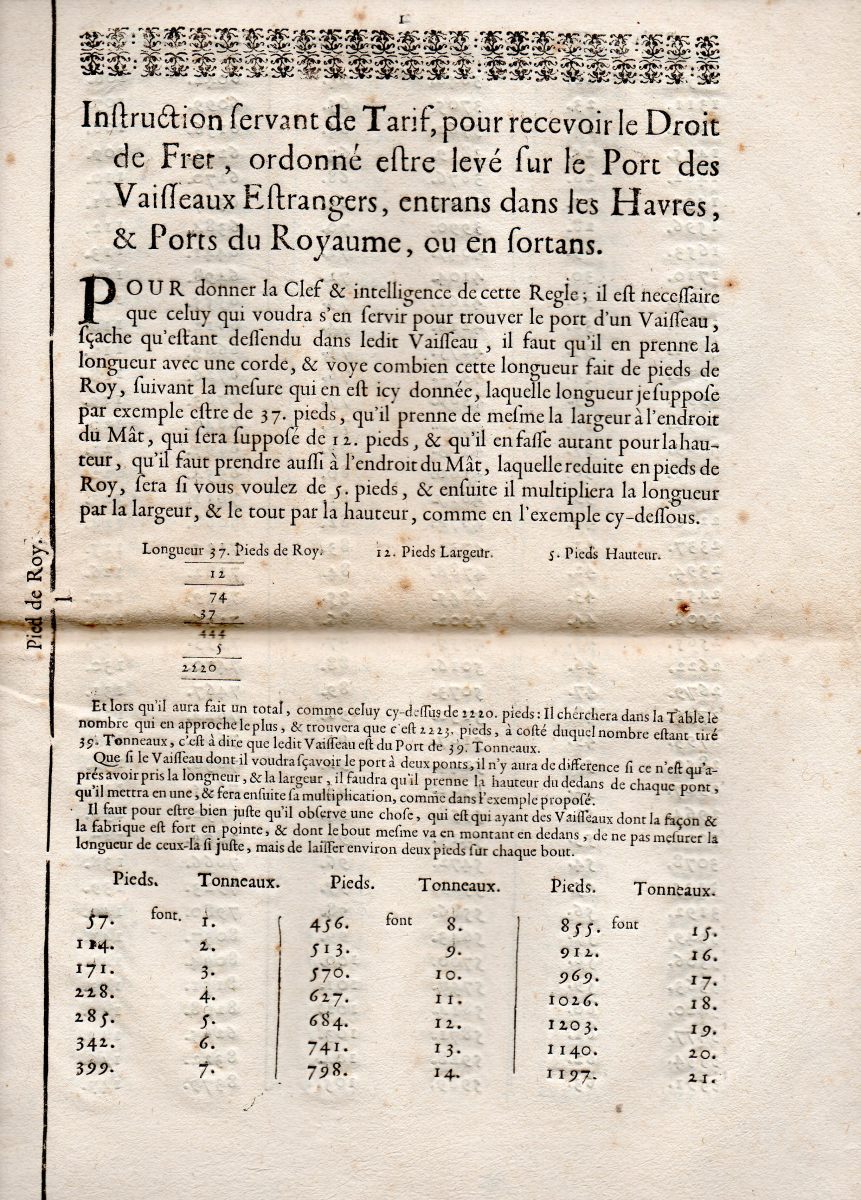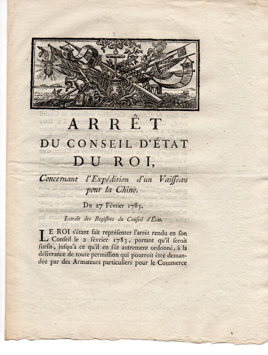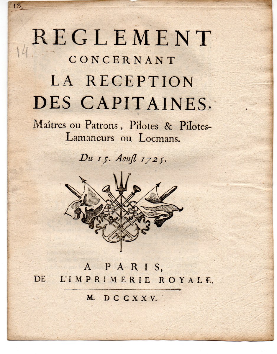 février 1716. A Paris, de l'imprimerie royale, 1716, 7 pp., in-8 - Ordonnance du roy pour empescher que les vaisseaux marchands mouillez dans le port de Marseille ne soient endommagez par le feu, et pour établir les moyens de l'éteindre en cas que ces accidens arrivent, 14 aoust 1719. A Paris, de l'imprimerie royale, 1719, 8 pp., in-4 - Reglement concernant la reception des capitaines, maîtres ou patrons, pilotes & pilotes-lamaneurs ou locmans, 15 aoust 1725. A Paris, de l'imprimerie royale, 1725, 8 pp., in-8 -Reglement pour la navigation au petit cabotage en Provence & en Languedoc, 13 aoust 1726, A Paris, de l'imprimerie royale, 1726, 8 pp., in-8 - Arrest du conseil d'estat portant reglement pour les calfats de la ville de Marseille, 14 novembre 1726. A Paris, de l'imprimerie royale, 1726, 11 pp., in-8 - Instruction servant de tarif, pour recevoir le droit de fret, ordonné estre levé sur le port des vaisseaux estrangers, entrans dans les havres & ports du royaume, ou en sortans. 9 pp., in-fol. - Arrest du conseil d'estat du roy qui éteint & supprime le droit de vingtain de Carenne, dans les ports de Provence, 13 mai 1738. A Paris, chez Pierre Prault, 1738, 7 pp., in-4 - Arrest du conseil d'estat du roy servant de reglement pour le pilotage à Dunkerque, 15 février 1740. A Paris, de l'imprimerie royale, 1740, 7 pp., in-4 - Arrêt du conseil d'état du roi qui fixe les droits sur les sucres raffinés venant de l'étranger, 17 mars 1782. A Paris, de l'imprimerie royale, 1782, 3 pp., in-4 - Ordonnance du roi concernant la composition des équipages des navires marchands, 4 juillet 1784. A Paris, de l'imprimerie royale, 1784, 6 pp., in-4 -Arrêt du conseil d'état du roi concernant l'expédition d'un vaisseau pour la Chine, 27 février 1785. A Paris, de l'imprimerie royale, 1785, 3 pp., in-4 - Arrêt du conseil d'état du roi portant cession & transport à la nouvelle compagnie des Indes, en toute propriété, du vaisseau le Dauphin, expédié en Chine