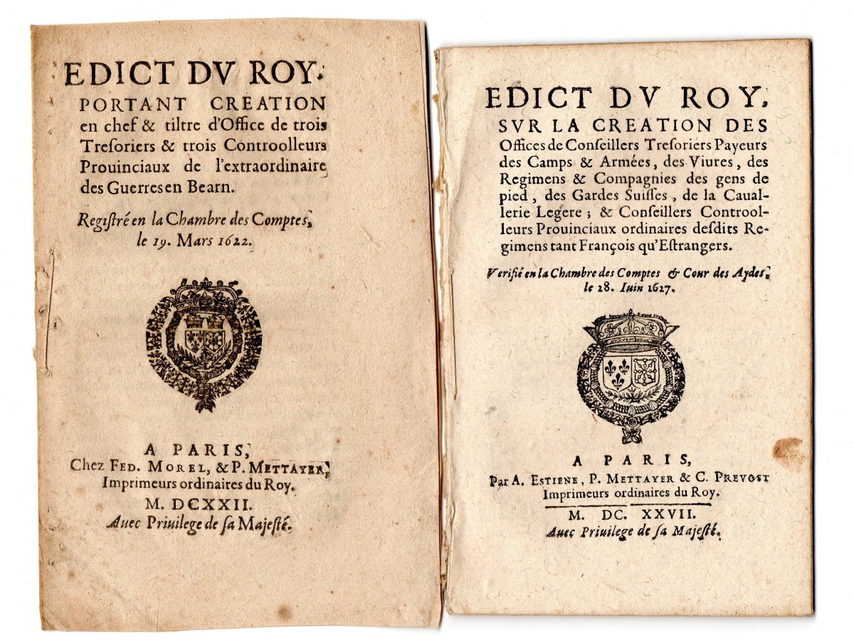 Edict du roy portant creation en chef & tiltre d'office de trois tresoriers & trois controolleurs provinciaux de l'extraordinaire des guerres en Bearn. A Paris, chez Fed. Morel & P. Mettayer, 1622, 7 pp., in-16 - Edict du roy sur la creation des offices de conseillers tresoriers payeurs des camps & armées, des vivres, des regimens & compagnies des gens de pied, des agrdes Suisses, de la cavalerie legere ; et conseillers controolleurs provinciaux ordinaires desdits regimens tant françois qu'estrangers. A Paris, par E. Estiene, P. Mettayer & C. Prevost, 1627, 30 pp., in-16 - Edits et reglemens concernant les offices de guerre, billets faits à l'occasion de la guerre, munitionnaires, tresoriers des guerre & conduite, controlleurs des guerres et tous officiers de maréchaussée. 1705, 7 pp., in-8 - Declaration du roy concernant les billets de l'extraordinaire des guerres, le 4 juin 1712. Frederic Leonard, 1712, 8 pp., in-8 - Edit du roi qui regle les fonctions & les attributions des deux tresoriers de l'extraordinaire des guerres. A Paris, de l'imprimerie royale, 1717, 11 pp., in-8 - Déclaration du roi concernant la comptabilité du trésorier-payeur général des dépenses du département de la guerre, 12 juin 1781. A Paris, de l'imprimerie royale, 1781, 14 pp., in-4 - etc.