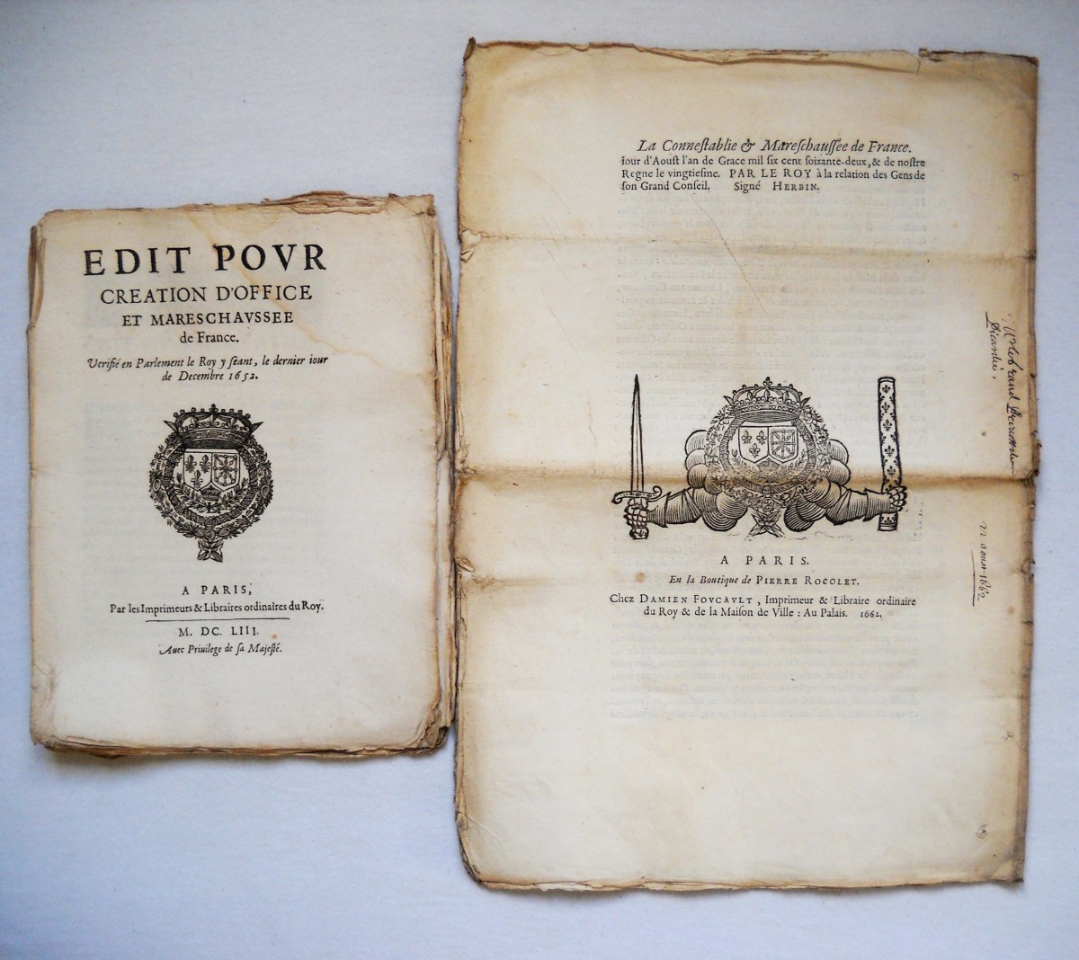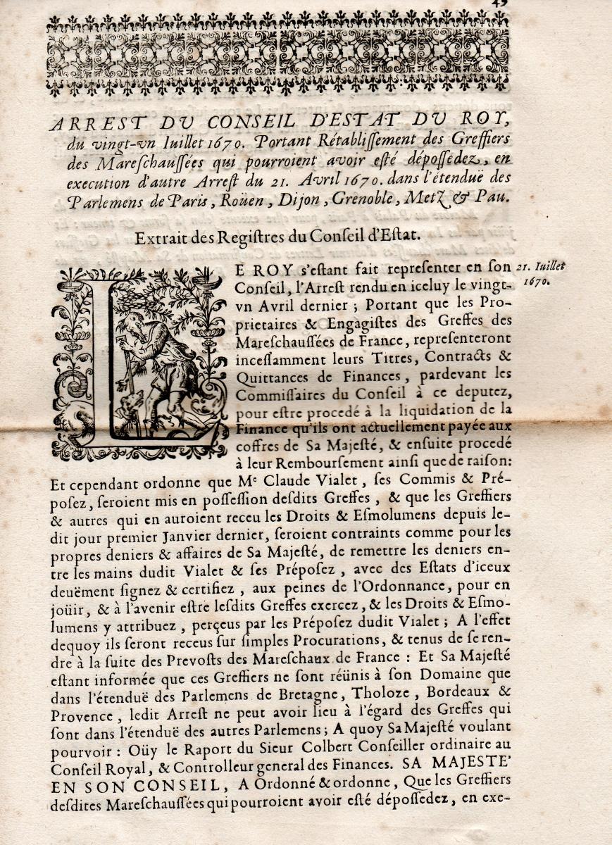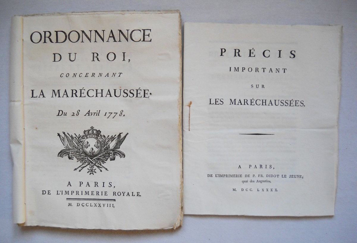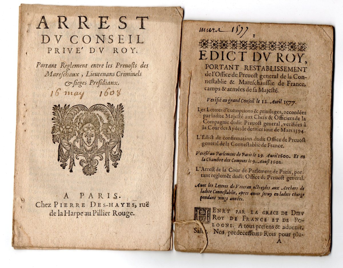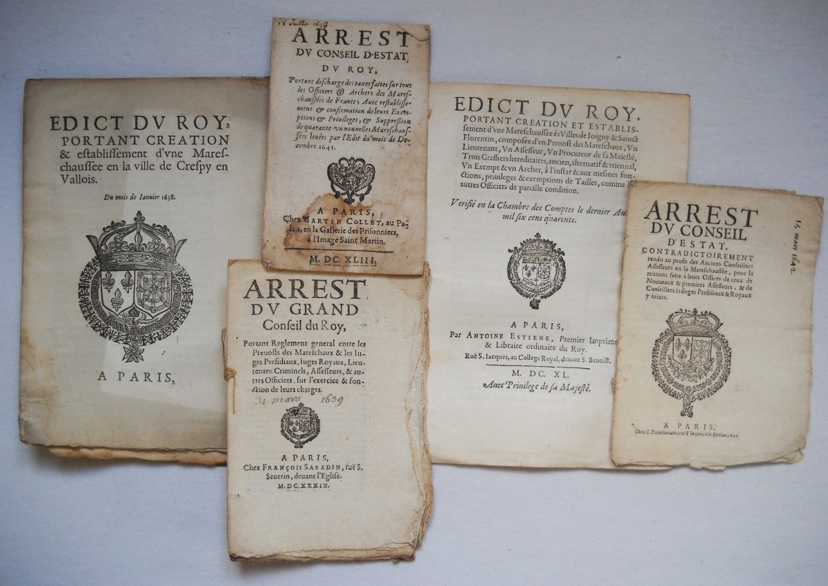 [MARÉCHAUSSÉE] - Lettres patentes, édits, déclarations, ordonnances, arrêts du conseil d'état du roi, arrêts de la cour de parlement, et divers, relatifs à la connétablie et à la maréchaussée de France.