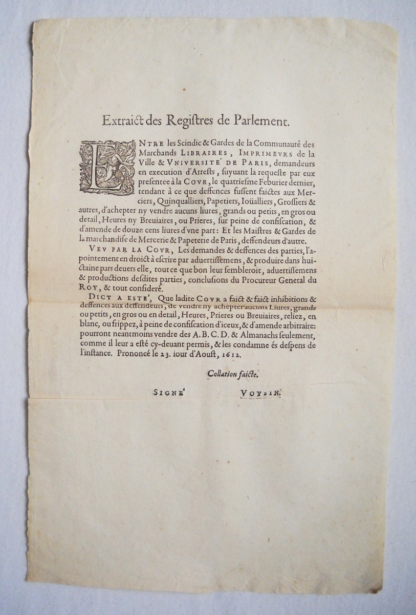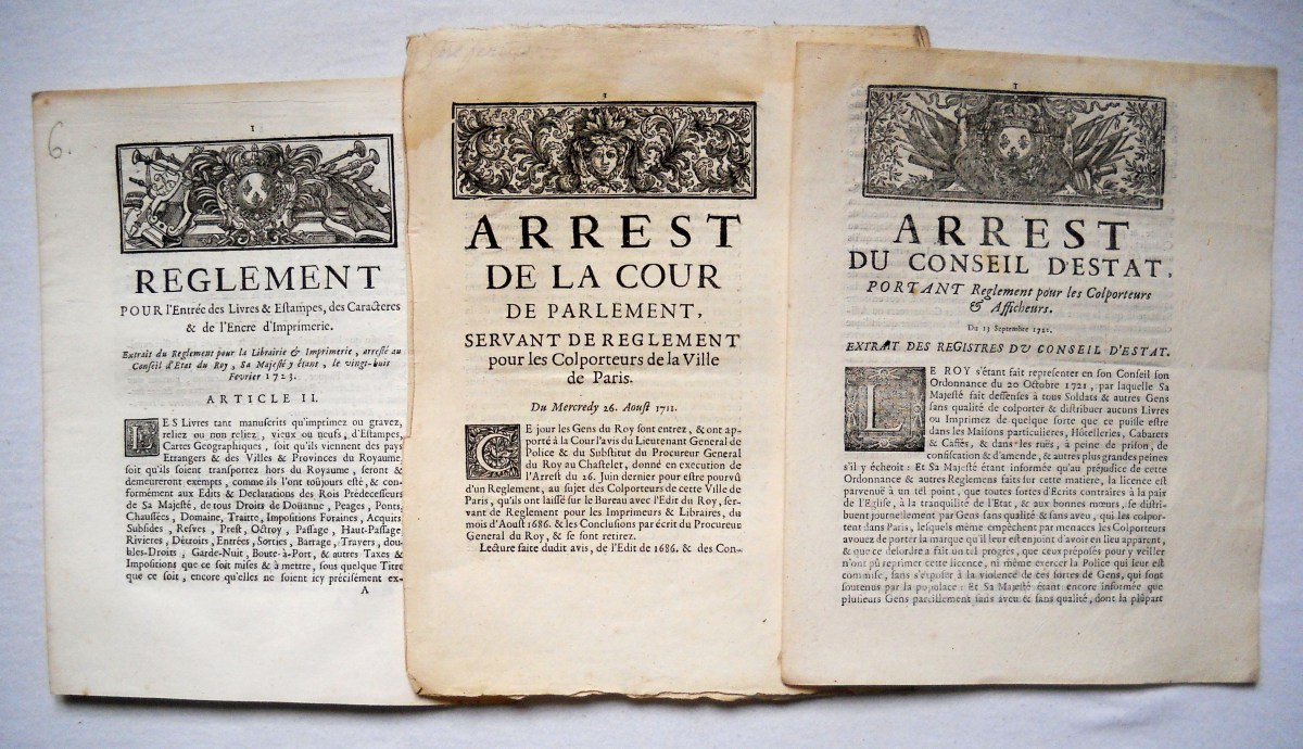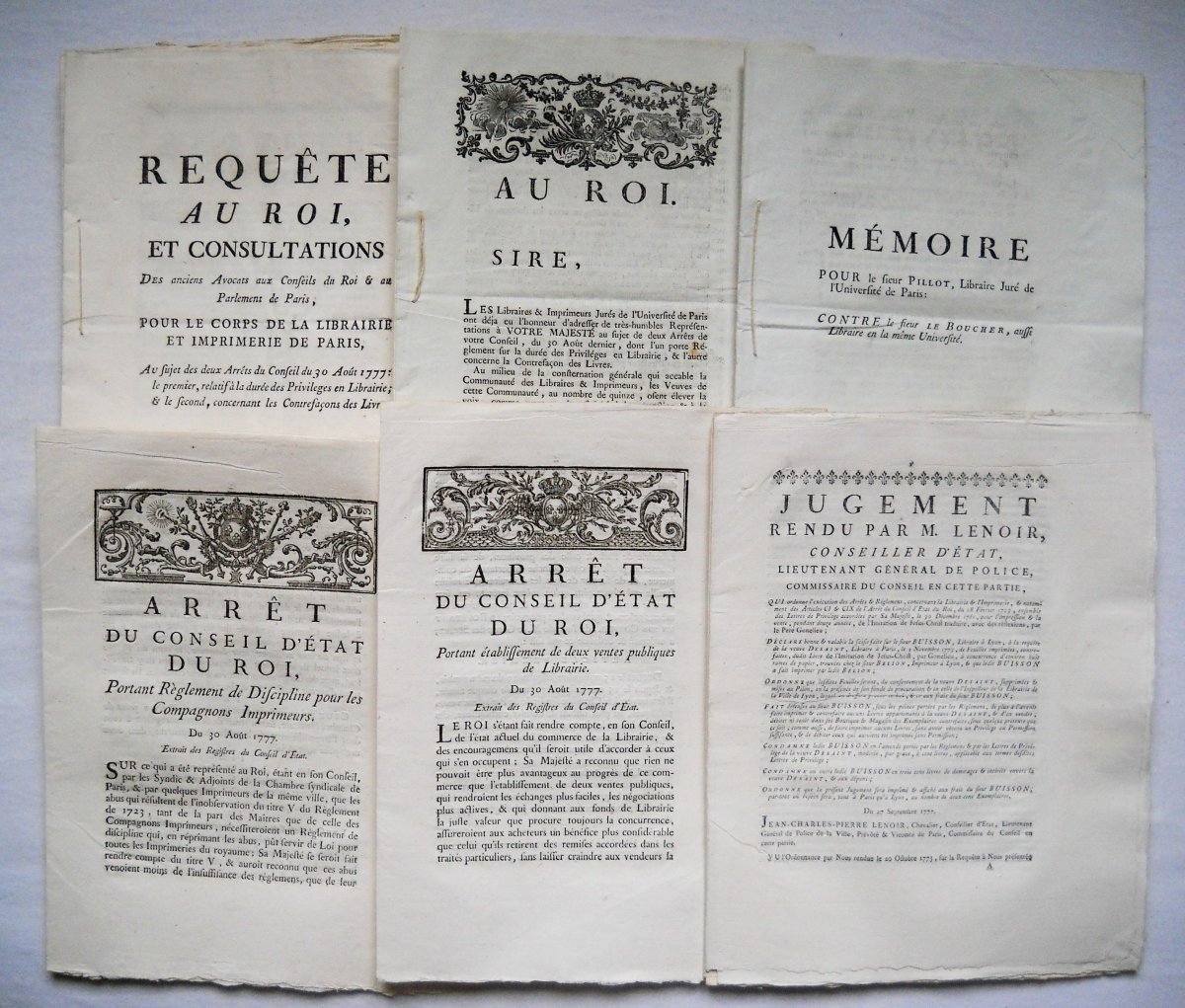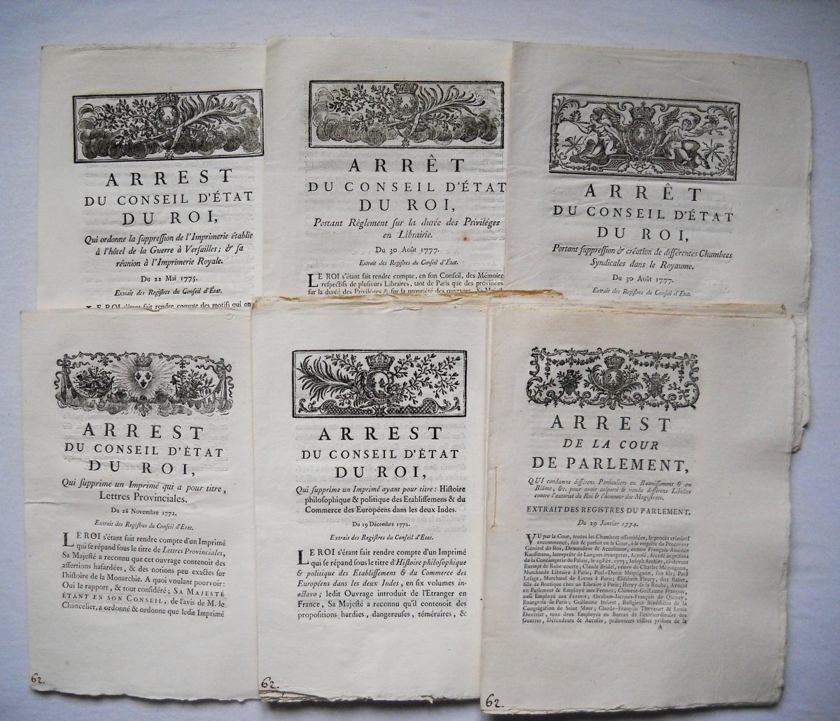 Reglement pour l'entrée des livres & estampes, des caractères & de l'encre d'imprimerie. De l'imprimerie du syndic, 1723, 6 pp., in-4 - Arrest du conseil d'estat du roi qui supprime un imprimé qui a pour titre Lettres provinciales, 28 novembre 1772. A Paris, chez P.G. Simon, 1772, 2 pp., in-4 - Arrest de la cour de parlement qui condamne différens particuliers au bannissement & au blâme, &c pour avoir colporté & vendu différens libelles contre l'autorité du roi & l'honneur des magistrats, 29 janvier 1774. A Paris, chez P.G. Simon, 1774, 24 pp., in-4 - Arrest du conseil d'état du roi qui ordonne la suppression de l'imprimerie établie à l'hôtel de la guerre à Versailles & sa réunion à l'Imprimerie royale, 22 mai 1775. A Paris, de l'imprimerie royale, 1775, 4 pp., in-4 - Arrêt du conseil d'état du roi qui interdit un imprimeur & deux libraires, 13 juin 1777. A Paris, de l'imprimerie royale, 1777, 3 pp., in-4 - Arrêt du conseil d'état du roi portant suppression & création de différentes chambres syndicales dans le royaume, 30 août 1777. A Paris, de l'imprimerie royale, 1777, 11 pp., in-4 - Arrêt du conseil d'état du roi portant règlement de discipline pour les compagnons imprimeurs, 30 août 1777. A Paris, de l'imprimerie royale, 1777, 8 pp., in-4 - Requête au roi et consultations des anciens avocats aux conseils du roi & au parlement de Paris, pour le corps de la librairie et imprimerie de Paris