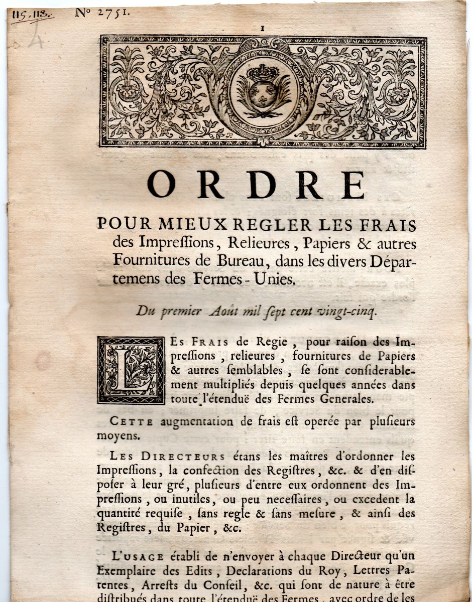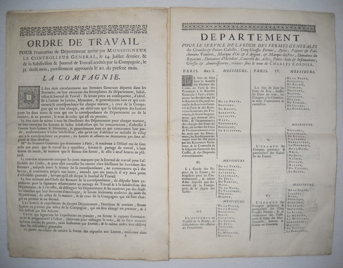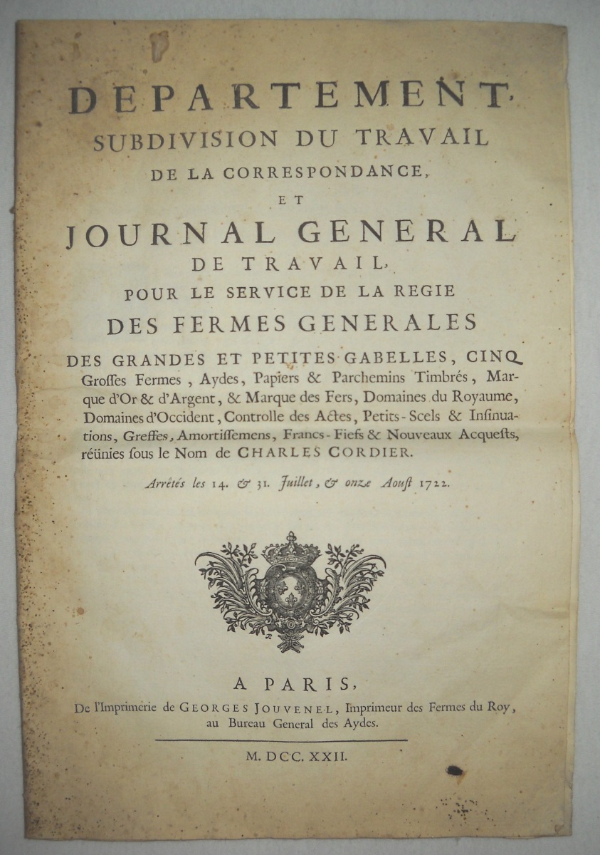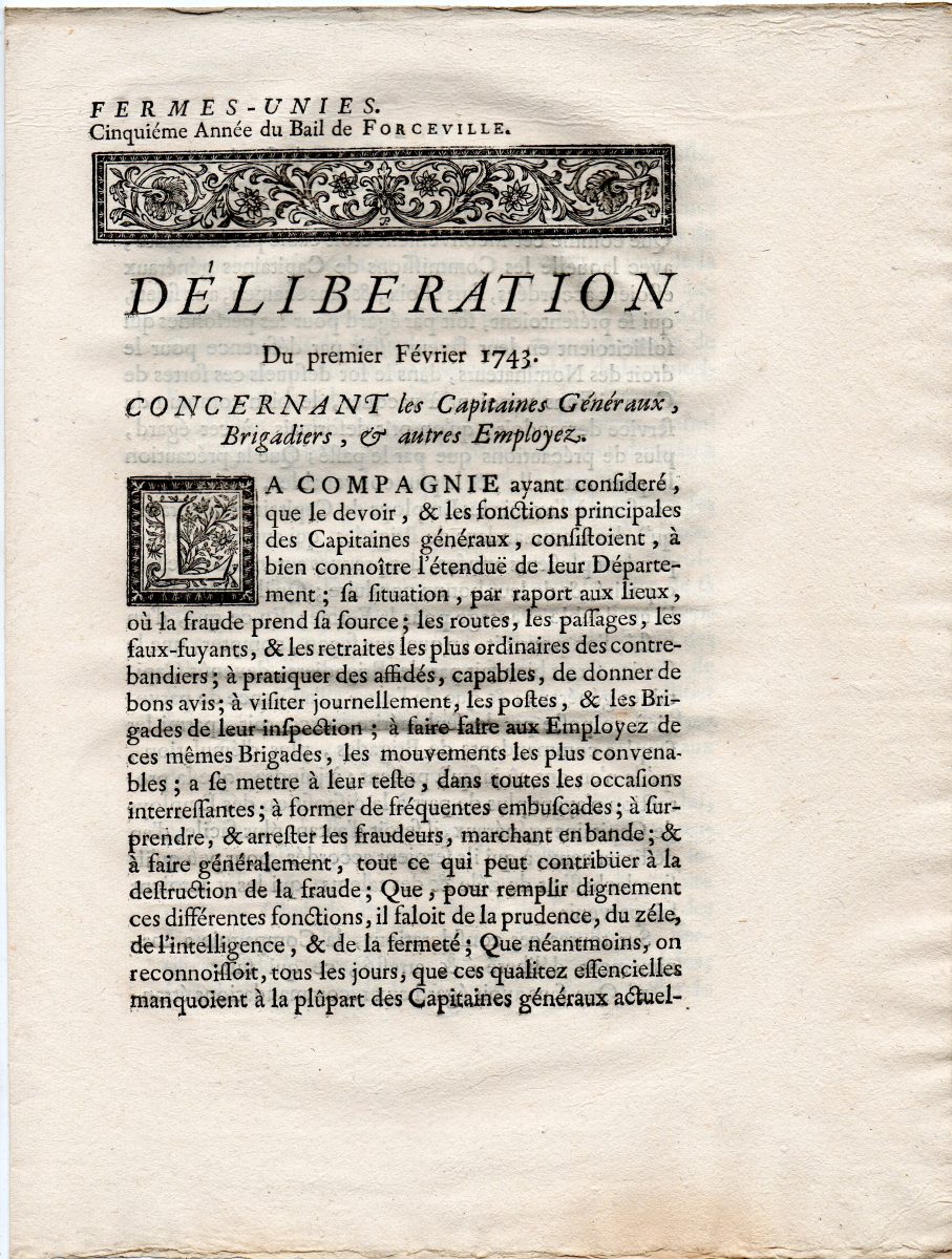 [Adjudications et enregistrement des baux et sous-baux - prises de possessions, résiliations, publications - commissions des employés, prestation de serment, indemnités des fermiers et des sous-fermiers - tenue des registres journaux - délibérations de la compagnie de la ferme - ordres et instructions aux employés - organisation, contrôle de la circulation des marchandises (déclarations et acquits à caution, congés et certificats de décharges) - privilèges des commis des fermes générales (aydes, gabelle, etc).]