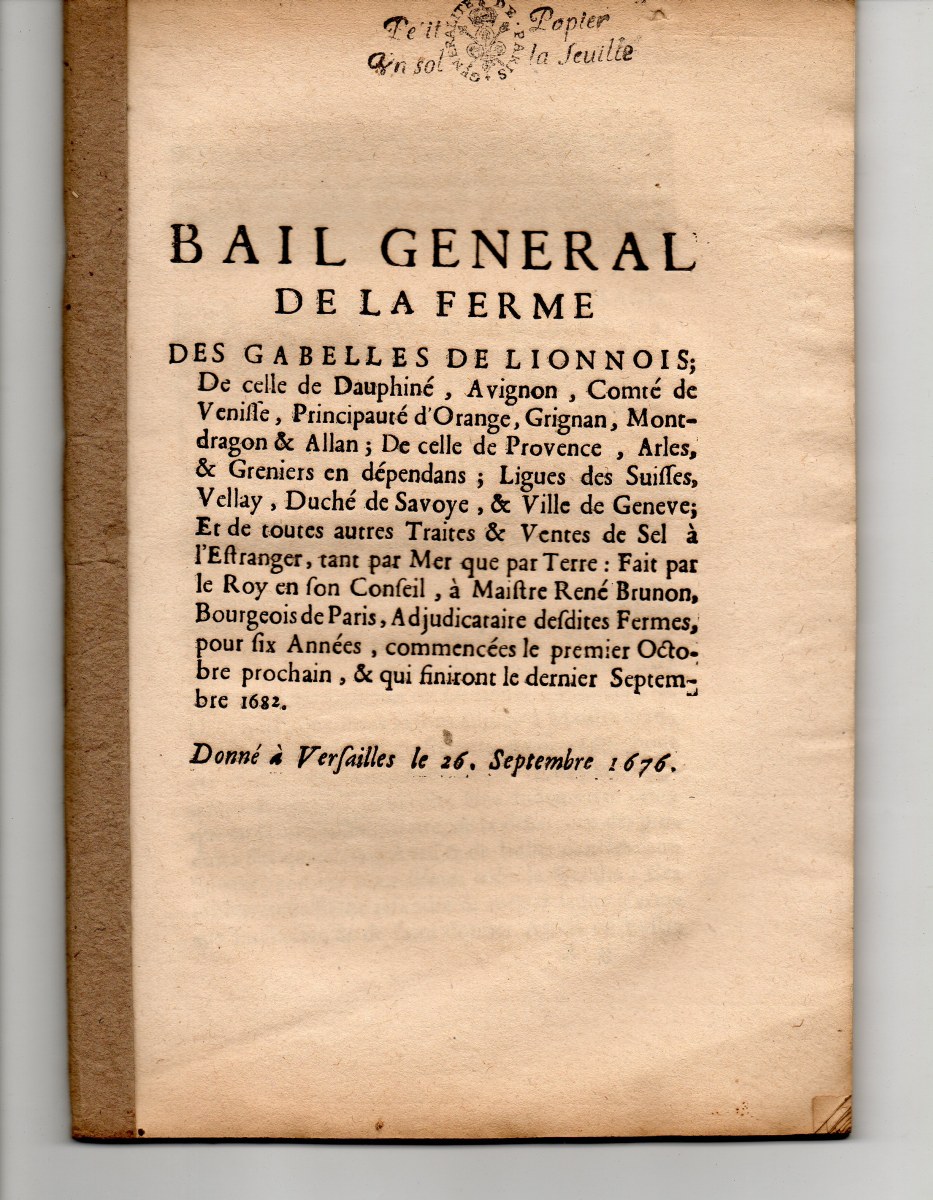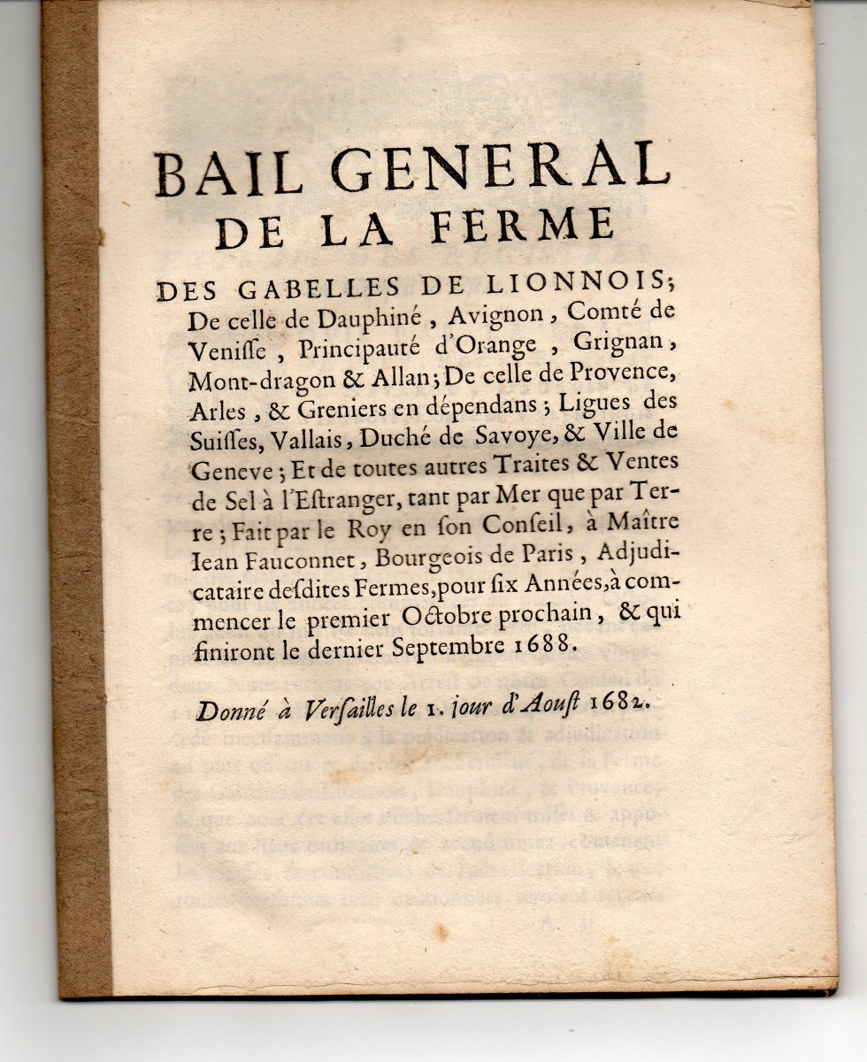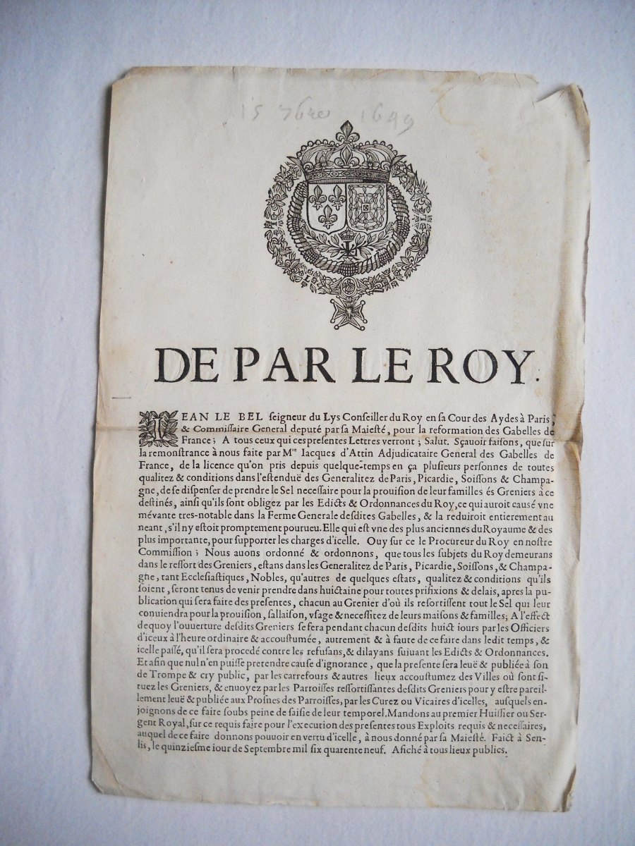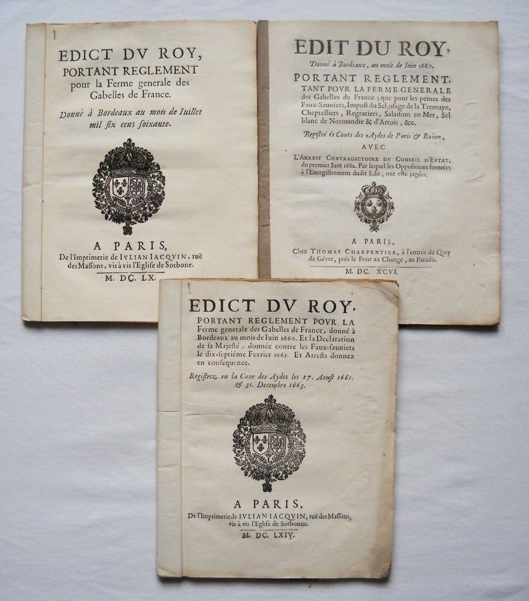 [IMPÔTS - GABELLE - BAUX et RÈGLEMENTS] - Lettres patentes, édits, déclarations, ordonnances, arrêts du conseil d'état du roi, arrêts de la cour des aydes et divers, relatifs au bail de la ferme générale des gabelles, aux règlements et à la jurisprudence de la perception du droit de gabelle.