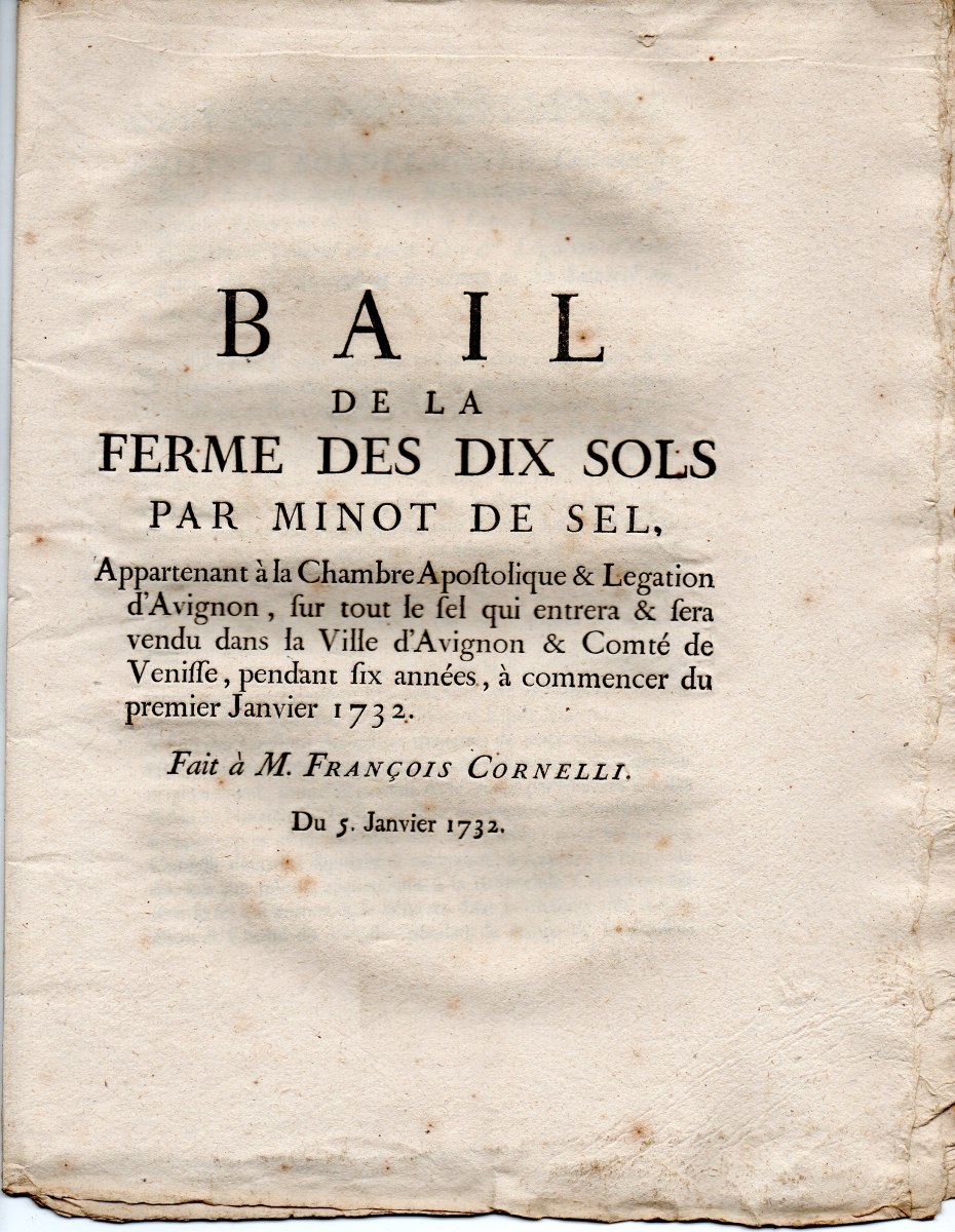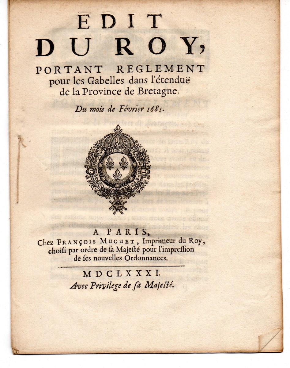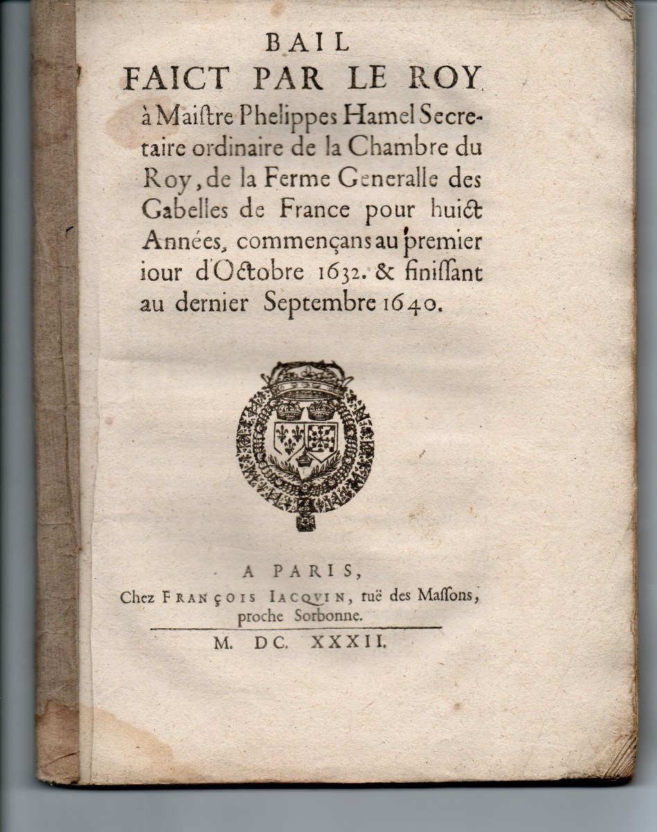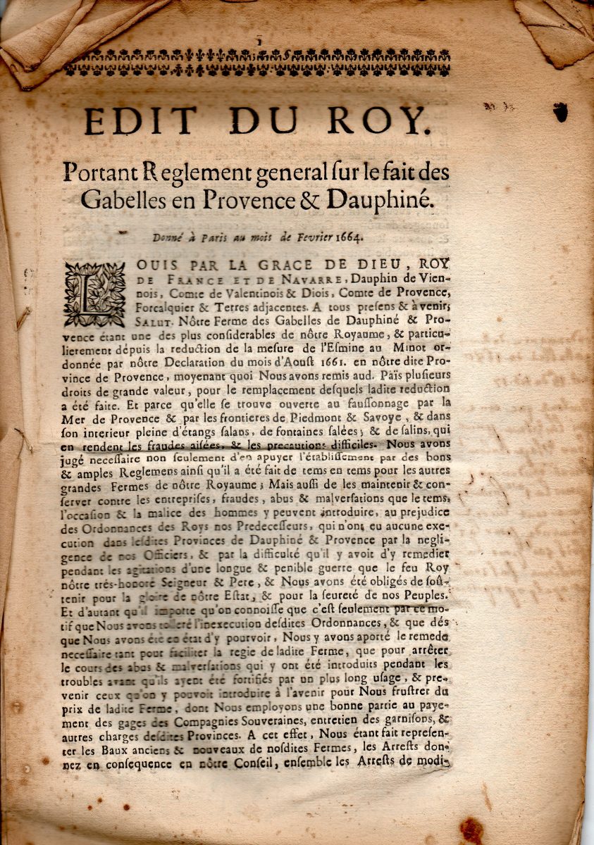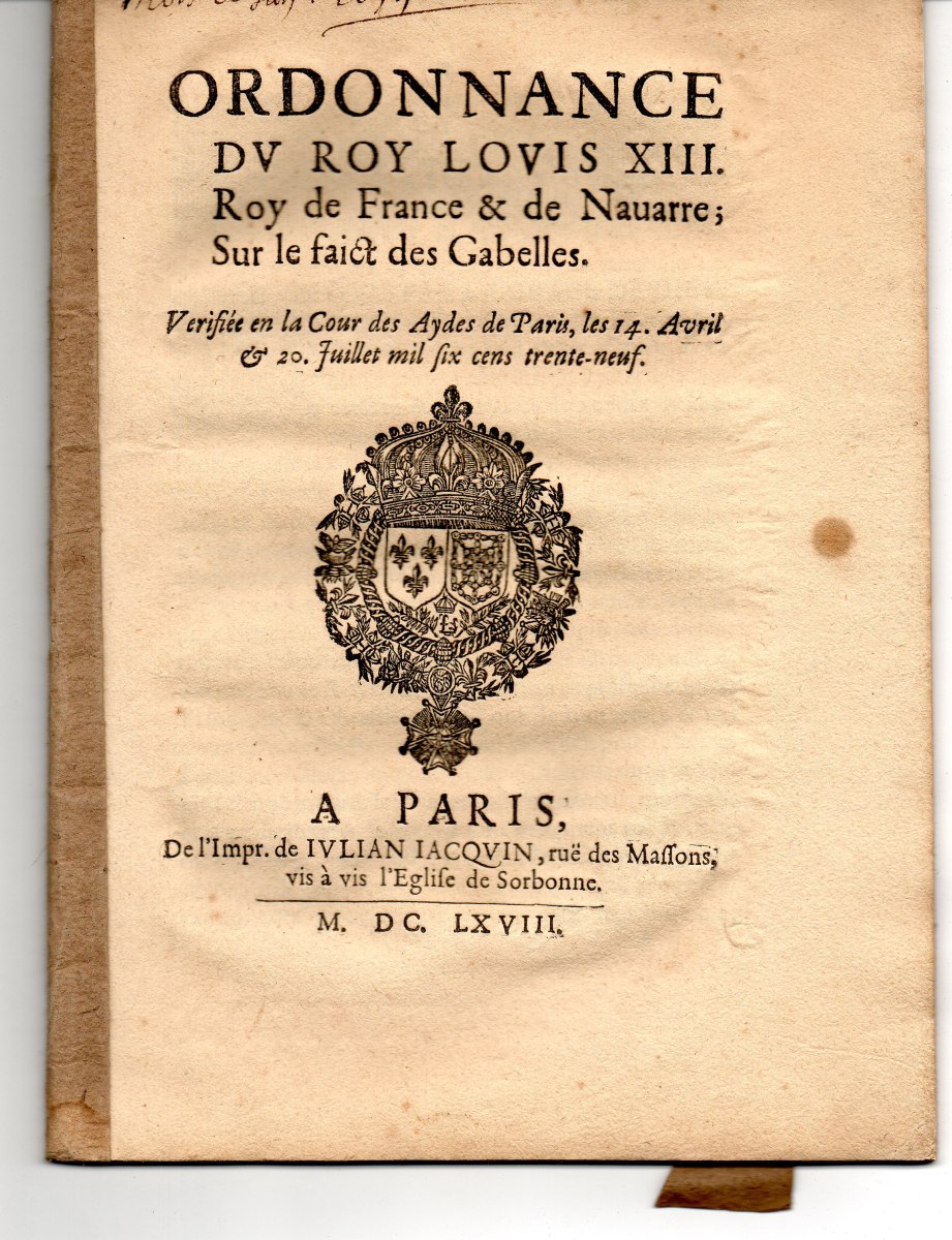 [IMPÔTS - GABELLE - BAUX et RÈGLEMENTS] - Lettres patentes, édits, déclarations, ordonnances, arrêts du conseil d'état du roi, arrêts de la cour des aydes et divers, relatifs au bail de la ferme générale des gabelles, aux règlements et à la jurisprudence de la perception du droit de gabelle.