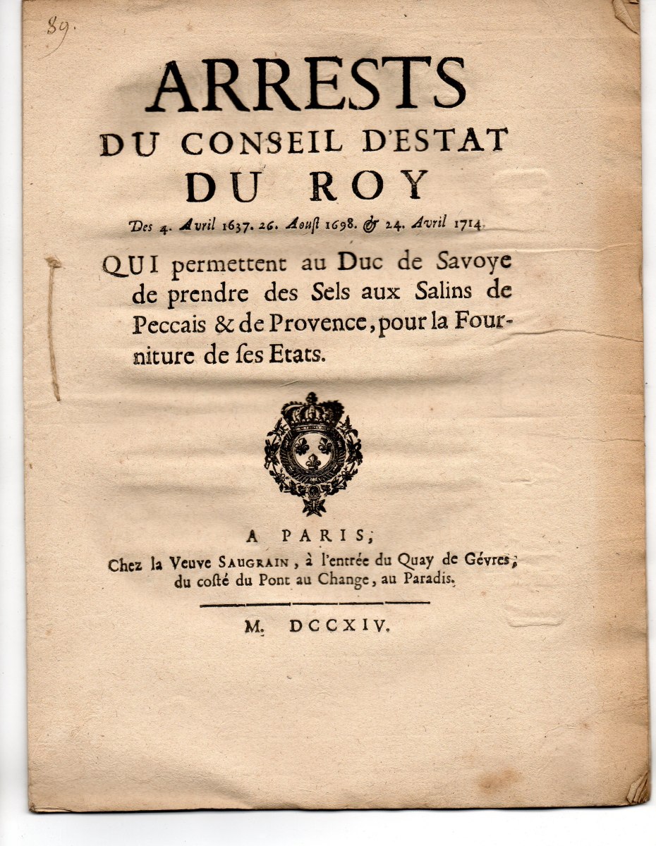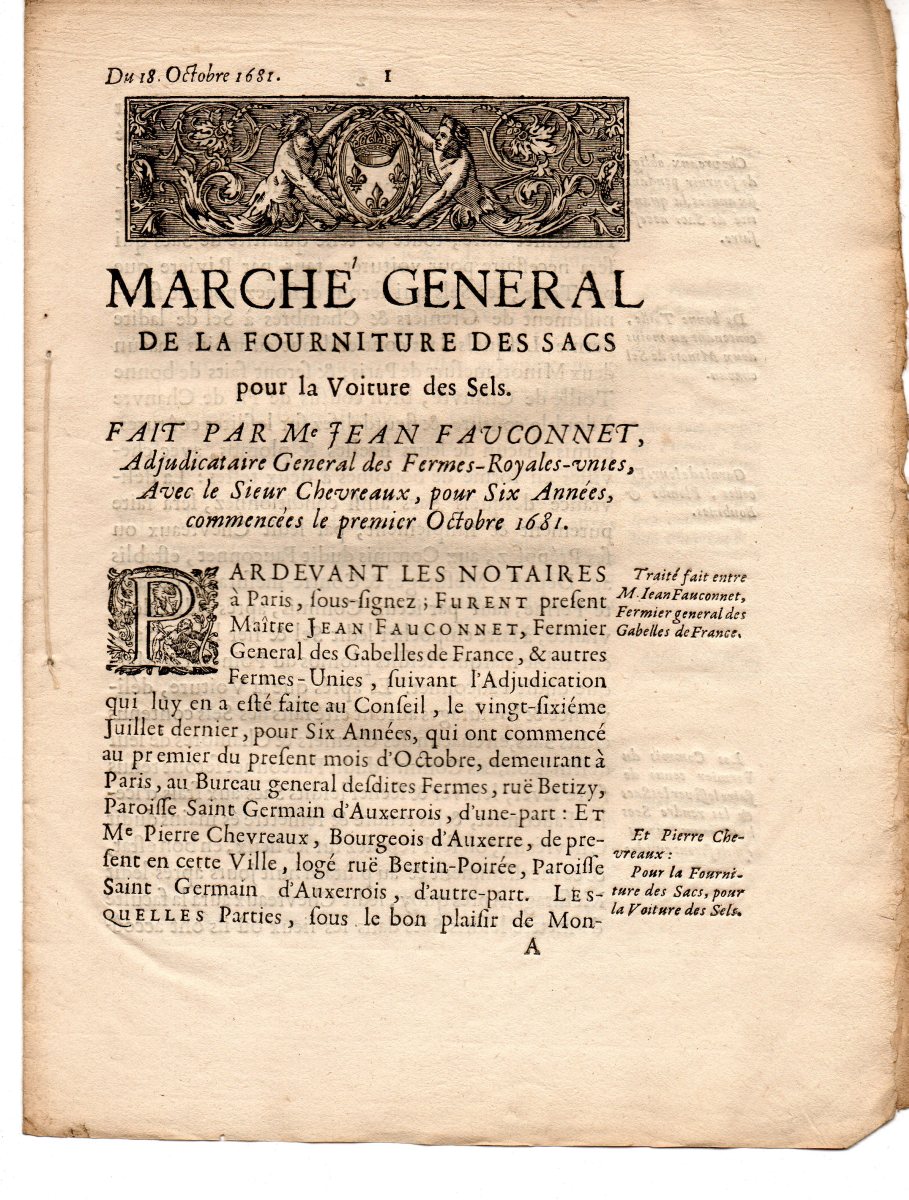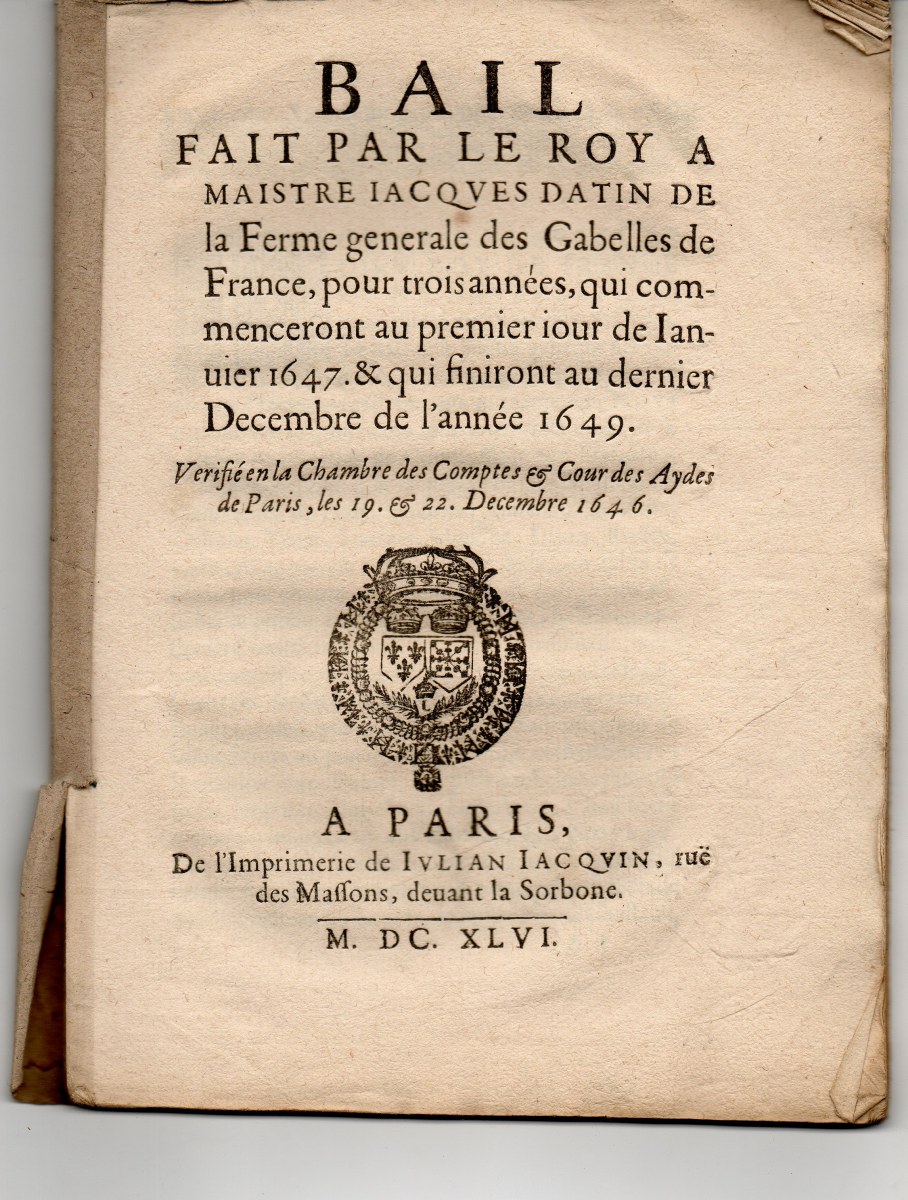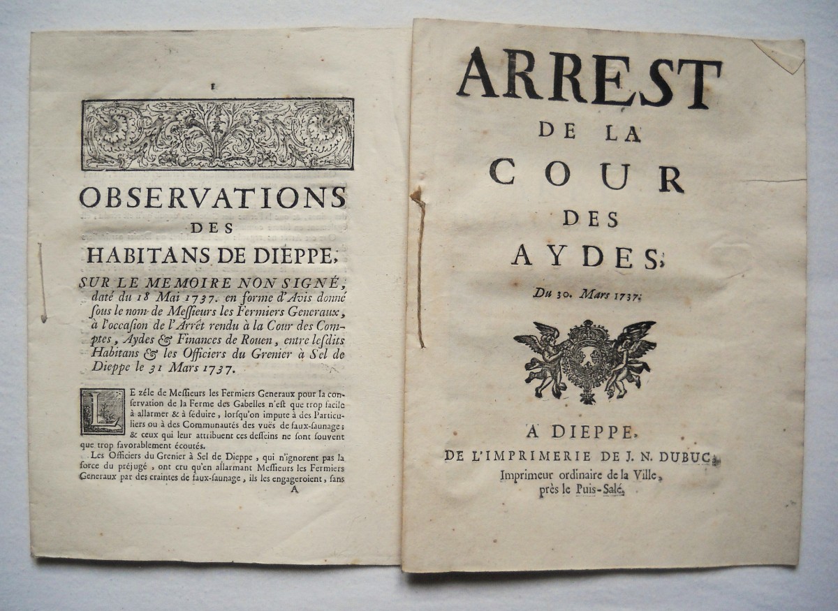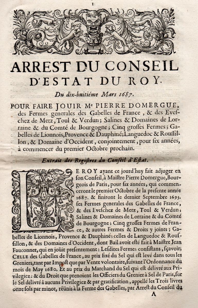 [IMPÔTS - GABELLE - BAUX et RÈGLEMENTS] - Lettres patentes, édits, déclarations, ordonnances, arrêts du conseil d'état du roi, arrêts de la cour des aydes et divers, relatifs au bail de la ferme générale des gabelles, aux règlements et à la jurisprudence de la perception du droit de gabelle.