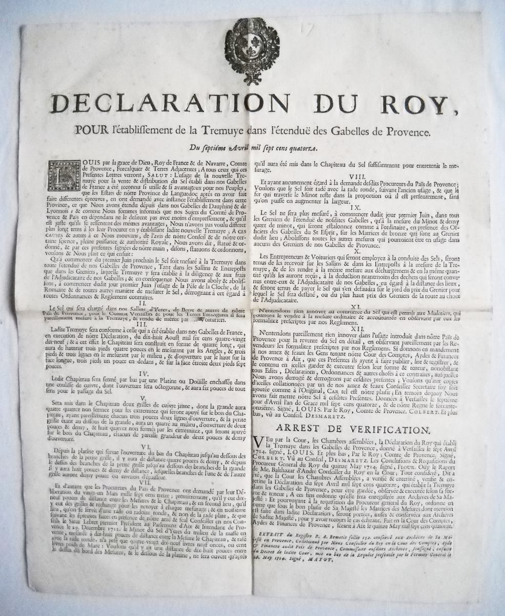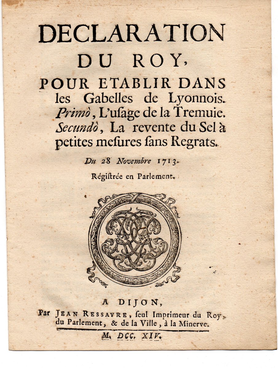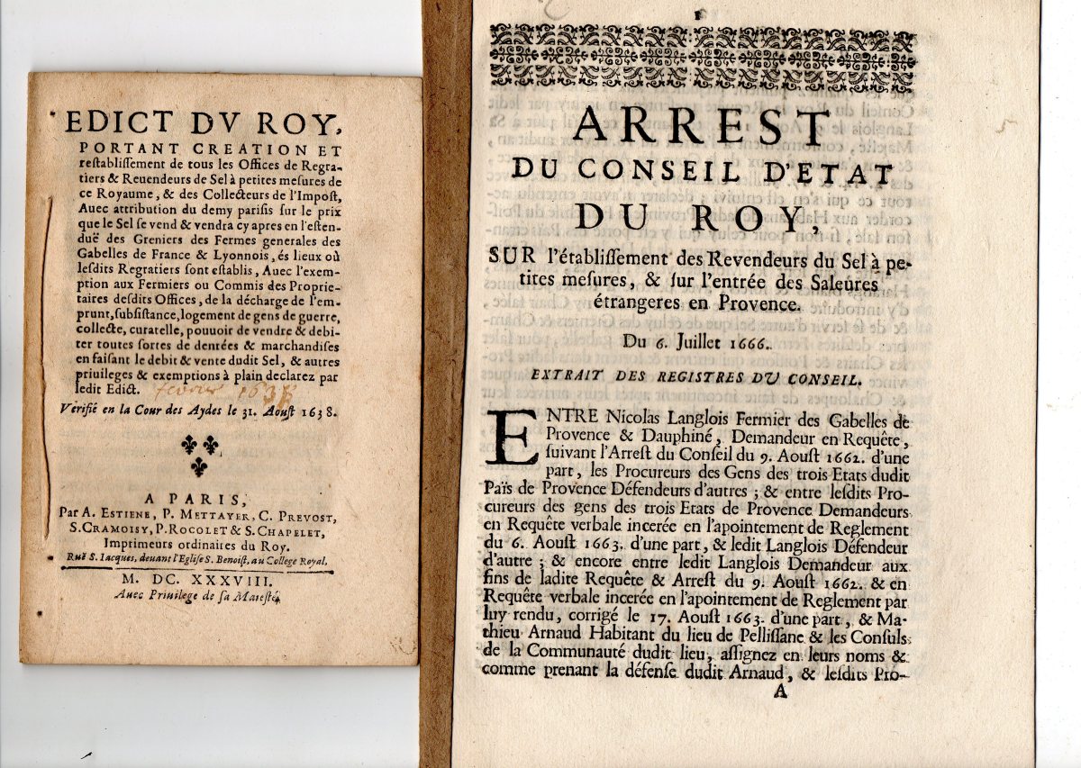[IMPÔTS - GABELLE - DROITS PARTICULIERS] - Lettres patentes, édits, déclarations, ordonnances, arrêts du conseil d'état du roi, arrêts de la cour des aydes et divers, relatifs aux différents types de droits de prélèvement et d'exemption sur le sel.
