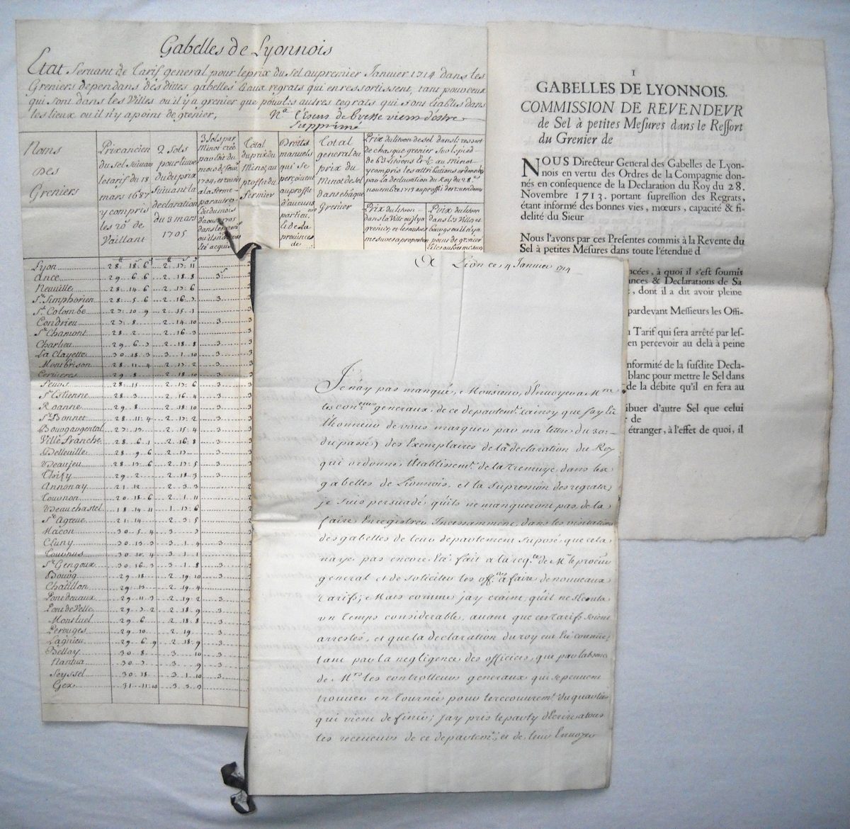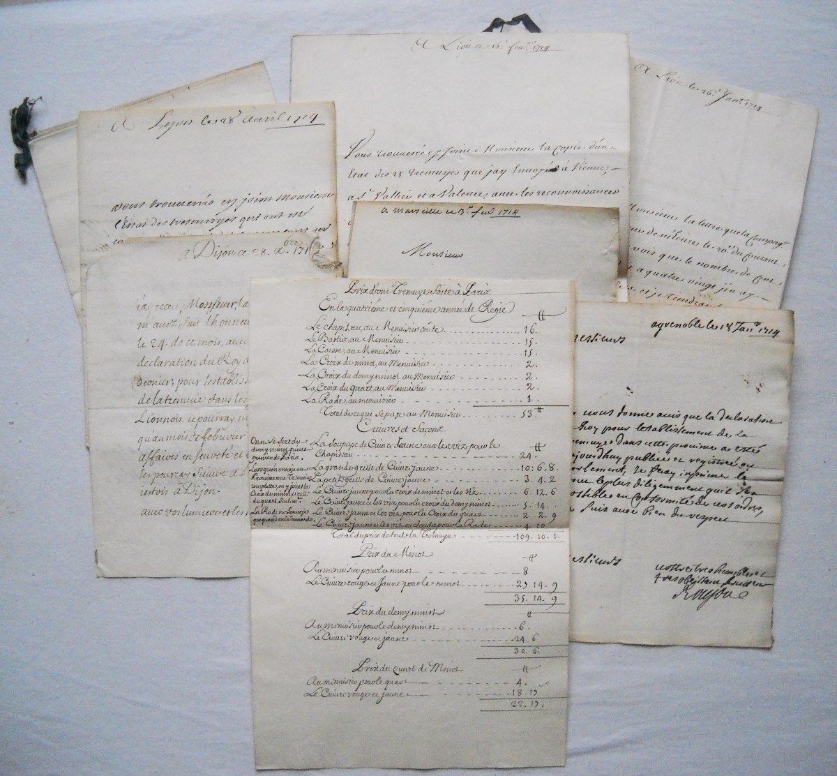 Env. 550 pièces imprimées et copies manuscrites, 1619-1788, tous formats ; et 19 L.A.S. ou L.S., 1713-1717, écrites de Lyon, Dijon, Grenoble, Marseille, Avignon et Genève, adressées à M. de la Porte, fermier général.