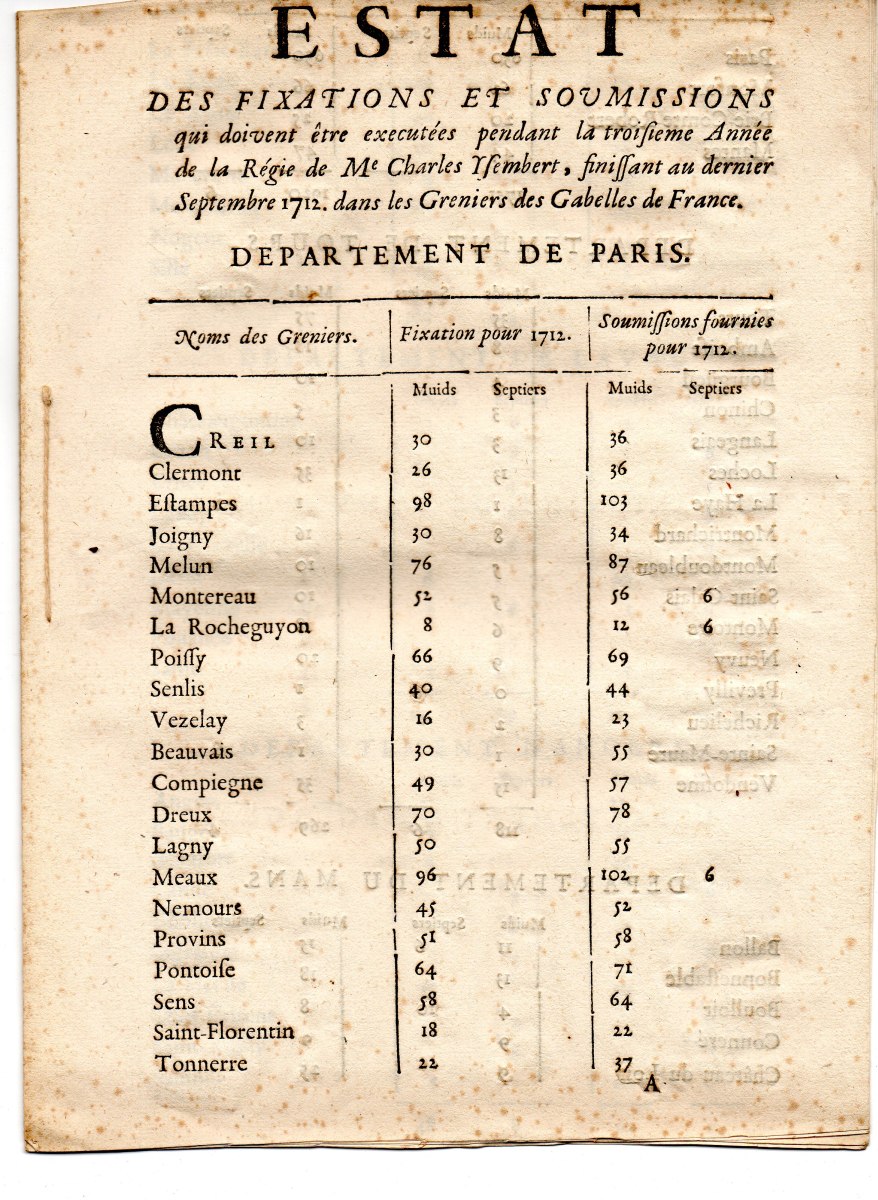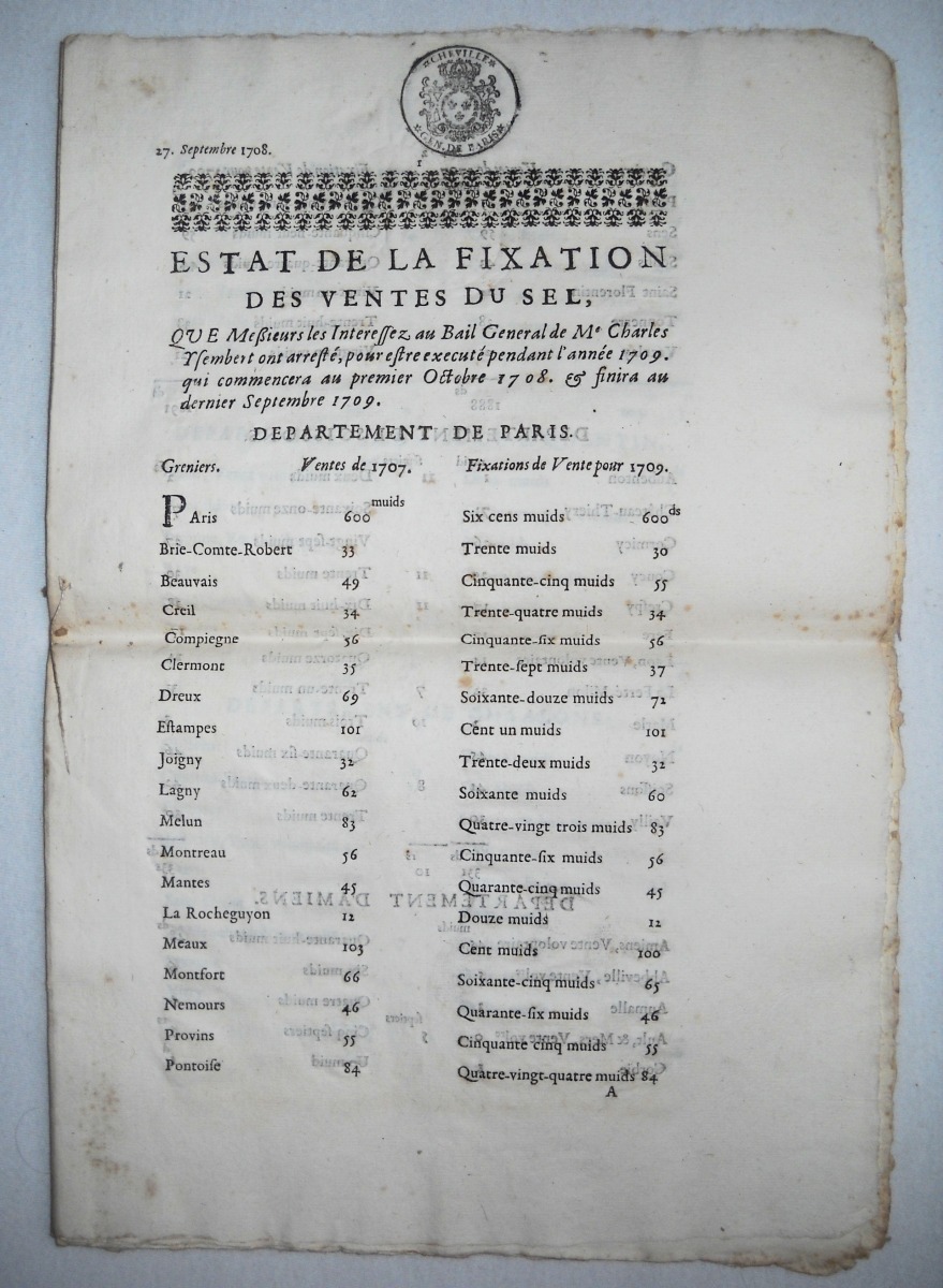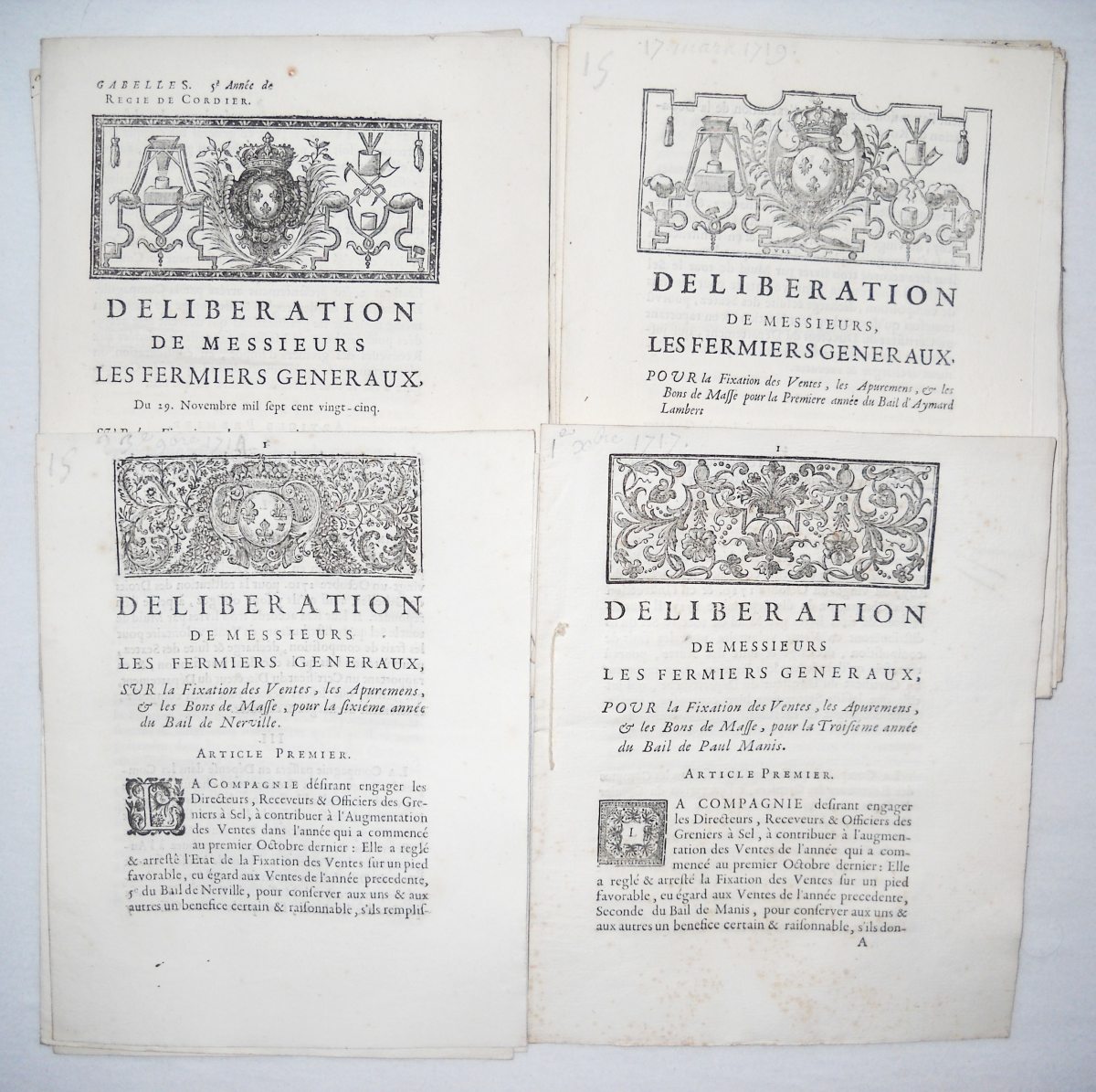 A Paris, chez Thomas Charpentier, 1681, 61 pp., in-8 - Edit de S.A.R. portant establissement de la gabelle & bannalité du tabac en Savoye, sous les conditions, astrictions, & peines portées par les articles suivants. A Chambéry, par Jean & Jacques Gorrin, 7 pp., in-8 - Estat de la fixation des ventes du sel pour estre exécuté pendant l'année 1709. 1708, 11 pp., in-fol. - Tarifs et sentence de messieurs les officiers du grenier à sel de Paris portant reglement pour le prix du sel tant de la ville de Paris que de la campagne. Charles Huguier, 1710, 4 pp., in-8 - Délibération de la compagnie sur la fixation des ventes, les apuremens & les bons de masse, 23 décembre 1712. 6 pp., in-8 - Edit du roy portant reglement pour l'arrondissement des greniers à sel de la direction d'Amiens