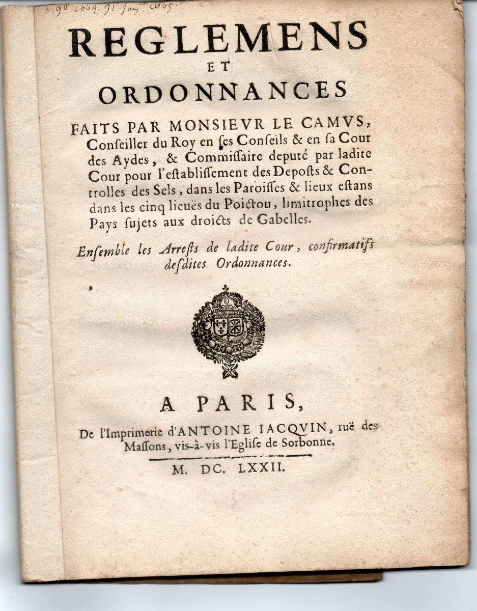 A Paris, par P. Mettayer, A. Estiene, & C. Prevost, 1627, 13 pp., in-12 - Establissement d'un grenier à sel en la ville de Grenoble. 1628, 8 pp., in-12 - Déclaration du roy portant diminution de la vente & prix du sel. A Paris, par Antoine Estiene, p. Mettayer & C. Prevost, 1631, 15 pp., in-12 - Reglemens et ordonnances faits par monsieur Le Camus, conseiller du roy en ses conseils & en la cour des aydes, & commissaire deputé par ladite cour pour l'establissement des deposts & controlles des sels, dans les paroisses & lieux estans dans les cinq lieues du Poictou, limitrophes des pays sujets aux droicts de gabelles. A Paris, Antoine Jacquin, 1672, 71 pp., in-8 - Ordonnances et reglements de monsieur de Fortia, conseiller du roy en ses conseils, maistre des requêtes oridinaire de son hostel, commisaire departy pour l'exécution des ordres de Sa Majesté dans la province d'Auvergne, pour la translation d'aucuns despots & controlles de sel, establis sur les limites des cinq lieues des provinces d'Auvergne, la Marche & Combrailles, dans d'autres villes & bourgs desdites provinces