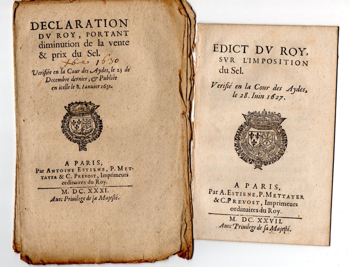 Edict du roy sur l'imposition du sel. A Paris, par A. Estiene, P. Mettayer & C. Prevost, 1627, 16 pp., in-16 - Arrest du conseil d'estat par lequel est ordonné aux officiers de chacun des greniers à sel de ce royaume, de dresser un estat, contenant le prix que se vend chacun minot de sel en leurs greniers