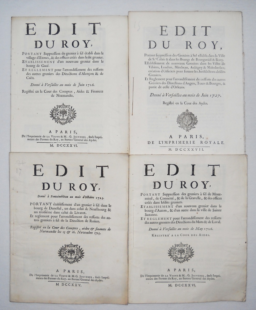 A Paris, Veuve & M-G. Jouvenel, 1725, 24 pp., in-8 - Plusieurs édits portant suppression et création de nouveaux greniers à sel dans diverses villes et bourgs du royaume - etc.