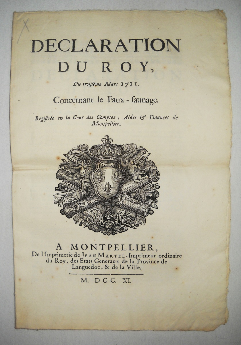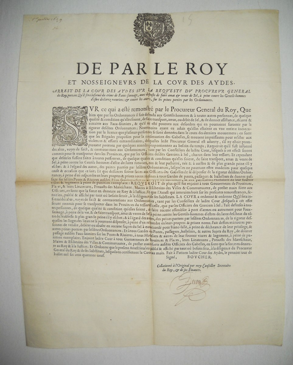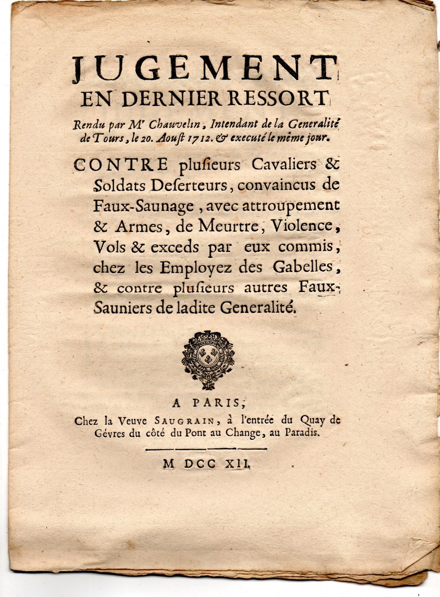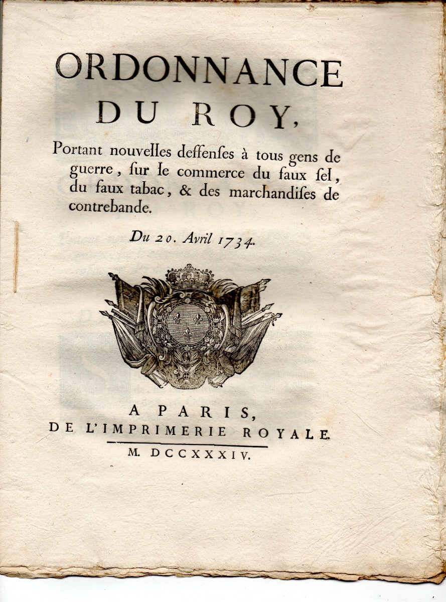 contre plusieurs volleurs de sel & faux-sauniers, 23 décembre 1670. A Paris, chez Thomas Charpentier, 11 pp., in-8 - Déclaration du roy contre les faux-sauniers. 1678, 4 pp., in-8 - Arrest de la cour des aydes qui condamne René Fillion dit le Dragon a estre rompu vif en la ville de Touars ; et Jean Roucher dit le boiteux à estre pendu, pour avoir fait le faux-saunage avec chevaux à port d'armes, & assassiné le nommé Dupernay, capitaine de la brigade à cheval de Courlay, &c ; 9 mai 1682. 37,5 x 49 cm - Déclaration du roy portant que les condamnations pecuniaires prononcées contre les femmes qui font le faux-saunage, seront exécutées contre les maris, 10 avril 1688. A Paris, chez François Muguet, 1688, 4 pp., in-8 - Ordre pour l'emprisonnement des faux-sauniers. 1691, 3 pp., in-8 - Ordonnance du roy pour empêcher que les troupes qui repassent dans le royaume, allant en leurs quartiers d'hyver, n'y apportent aucunes marchandises etrangeres, faux-sel, ny tabac, 17 octobre 1695. 35 x 46 cm - Déclaration du roy portant peine de mort contre les faux-sauniers attroupez & armés. 1704, 4 pp., in-8 - Déclaration du roy concernant le faux-saunage, 3 mars 1711. A Montpellier, Jean Martel, 1711, 8 pp., in-fol. - Arrest de la cour des aydes portant reglement pour les employez & gardes des gabelles concernans leurs fonctions & les deffenses de chasser, 19 juin 1716. A Paris, chez la veuve Saugrain, 3 pp., in-8 - Ordonnance du roy portant nouvelles deffenses à tous gens de guerre, sur le commerce du faux sel, du faux tabac, & des marchandises de contrebande, 20 avril 1734. A Paris, de l'imprimerie royale, 1734, 24 pp., in-4 - Lettres patentes du roi portant défenses de nourrir & de vendre des chiens mâtins, propres à servir à la fraude du sel & du tabac, 7 mai 1782. A Paris, chez Knapen & fils, 4 pp., in-4 - etc.