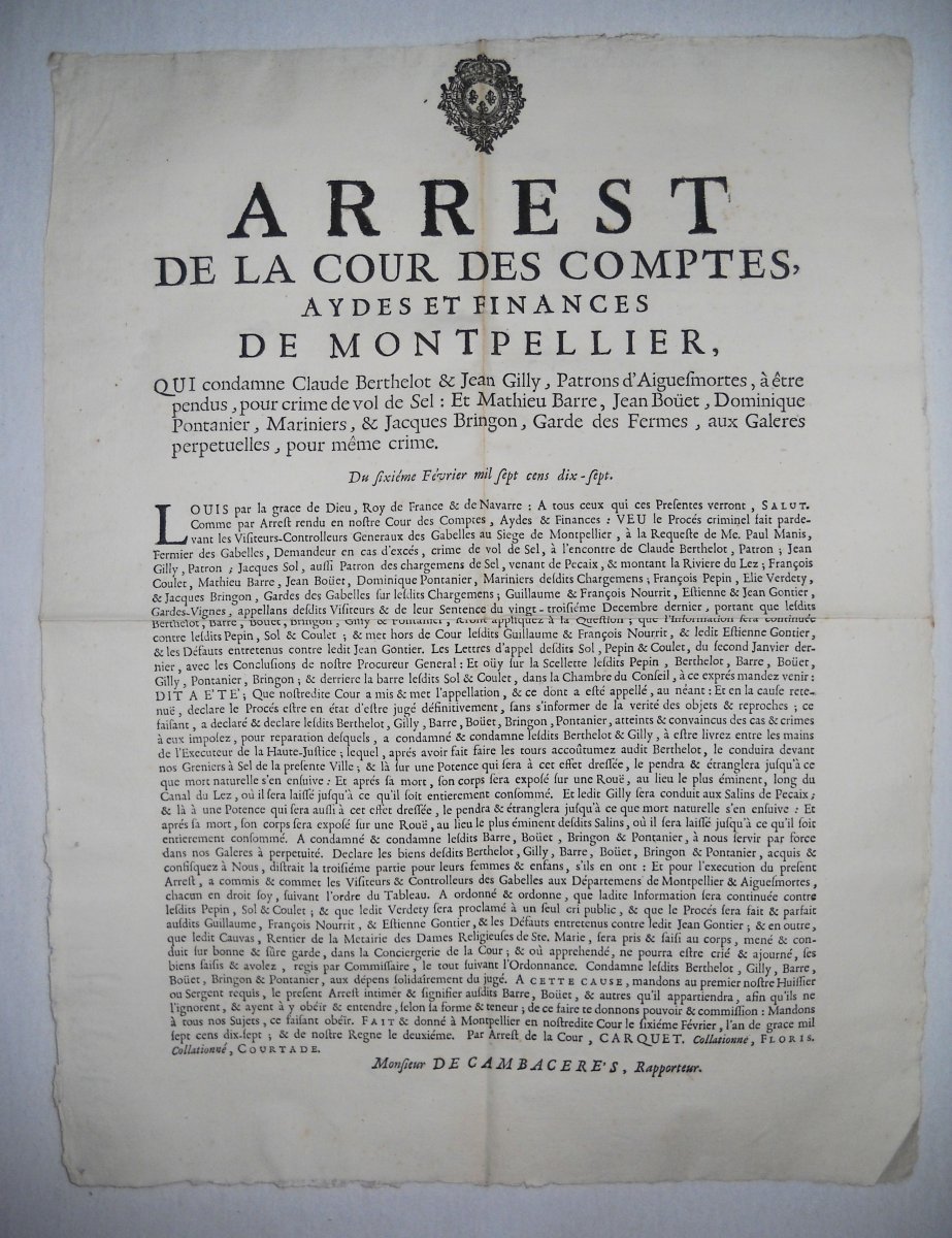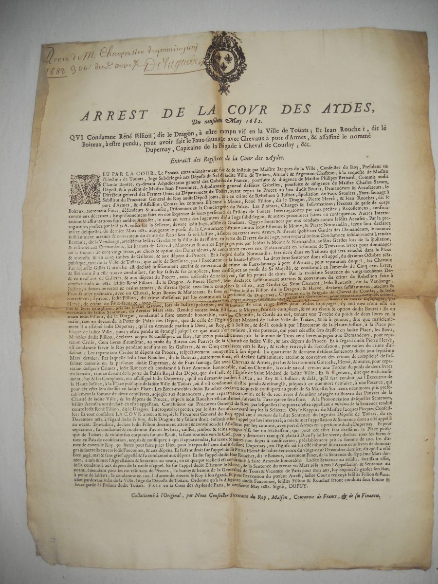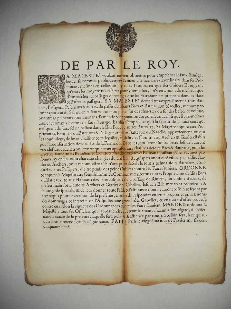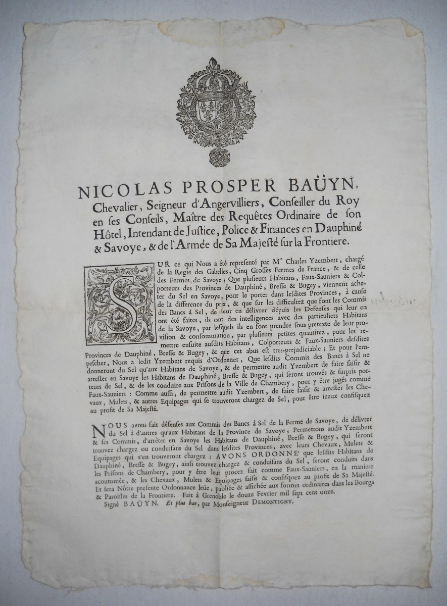 contre plusieurs volleurs de sel & faux-sauniers, 23 décembre 1670. A Paris, chez Thomas Charpentier, 11 pp., in-8 - Déclaration du roy contre les faux-sauniers. 1678, 4 pp., in-8 - Arrest de la cour des aydes qui condamne René Fillion dit le Dragon a estre rompu vif en la ville de Touars ; et Jean Roucher dit le boiteux à estre pendu, pour avoir fait le faux-saunage avec chevaux à port d'armes, & assassiné le nommé Dupernay, capitaine de la brigade à cheval de Courlay, &c ; 9 mai 1682. 37,5 x 49 cm - Déclaration du roy portant que les condamnations pecuniaires prononcées contre les femmes qui font le faux-saunage, seront exécutées contre les maris, 10 avril 1688. A Paris, chez François Muguet, 1688, 4 pp., in-8 - Ordre pour l'emprisonnement des faux-sauniers. 1691, 3 pp., in-8 - Ordonnance du roy pour empêcher que les troupes qui repassent dans le royaume, allant en leurs quartiers d'hyver, n'y apportent aucunes marchandises etrangeres, faux-sel, ny tabac, 17 octobre 1695. 35 x 46 cm - Déclaration du roy portant peine de mort contre les faux-sauniers attroupez & armés. 1704, 4 pp., in-8 - Déclaration du roy concernant le faux-saunage, 3 mars 1711. A Montpellier, Jean Martel, 1711, 8 pp., in-fol. - Arrest de la cour des aydes portant reglement pour les employez & gardes des gabelles concernans leurs fonctions & les deffenses de chasser, 19 juin 1716. A Paris, chez la veuve Saugrain, 3 pp., in-8 - Ordonnance du roy portant nouvelles deffenses à tous gens de guerre, sur le commerce du faux sel, du faux tabac, & des marchandises de contrebande, 20 avril 1734. A Paris, de l'imprimerie royale, 1734, 24 pp., in-4 - Lettres patentes du roi portant défenses de nourrir & de vendre des chiens mâtins, propres à servir à la fraude du sel & du tabac, 7 mai 1782. A Paris, chez Knapen & fils, 4 pp., in-4 - etc.