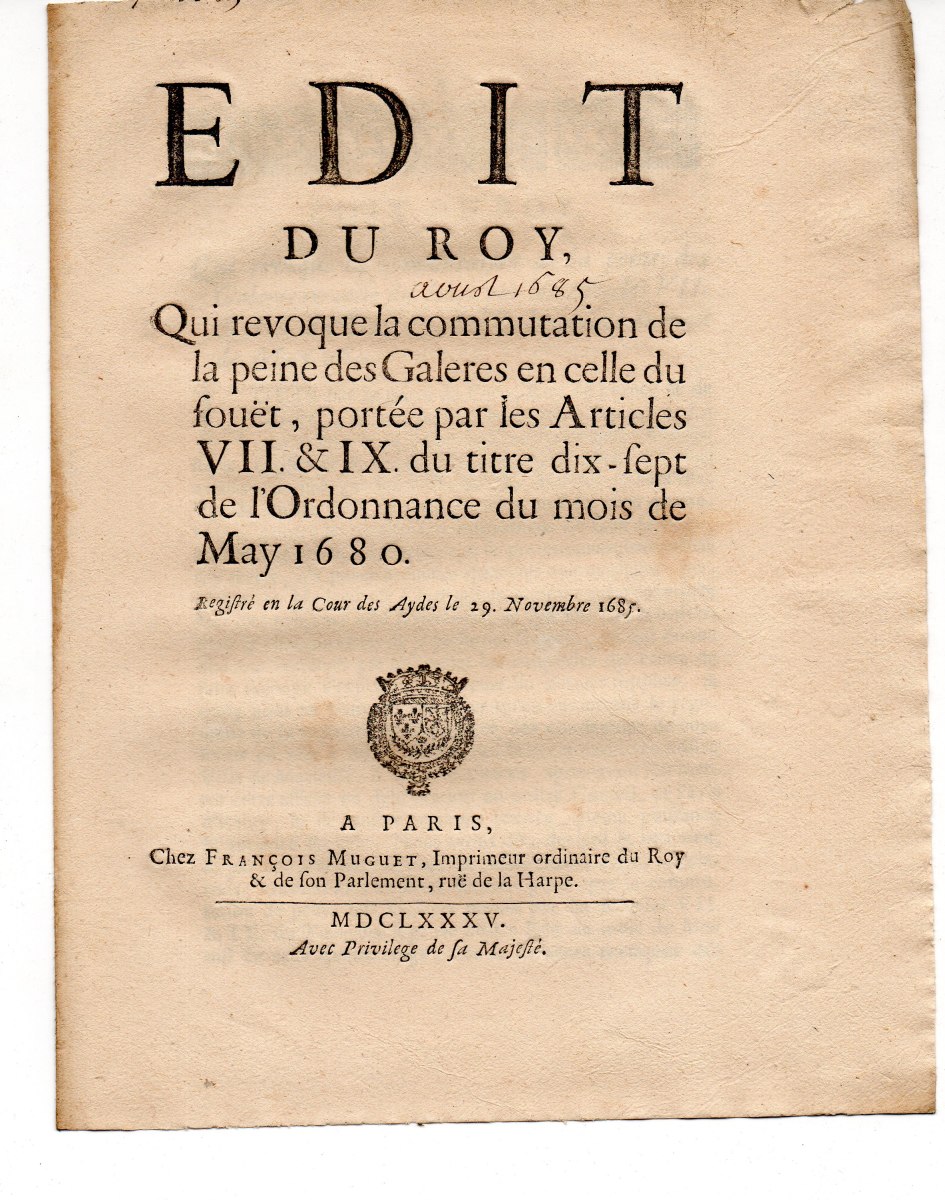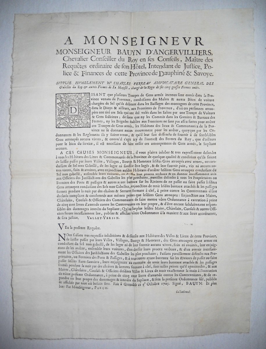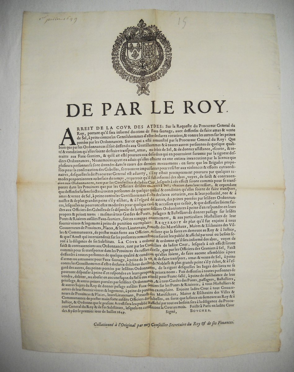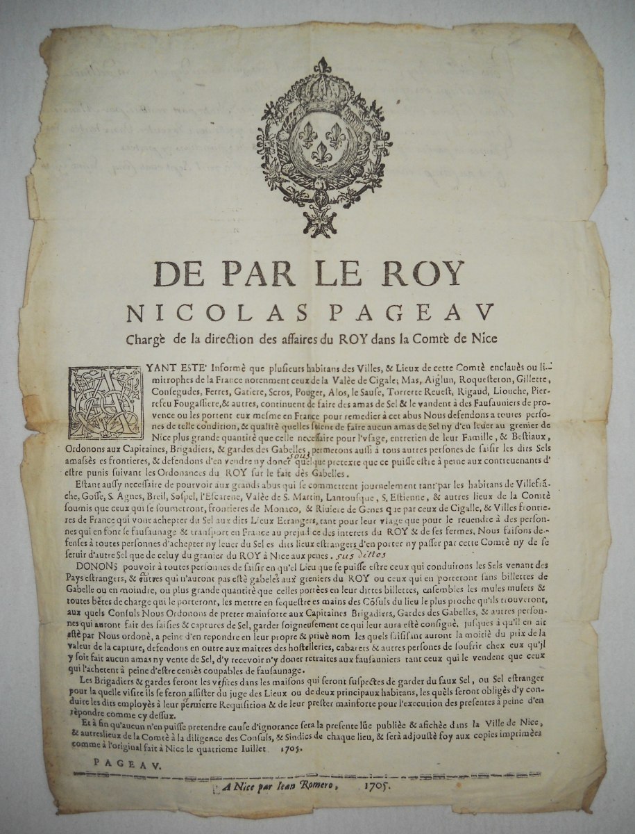 contre plusieurs volleurs de sel & faux-sauniers, 23 décembre 1670. A Paris, chez Thomas Charpentier, 11 pp., in-8 - Déclaration du roy contre les faux-sauniers. 1678, 4 pp., in-8 - Arrest de la cour des aydes qui condamne René Fillion dit le Dragon a estre rompu vif en la ville de Touars ; et Jean Roucher dit le boiteux à estre pendu, pour avoir fait le faux-saunage avec chevaux à port d'armes, & assassiné le nommé Dupernay, capitaine de la brigade à cheval de Courlay, &c ; 9 mai 1682. 37,5 x 49 cm - Déclaration du roy portant que les condamnations pecuniaires prononcées contre les femmes qui font le faux-saunage, seront exécutées contre les maris, 10 avril 1688. A Paris, chez François Muguet, 1688, 4 pp., in-8 - Ordre pour l'emprisonnement des faux-sauniers. 1691, 3 pp., in-8 - Ordonnance du roy pour empêcher que les troupes qui repassent dans le royaume, allant en leurs quartiers d'hyver, n'y apportent aucunes marchandises etrangeres, faux-sel, ny tabac, 17 octobre 1695. 35 x 46 cm - Déclaration du roy portant peine de mort contre les faux-sauniers attroupez & armés. 1704, 4 pp., in-8 - Déclaration du roy concernant le faux-saunage, 3 mars 1711. A Montpellier, Jean Martel, 1711, 8 pp., in-fol. - Arrest de la cour des aydes portant reglement pour les employez & gardes des gabelles concernans leurs fonctions & les deffenses de chasser, 19 juin 1716. A Paris, chez la veuve Saugrain, 3 pp., in-8 - Ordonnance du roy portant nouvelles deffenses à tous gens de guerre, sur le commerce du faux sel, du faux tabac, & des marchandises de contrebande, 20 avril 1734. A Paris, de l'imprimerie royale, 1734, 24 pp., in-4 - Lettres patentes du roi portant défenses de nourrir & de vendre des chiens mâtins, propres à servir à la fraude du sel & du tabac, 7 mai 1782. A Paris, chez Knapen & fils, 4 pp., in-4 - etc.
