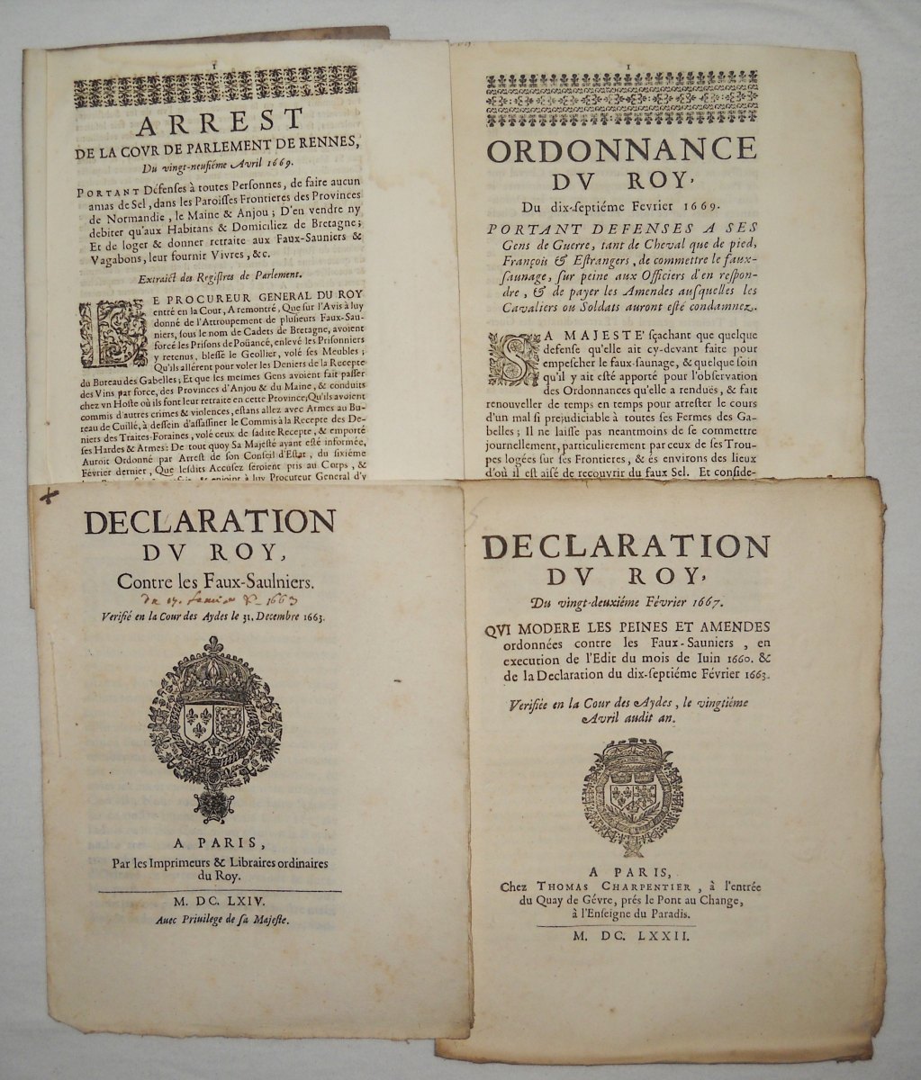 7 mars 1657. 3 pp., in-fol. - Ordonnance du roy portant defenses a ses gens de guerre, tant de cheval que de pied, François & estrangers, de commettre le faux-saunage, sur peine aux officiers d'en respondre, & de payer les amendes auxquelles les cavaliers ou soldats auront esté condamnez, 7 février 1669. 3 pp., in-8 - Arrest de la cour de parlement de Rennes portant défenses à toutes personnes, de faire aucun amas de sel, dans les paroisses frontières des provinces de Normandie, le Maine & Anjou ; d'en vendre ny debiter qu'aux habitans & domiciliez de Bretagne ; et de loger & donner retraite aux faux-sauniers & vagabons, leur fournir vivre, &c, 29 avril 1669. 32 pp., in-8 - Arrest de la cour des aydes de Normandie portant condamnation de mort, des galères, amende honorable, bannissement, amendes