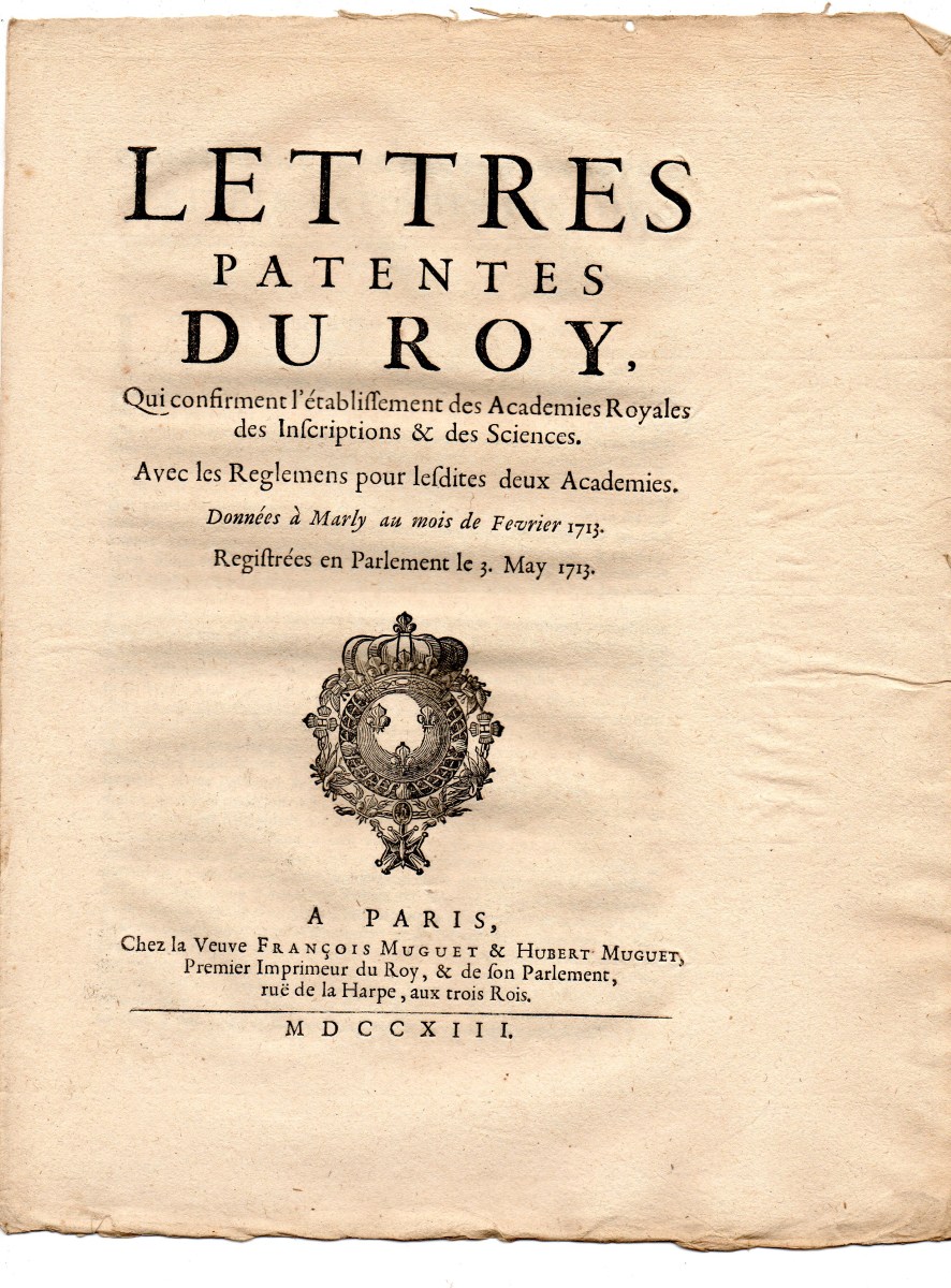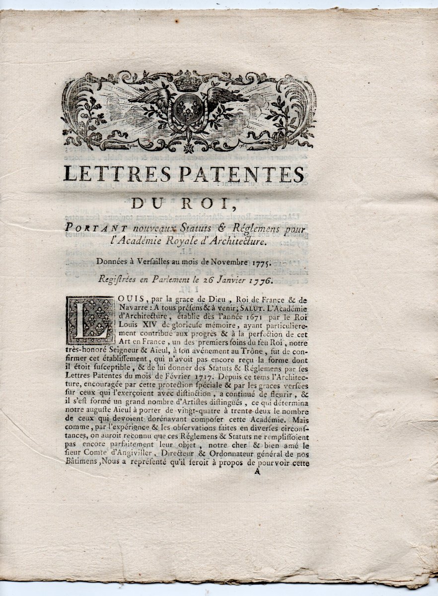 Lettres patentes du roy qui confirment l'établissement des Académies royales des Inscriptions & des Sciences avec les reglemens pour lesdites Academies. A Paris, chez la veuve François Muguet & Hubert Muguet, 1713, 12 pp. - Lettres patentes portant établissement d'une Academie d'Architecture. A Paris, chez la veuve de François Muguet, Hubert Muguet & Louis Denis de la Tour, 1717, 8 pp. - Lettres patentes du roi portant nouveaux statuts & règlemens pour l'Académie royale d'Architecture. A Paris, chez P.G. Simon, 1776, 12 pp. - Arrest du conseil d'état du roi concernant l'Ecole royale gratuite de dessin, du 13 avril 1776. A Paris, de l'imprimerie royale, 1776, 3 pp. - Déclaration du roi en faveur de l'Académie royale de peinture & de sculpture. A Paris, chez P.G. Simon, 1777, 23 pp. - etc.