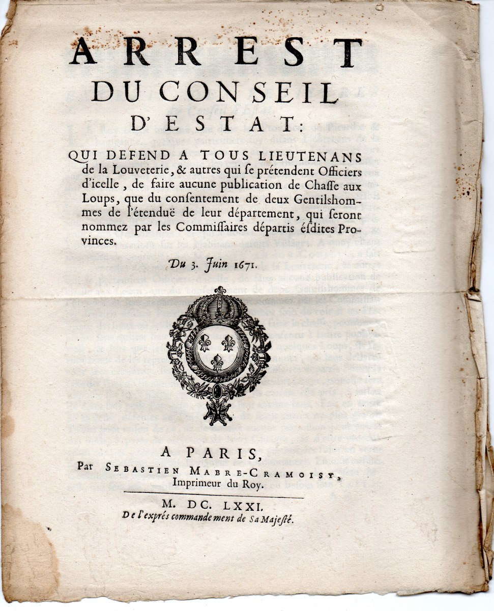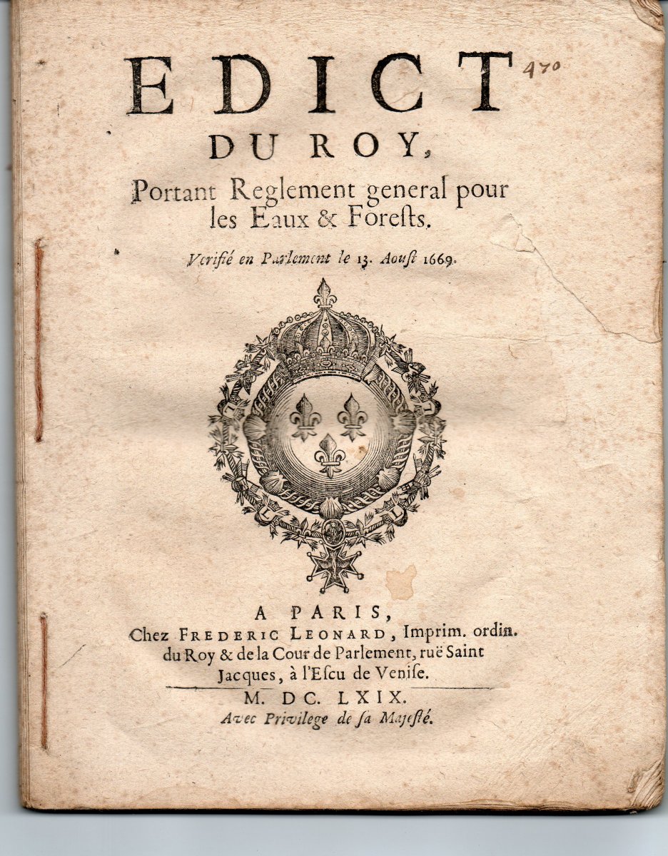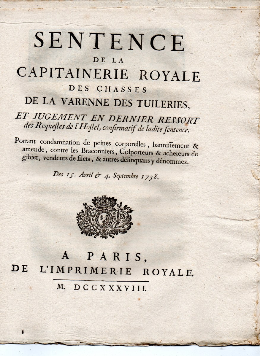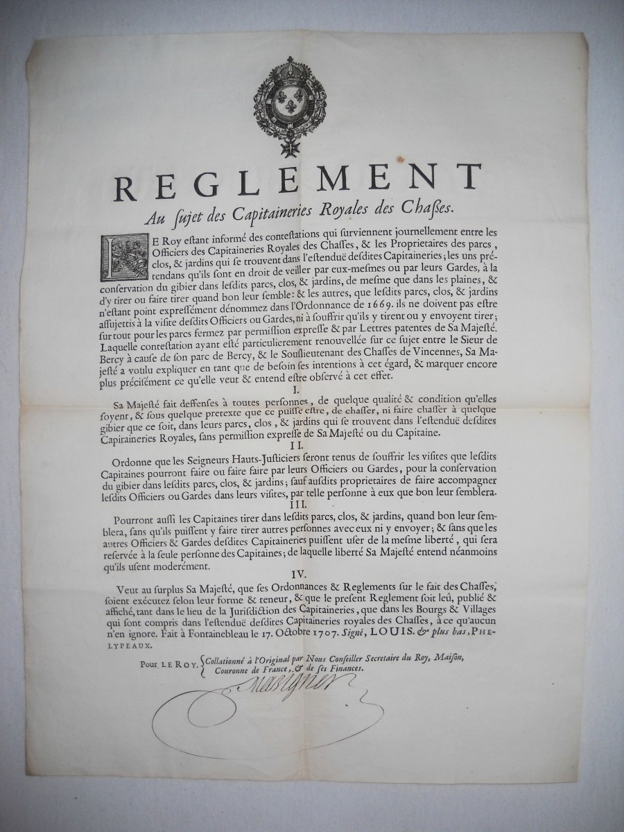 A Paris, par P. Mettayer, A. Estiene & P. Rocolet, 1637, 15 pp., in-16 - Arrests de la cour de parlement de Dauphiné concernans le port des armes defendues et reglement general pour le faict de la chasse & de la pesche. 1659, 4 pp., in-8 - Edict du roy pour faire couper dans les forests de Sa Majesté, jusques à la somme de douze cens mille livres de bois, par ventes extraordinaires. A Paris, 1653, 6 pp., in-8 - Edict du roy portant reglement general pour les eaux & forests. A Paris chez Frederic Leonard, 1669, 94 pp. et table, in-8 - Arrest du conseil d'estat qui defend à tous lieutenans de la louverie & autres qui se pretendent officiers d'icelle, de faire aucune publication de chasse aux loups, que du consentement de deux gentilshommes de l'étendue de leur département, qui seront nommez par les commissaires départis esdites provinces, 3 juin 1671. A Paris, par Sébastien Mabre-Cramoisy, 1671, 4 pp., in-8 - Déclaration ud roy qui règle les départements des eaux et forests, décembre 1675. A Paris, par Sébastien Mabre-Crazmoisy, 1676, 8 pp., in-4 - Déclaration du roy concernant le fait des chasses. A Paris, chez Antoine Fournot, 1687, 4 pp., in-8 - Edit du roy pour l'étendue de la capitainerie des chasses de Fontainebleau, novembre 1687. A Paris, chez Estienne Michallet, 1688, 7 pp., in-4 - Edit du roy portant creation de seize grands maistres des eaux & forests. A Paris, chez Frederic Leonard, 1689, 10 pp., in-8 - Déclaration du roy portant reglement pour la capitainerie royale des chasses de Blois, 21 avril 1698. A Paris, chez François Muguet, 1698, 4 pp., in-8 - Reglement au sujet des capitaineries royales des chasses, octobre 1707. 37 x 49 cm - Edit du roy qui supprime les offices d'inspecteurs-conservateurs généraux des eaux & forêts & qui crée d'autres offices, mars 1708. A Paris, de l'imprimerie royale, 1743, 20 pp., in-4 - Ordonnance du roy concernant la chasse & les braconniers. 1715, A Paris, chez Jean de la Caille, 3 pp., in-8 - Lettres patentes portant qu'il sera marqué quarante pieds d'arbres dans la forest de Chambord, pour le remplacement des poutres pourries au chasteau de Chambord, 24 novembre 1724. A Paris, chez Pierre Simon, 1725, 3 pp., in-4 - Ordonnance de reglement pour les chasses en exécution des ordres du roy, portant défenses à toutes personnes de quelque qualité & condition qu'elles soient, de chasser pendant deux années dans l'étendue de la capitainerie de la Varenne du Louvre, 29 aoust 1726. A Paris, chez la veuve Saugrain & Pierre Prault, 1726, 7 pp., in-4 - Reglemens generaux et particuliers de reformation pour la maitrise des eaux et forets d'Arques, département de Rouen. A Paris, chez Pierre Prault, 1735, 27 pp., in-4 - Edit du roy portant création d'une maistrise particulière des eaux & forests en la ville de Pau, avril 1738. A Paris, de l'imprimerie royale, 1738, 12 pp., in-4 - Sentence de la capitainerie royale des chasses de la varenne des Tuileries portant condamnation de peines corporelles, bannissement & amende, contre les braconniers, colporteurs & acheteurs de gibier, vendeurs de filets, & autres délinquans y dénommez, 4 septembre 1738. A Paris, de l'imprimerie royale, 1738, 20 pp., in-4 - Arrêt du conseil d'état du roi, portant règlement pour les chasses aux loups, 15 janvier 1785. A Paris, de l'imprimerie royale, 1785. 7 pp., in-4 - Ordonnance du roi concernant la chasse, 10 août 1789. A Paris, chez N.H. Nyon, 1789, 2 pp., in-4 - Edit du roi portant suppression de la capitainerie de Chambord, septembre 1777. A Paris, chez P.G. Simon, 4 pp., in-4 - etc.