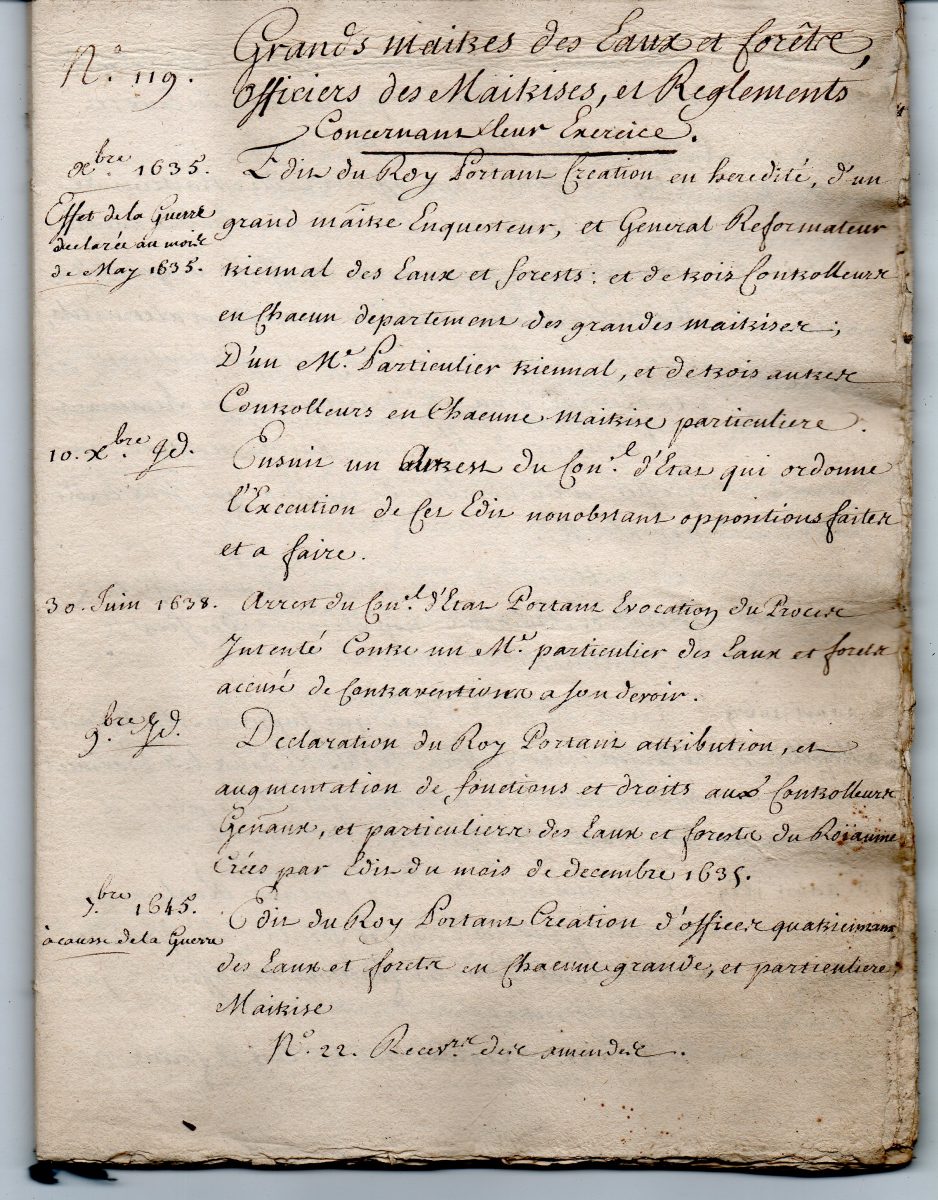 Répertoire des documents législatifs et réglementaires intitulé " Reglements ", 1565-1725, cahier manuscrit, 22 ff., in-8 -Edict du roy portant creation en heredité d'un grand maistre enquesteur & general reformateur triennal des Eaues & forests et de trois controlleurs en chacun departement des grandes maistrises
