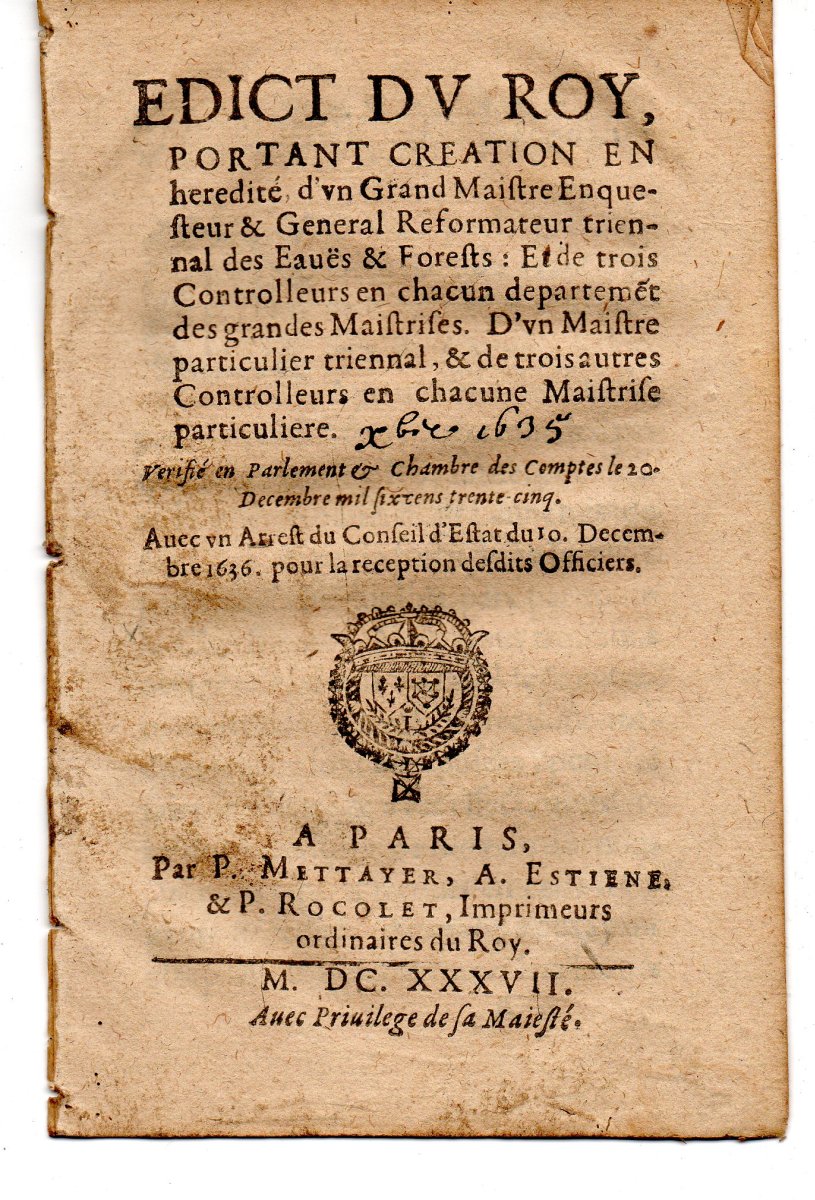 - [CHASSE - EAUX et FORÊTS] - Lettres patentes, édits, déclarations, ordonnances, arrêts du conseil d'état du roi, arrêts de la cour de parlement, et divers, relatifs à l'administration, à la règlementation et au statut des officiers des eaux et forêts (coupes de bois, chasse, pêche, loups, braconnage, etc.).
