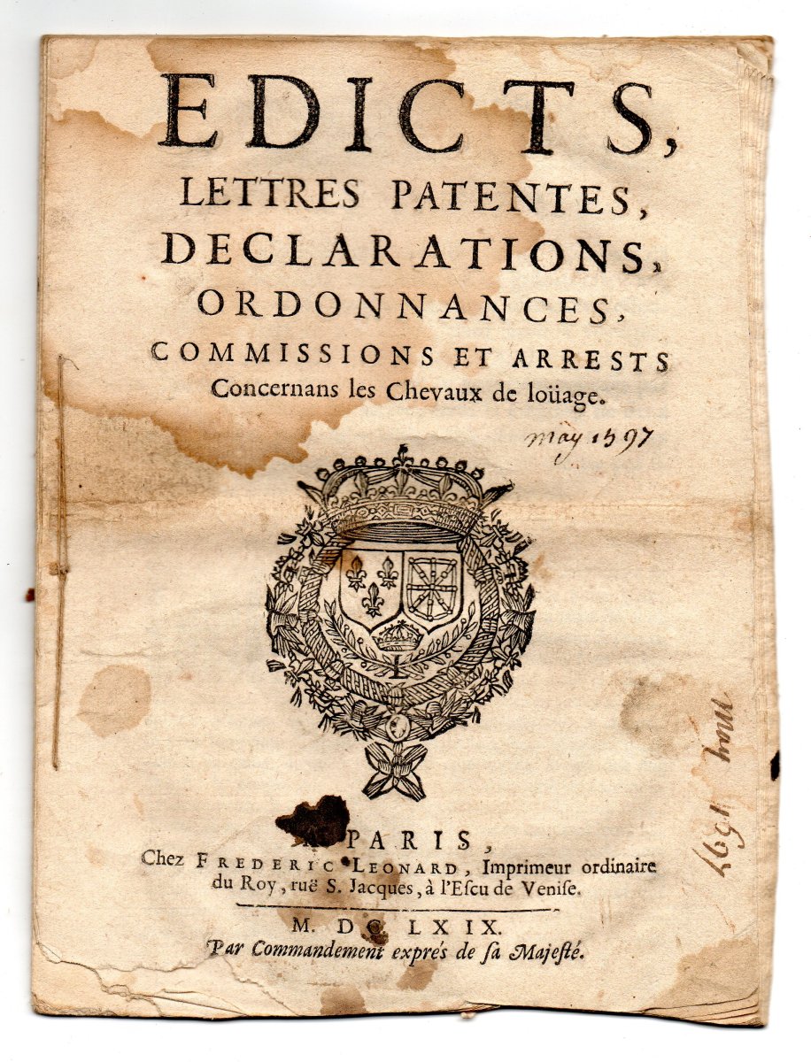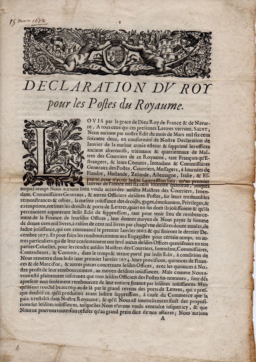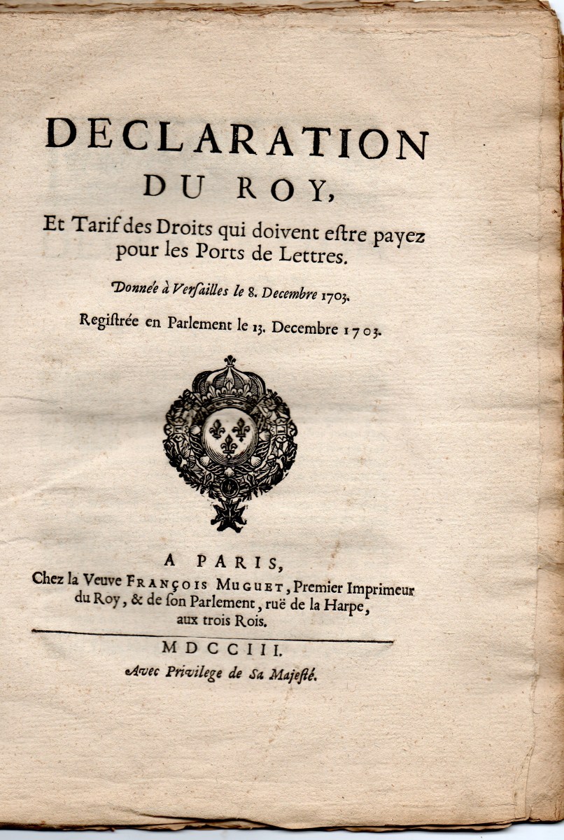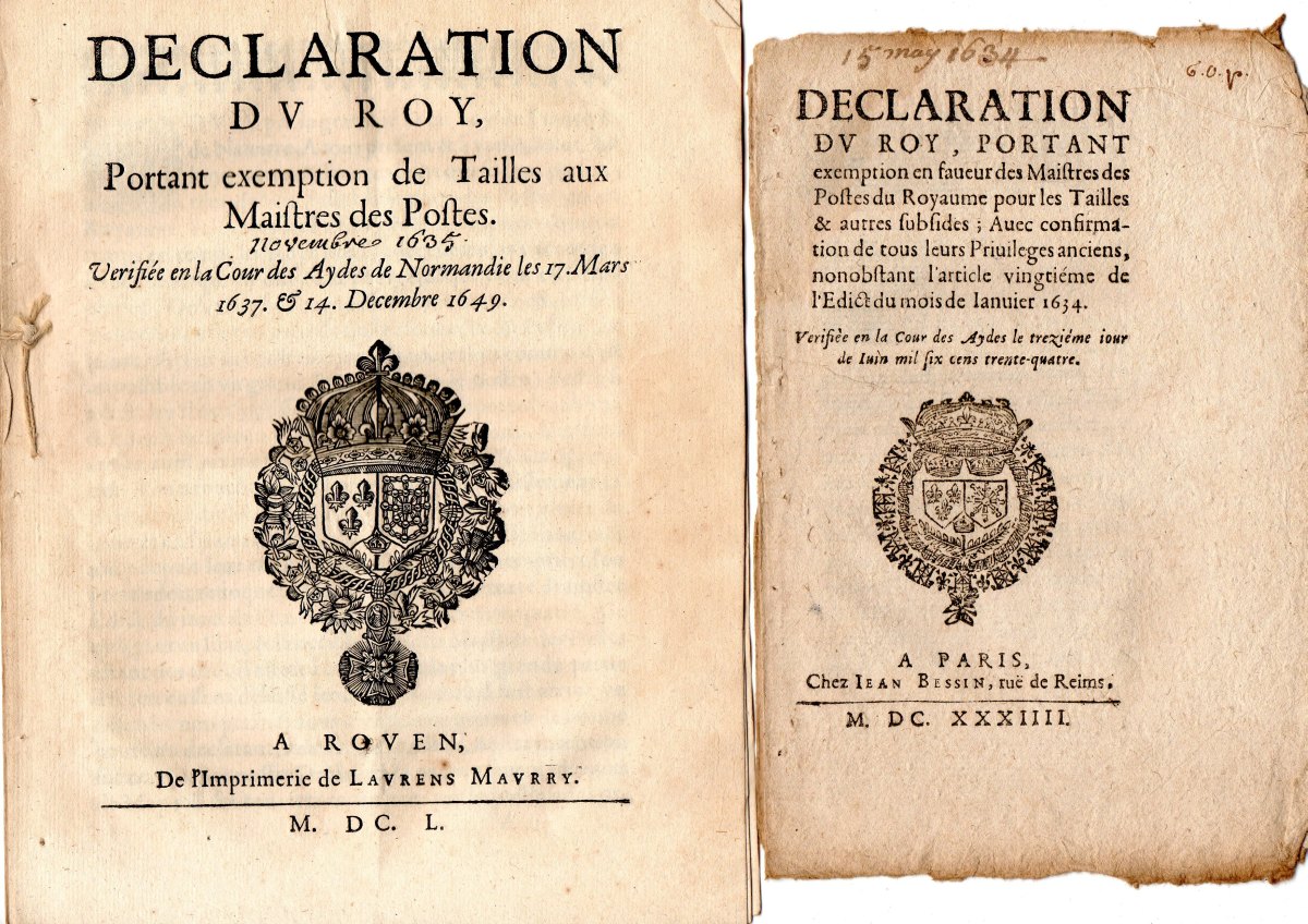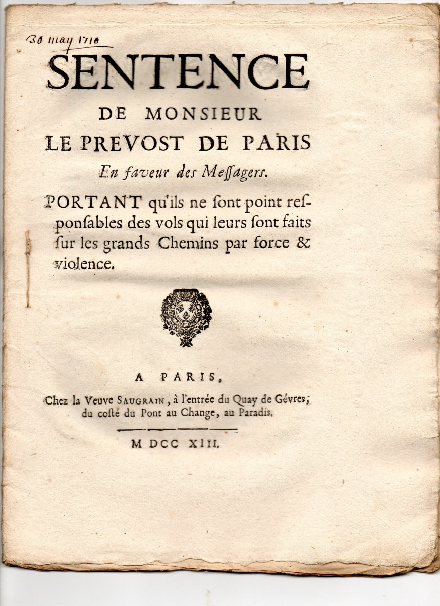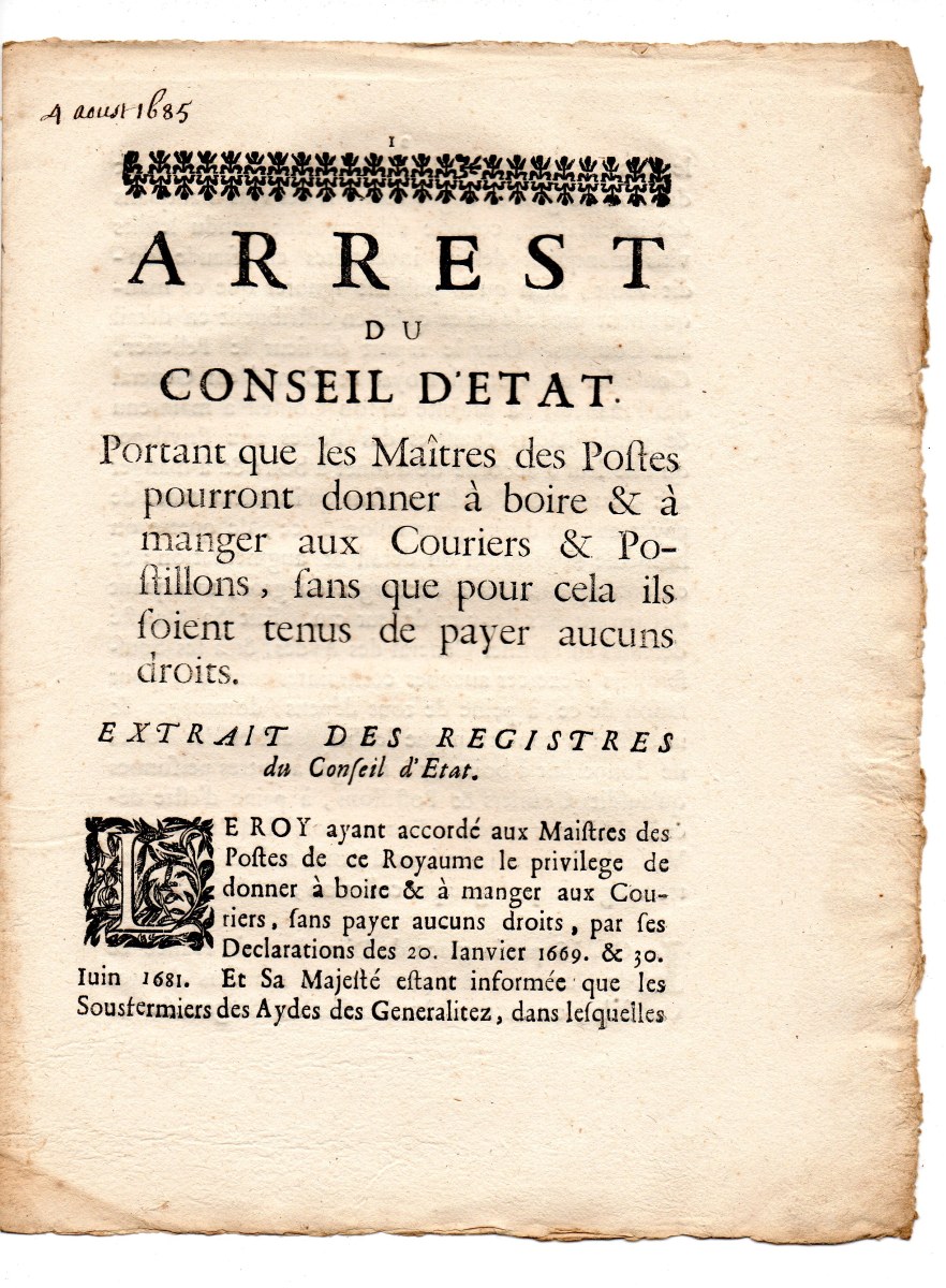 Edict du roy pour la creation en tiltre d'office d'un ou deux messagers ordinaires en chacun siege des bailliages, seneschaucees ou elections… du 5 aoust 1579. A Paris, par Federic Morel, 1580, 22-(1) pp., in-12 - Arrest du conseil d'estat en faveur des messagers du roy, pour la fonction de leurs charges. A Paris, par Antoine Estiene, P. Metayer & C. Prevost, 1623, 7 pp., in-12 - Déclaration du roy portant exemption en faveur des maistres des postes du royaume pour les tailles et autres subsides. A Paris, chez Jean Bessin, 1634, 10 pp., in-12 - Arrest du Grand conseil touchant les messagers, roulliers, & voicturiers… A Paris, chez Pierre Durand, 1635, 16 pp., in-12 - Déclaration du roy portant exemption de tailles aux maistres des postes. A Rouen, Laurens Maurry, 1650, 16 pp., in-8 - Edicts, lettres patentes, déclarations, ordonnances, commissions et arrests concernant les chevaux de louage. A Paris, chez Frederic Leonard, 1669, 34 pp., in-8 - Déclaration du roy sur le tarif des droits pour les ports de lettres, du 12 avril 1676. 7 pp, in-4 - Arrest du conseil d'état portant que les maîtres des postes pourront donner à boire & à manger aux couriers & postillons, sans que pour cela ils soient tenus de payer aucuns droits. 1685, 3 pp., in-4 - Edit du roy portant suppression des charges de surintendant général des postes & relais de France, & de frand maistre des couriers. A Paris, chez Estienne Michallet, 1692, 7 pp., in-4 - Déclaration du roy et tarif des droits qui doivent estre payez pour les ports de lettres. A Paris, chez la veuve François Muguet, 1703, 19 pp., in-4 - Sentence de monsieur le prevost de Paris en faveur des messagers portant qu'ils ne sont point responsables des vols qui leurs sont faits sur les grands chemins par force & violence. A Paris, chez la veuve Saugrain, 1713, 30 pp., in-4 - Poste de la ville de Paris, Avis au public. De Grangé, 1760, 16-4 pp., in-8 - Réponse des administrateurs généraux des postes au mémoire imprimé ayant pour titre : Observations pour le S. Billard, écuyer. L.F. Delatour, 1771, 64 pp., in-4 - Arrêt du conseil d'état du roi servant de règlement sur les diligences & messageries du royaume, du 23 janvier 1777. A Paris, de l'imprimerie royale, 1777, 6 pp., in-4 - L.A.S. écrite de Paris et datée du 19 juillet 1787 signée " Dartis ", 1 p., in-8, accompagnée d'un mémoire manuscrit intitulé " Mémoire contenant demandes pour les Srs Devouges de Chanteclair anciens fermiers des diligences de Lyon ", 33 pp., in-fol. - etc.