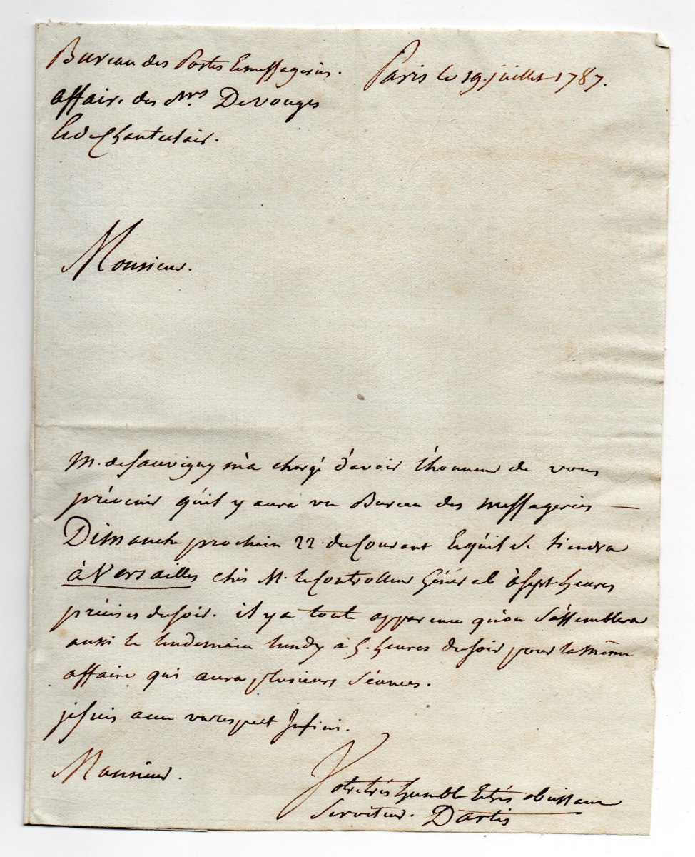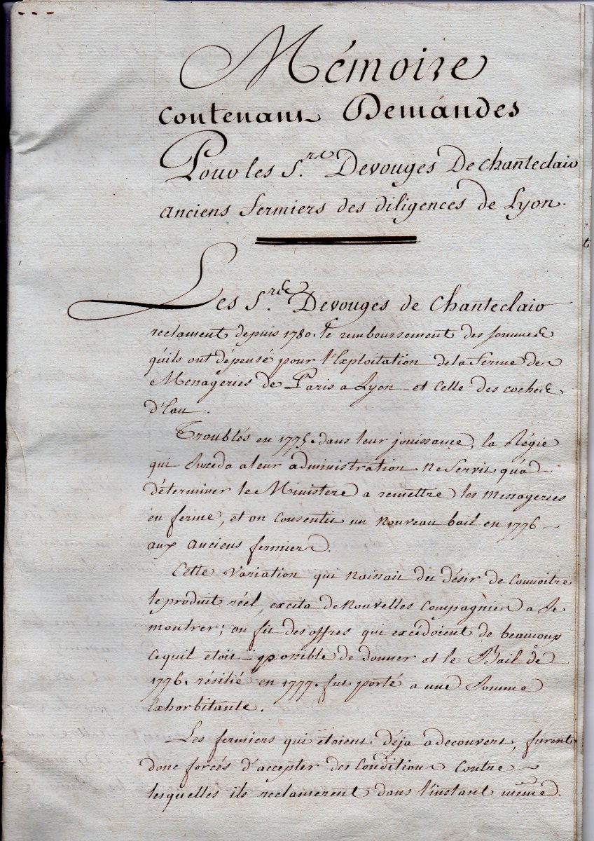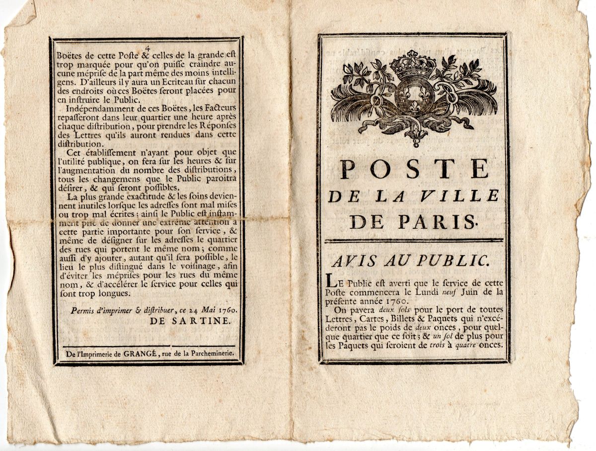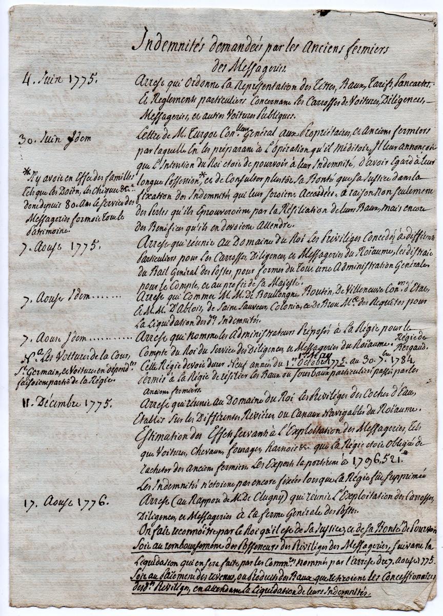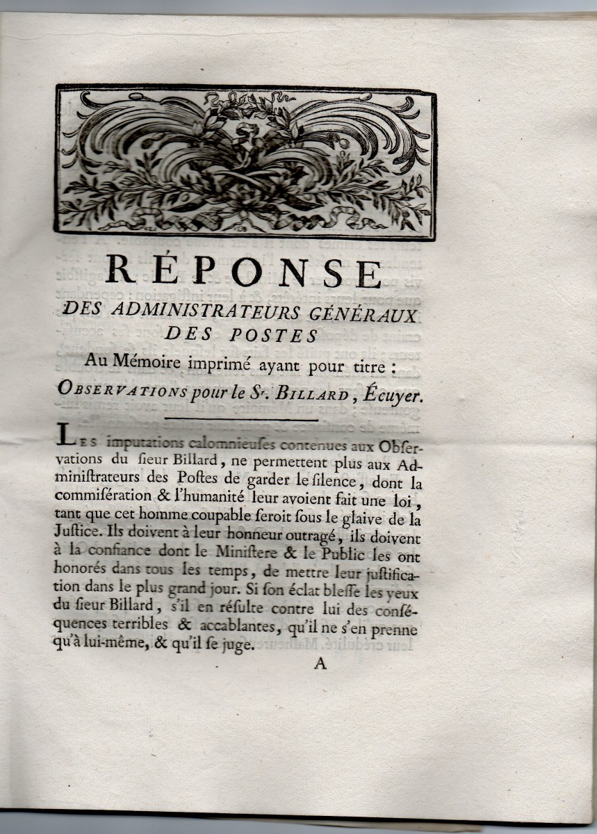 Edict du roy pour la creation en tiltre d'office d'un ou deux messagers ordinaires en chacun siege des bailliages, seneschaucees ou elections… du 5 aoust 1579. A Paris, par Federic Morel, 1580, 22-(1) pp., in-12 - Arrest du conseil d'estat en faveur des messagers du roy, pour la fonction de leurs charges. A Paris, par Antoine Estiene, P. Metayer & C. Prevost, 1623, 7 pp., in-12 - Déclaration du roy portant exemption en faveur des maistres des postes du royaume pour les tailles et autres subsides. A Paris, chez Jean Bessin, 1634, 10 pp., in-12 - Arrest du Grand conseil touchant les messagers, roulliers, & voicturiers… A Paris, chez Pierre Durand, 1635, 16 pp., in-12 - Déclaration du roy portant exemption de tailles aux maistres des postes. A Rouen, Laurens Maurry, 1650, 16 pp., in-8 - Edicts, lettres patentes, déclarations, ordonnances, commissions et arrests concernant les chevaux de louage. A Paris, chez Frederic Leonard, 1669, 34 pp., in-8 - Déclaration du roy sur le tarif des droits pour les ports de lettres, du 12 avril 1676. 7 pp, in-4 - Arrest du conseil d'état portant que les maîtres des postes pourront donner à boire & à manger aux couriers & postillons, sans que pour cela ils soient tenus de payer aucuns droits. 1685, 3 pp., in-4 - Edit du roy portant suppression des charges de surintendant général des postes & relais de France, & de frand maistre des couriers. A Paris, chez Estienne Michallet, 1692, 7 pp., in-4 - Déclaration du roy et tarif des droits qui doivent estre payez pour les ports de lettres. A Paris, chez la veuve François Muguet, 1703, 19 pp., in-4 - Sentence de monsieur le prevost de Paris en faveur des messagers portant qu'ils ne sont point responsables des vols qui leurs sont faits sur les grands chemins par force & violence. A Paris, chez la veuve Saugrain, 1713, 30 pp., in-4 - Poste de la ville de Paris, Avis au public. De Grangé, 1760, 16-4 pp., in-8 - Réponse des administrateurs généraux des postes au mémoire imprimé ayant pour titre : Observations pour le S. Billard, écuyer. L.F. Delatour, 1771, 64 pp., in-4 - Arrêt du conseil d'état du roi servant de règlement sur les diligences & messageries du royaume, du 23 janvier 1777. A Paris, de l'imprimerie royale, 1777, 6 pp., in-4 - L.A.S. écrite de Paris et datée du 19 juillet 1787 signée " Dartis ", 1 p., in-8, accompagnée d'un mémoire manuscrit intitulé " Mémoire contenant demandes pour les Srs Devouges de Chanteclair anciens fermiers des diligences de Lyon ", 33 pp., in-fol. - etc.
