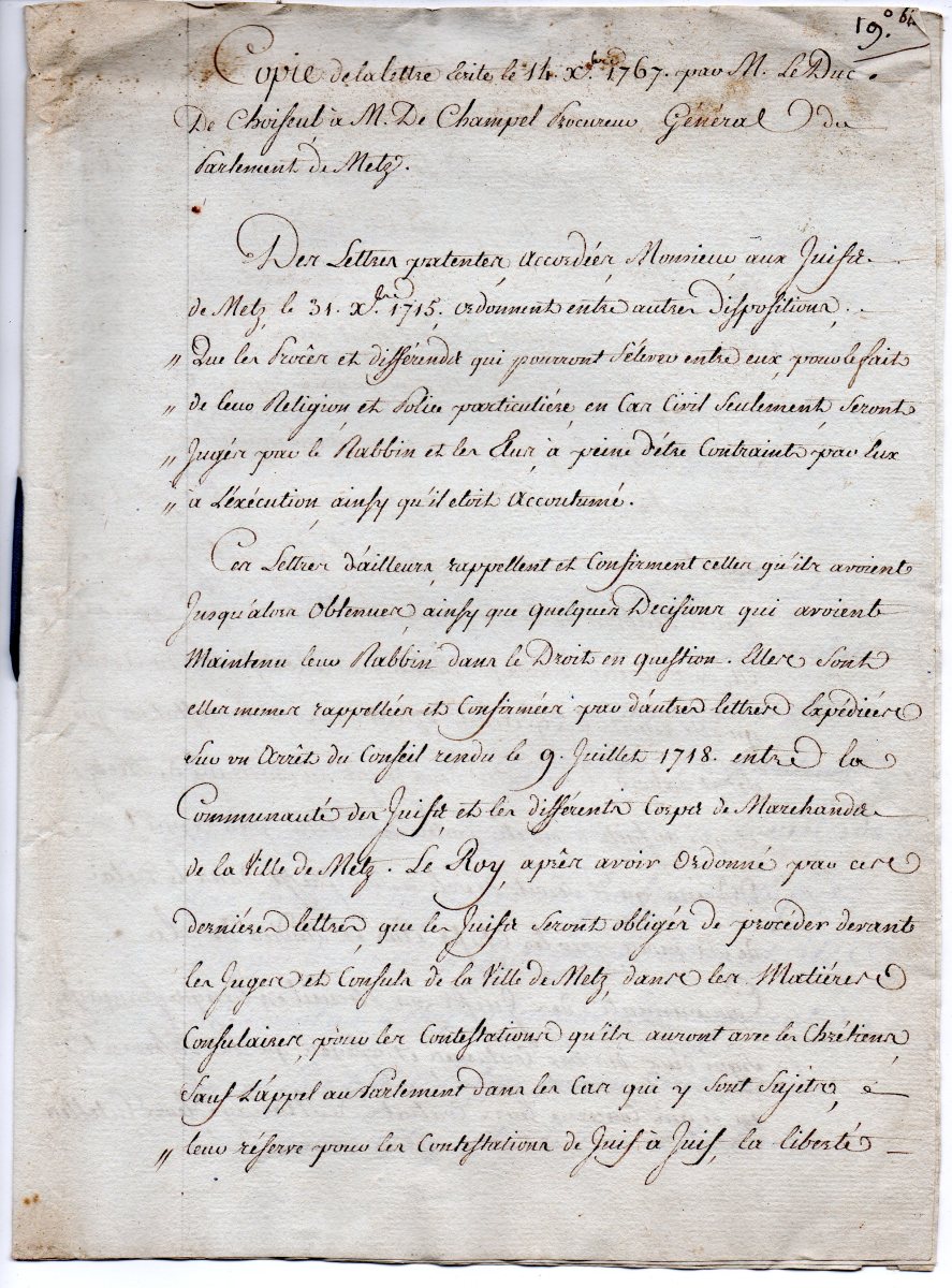 L.S. écrite de Paris et datée du 11 avril 1767, signée " D'Ormesson ", 2 pp., in-fol. ; accompagnée d'un mémoire manuscrit ayant pour sujet " l'usure excessive que les Juifs exercent en Lorraine ", 4 pp., in-8 - Copie manuscrite " de la lettre écrite le 14 xbre 1767 par M. le duc de Choiseul à M. de Champel procureur général du parlement de Metz ", 6 pp., in-4 - Mémoire pour les syndics élus de la communauté des Juifs de la ville de Metz, contre les juifs soi-disant quatre communautés de Phalsbourg, & des villages de Mittelbronne, Immelin & Bourcheid
