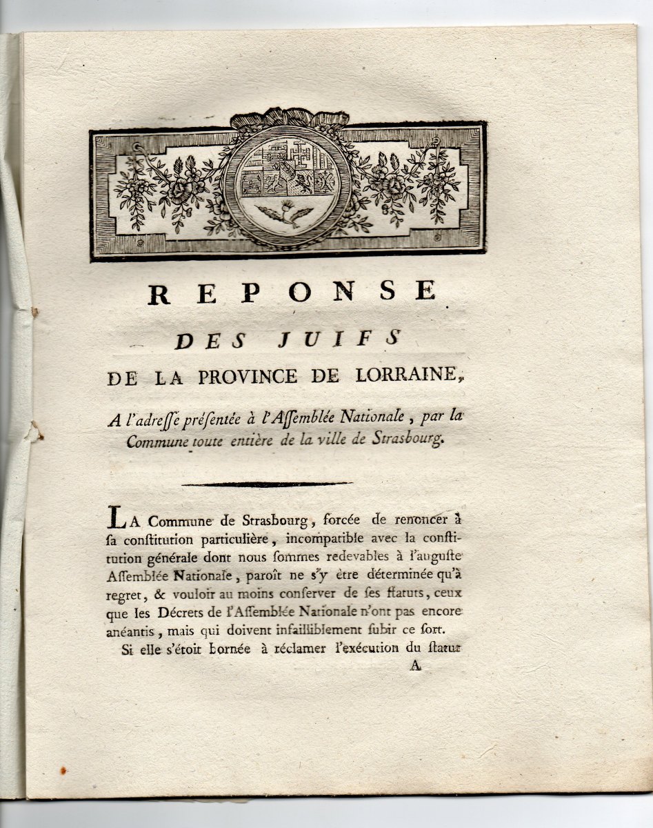 A Paris, chez P.G. Simon, 1778, 48 pp., in-4 - Mémoire contre les juifs. A Paris, L. Cellot, 1777, 43 pp., in-4 - Edit du roi portant exemption des droits de péage corporels sur les juifs. A Colmar, Jean-Henri Decker, 1784, 4 pp., in-4 - Précis pour le sieur Cerf-Berr, directeur général des fourrages militaires & conseiller de commerce de plusieurs cours d'Allemagne contre les préteurs, consuls & magistrats de la ville de Strasbourg. L. Cellot, 1787, 16 pp., in-4 - Très humble et très respectueuse adresse que présente à l'Assemblée nationale la commune, toute entière, de la ville de Strasbourg [au sujet des juifs d'Alsace]. A Strasbourg, Levrault, 14 pp., in-4 - Réponse des juifs de la province de Lorraine à l'adresse présentée à l'Assemblée nationale, par la commune toute entière de la ville de Strasbourg. 1789, 24 pp., in-8 - Lettres patentes du roi portant que les juifs connus en France sous le nom de juifs portugais, espagnols & avignonois, y jouiront des droits de citoyen actif. A Paris, de l'imprimerie royale, 1790, 2 pp., in-4 - Lettres patentes du roi portant suppression des droits d'habitation, de protection, de tolérance & de redevances semblables sur les juifs. A Paris, de l'imprimerie royale, 1790, 3 pp., in-4 - Proclamation du roi sur un décret de l'assemblée nationale concernant les juifs. A Paris, de l'imprimerie royale, 1790, 2 pp., in-4.
