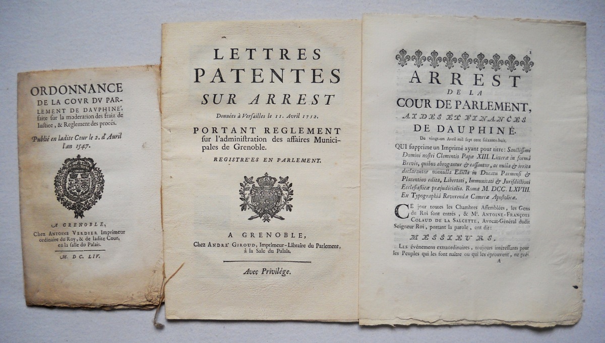1689, 6 pp., in-8 - Edit du roy portant confirmation de la chambre des comptes de Dole. A Paris, chez Estienne Michallet, 1692, 14 pp., in-8 - Edit du roy portant creation de la chancellerie de Besançon. A Paris, chez Estienne Michallet, 1692, 8 pp., in-8 - Edit du roy qui regle les sommes qui seront payées par les états de Bourgogne pour estre confirmez dans leurs privileges. A Paris, chez Louis Denis de la Tour, 1727, 7 pp., in-4 - Lettres patentes sur arrest portant reglement sur l'administration des affaires municipales de Grenoble. A Grenoble, chez André Giroud, 1752, 18 pp., in-8 - Mémoire signifié pour M. l'archevêque de Lyon contre M. l'évêque d'Autun. P.G. Le Mercier, 1766, 149-10 et XIV pp. de table des sommaires, in-4 ; suivi de Au roy et à nosseigneurs de son conseil. Veuve d'Houry, 1766, 28-16 pp., in-fol. - Arrest du conseil d'état du roi qui casse & annulle les arrêts & arrêté du parlement de Grenoble des 21, 22 & 23 août 1769, 8 septembre 1769. A Grenoble, veuve Faure & fils, 1769, 41 x 52 cm - Arrêt du conseil d'état du roi concernant les coiffeurs de femmes de la ville de Lyon, 12 juin 1780. A Paris, de l'imprimerie royale, 1780, 4 pp., in-4 - Arrest du conseil d'estat qui casse & annulle une délibération des élus généraux des Etats de Bourgogne, 2 août 1776. A Paris, de l'imprimerie royale, 1776, 2 pp., in-4 - Edit du roi et lettres de jussion sur icelui concernant la réunion de la principauté de Dombes au pays de Bresse, 6 mars 1782. A Paris, de l'imprimerie royale, 1782, 6 pp., in-4 - Recueil des titres concernant les droits et privilèges de la ville de Strasbourg, relativement à son commerce. A Strasbourg, Levrault, 1783, 81 pp., in-4 - Lettres patentes du roi qui (
